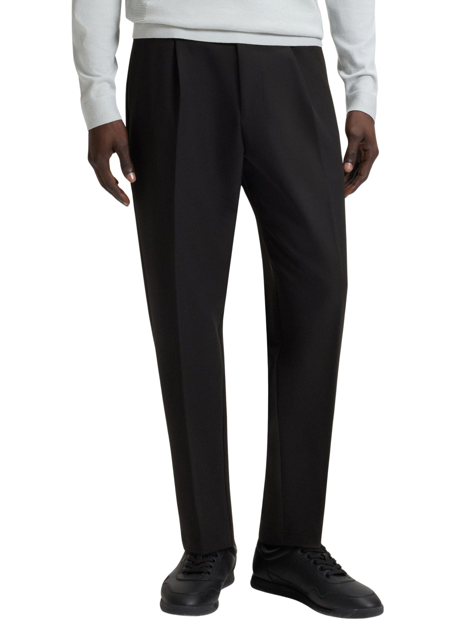 Pantaloni neri BOSS Uomo realizzati in tessuto elasticizzato in quattro direzioni per garantire massimo comfort e una finitura facile da stirare. Presentano moderne pieghe frontali e vita semi-elasticizzata.