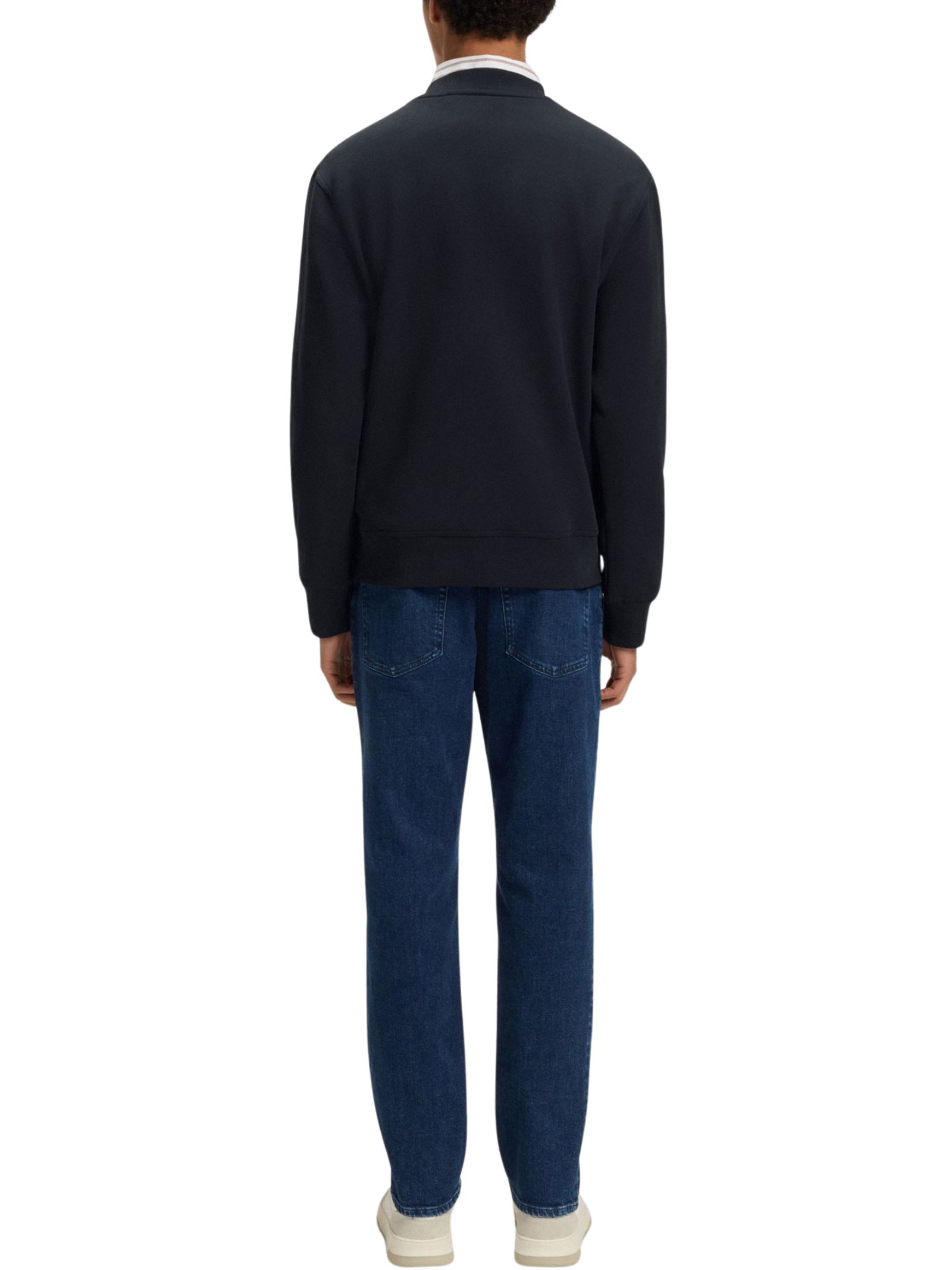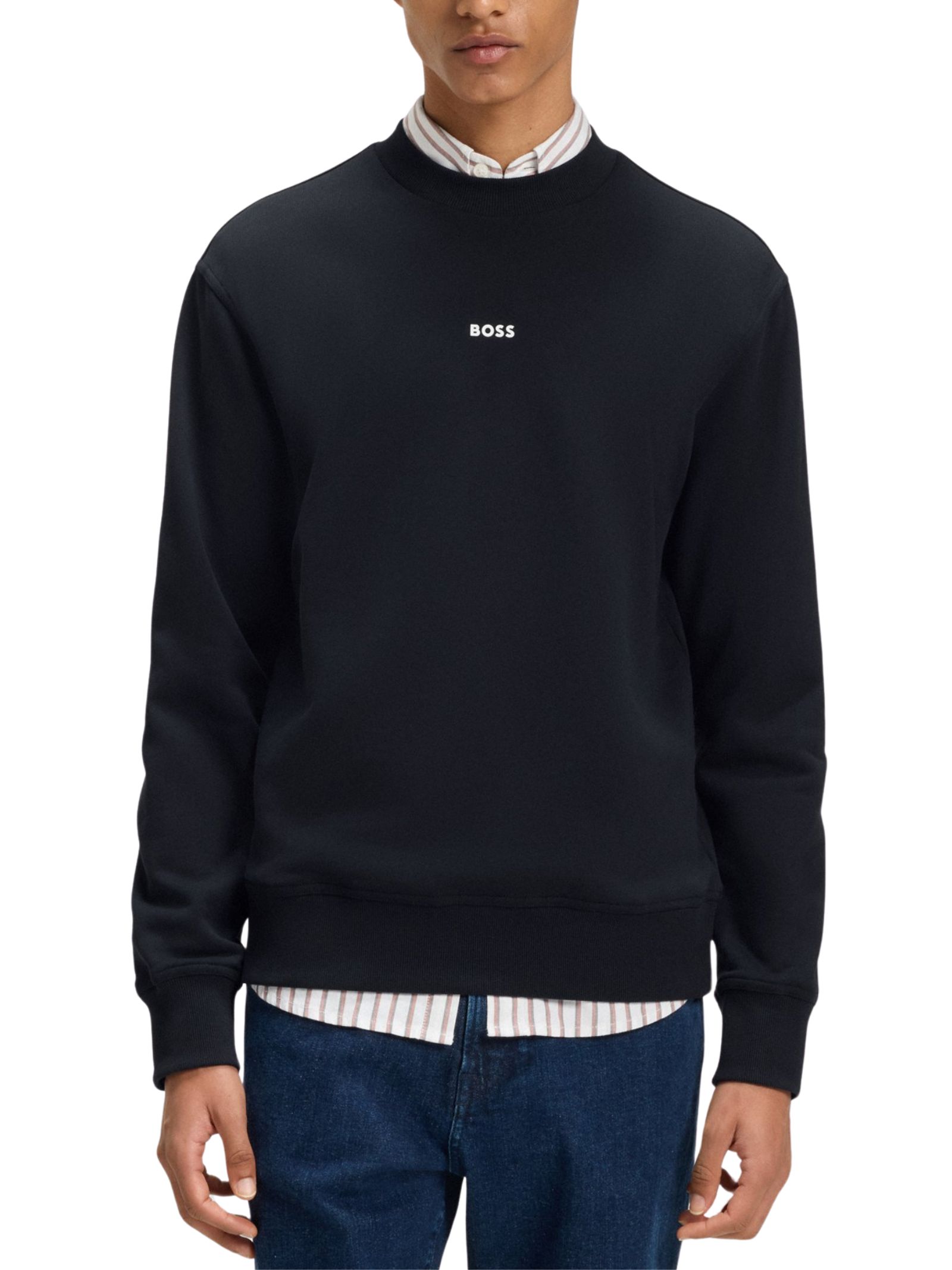 Felpa BOSS Uomo in morbido pile di french terry con logo discreto stampato sul petto, caratterizzata da taglio comodo, girocollo classico, maniche lunghe e polsini a costine per un comfort quotidiano.