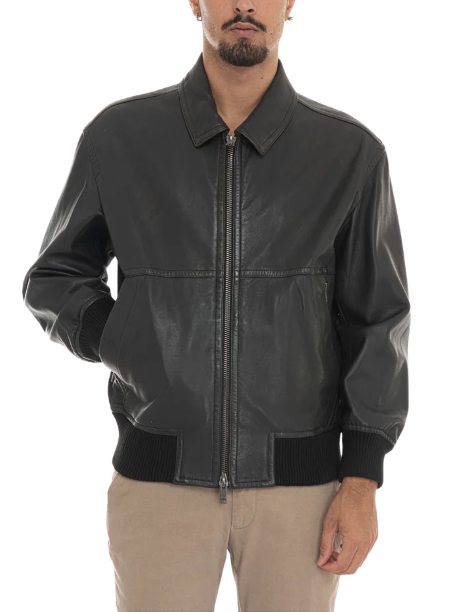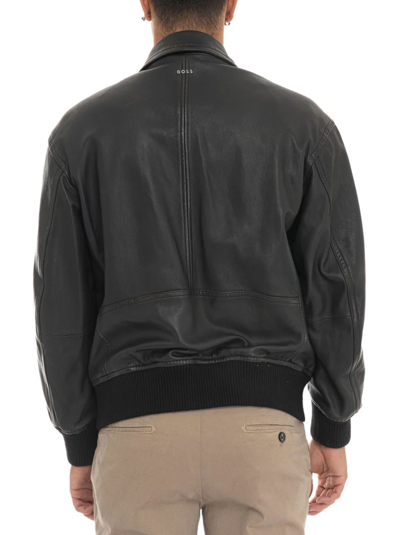 Giubbino bomber marrone BOSS modello Joberg, realizzato in pelle liscia con chiusura a zip con doppio cursore, tasca interna, tasche laterali e polsini e fondo in maglia inglese. Composizione: 100% pelle.