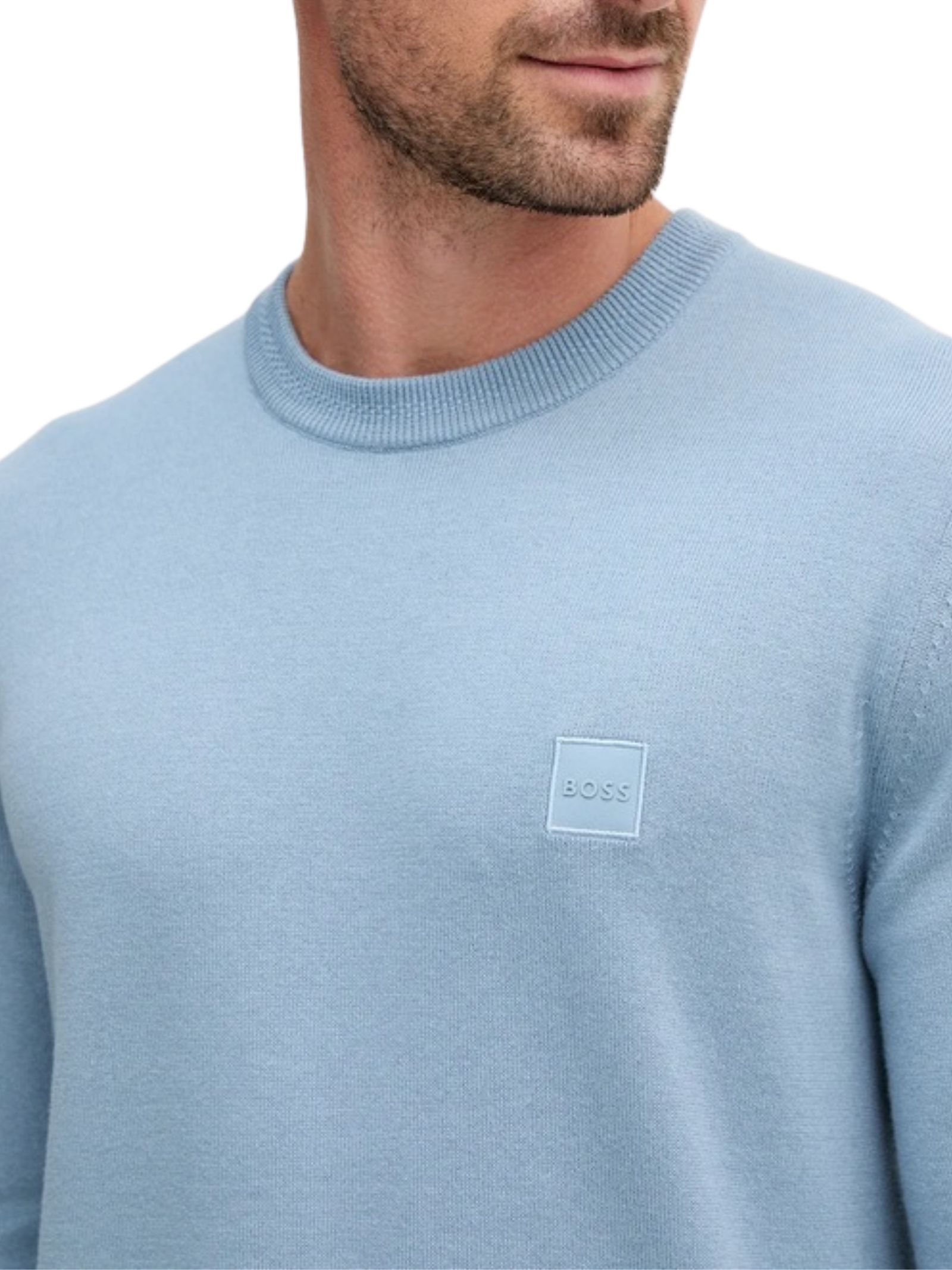 Maglione celeste BOSS Menswear in morbida maglia di cotone e cashmere, per un comfort lussuoso nella vita quotidiana, con girocollo, maniche lunghe, polsini a coste e vestibilità regolare; lunghezza standard. Composizione: 95% cotone, 5% cashmere.