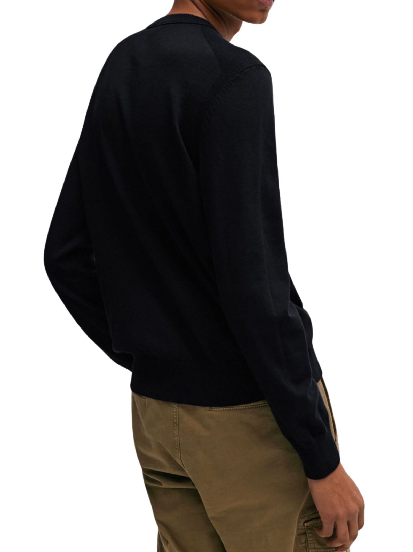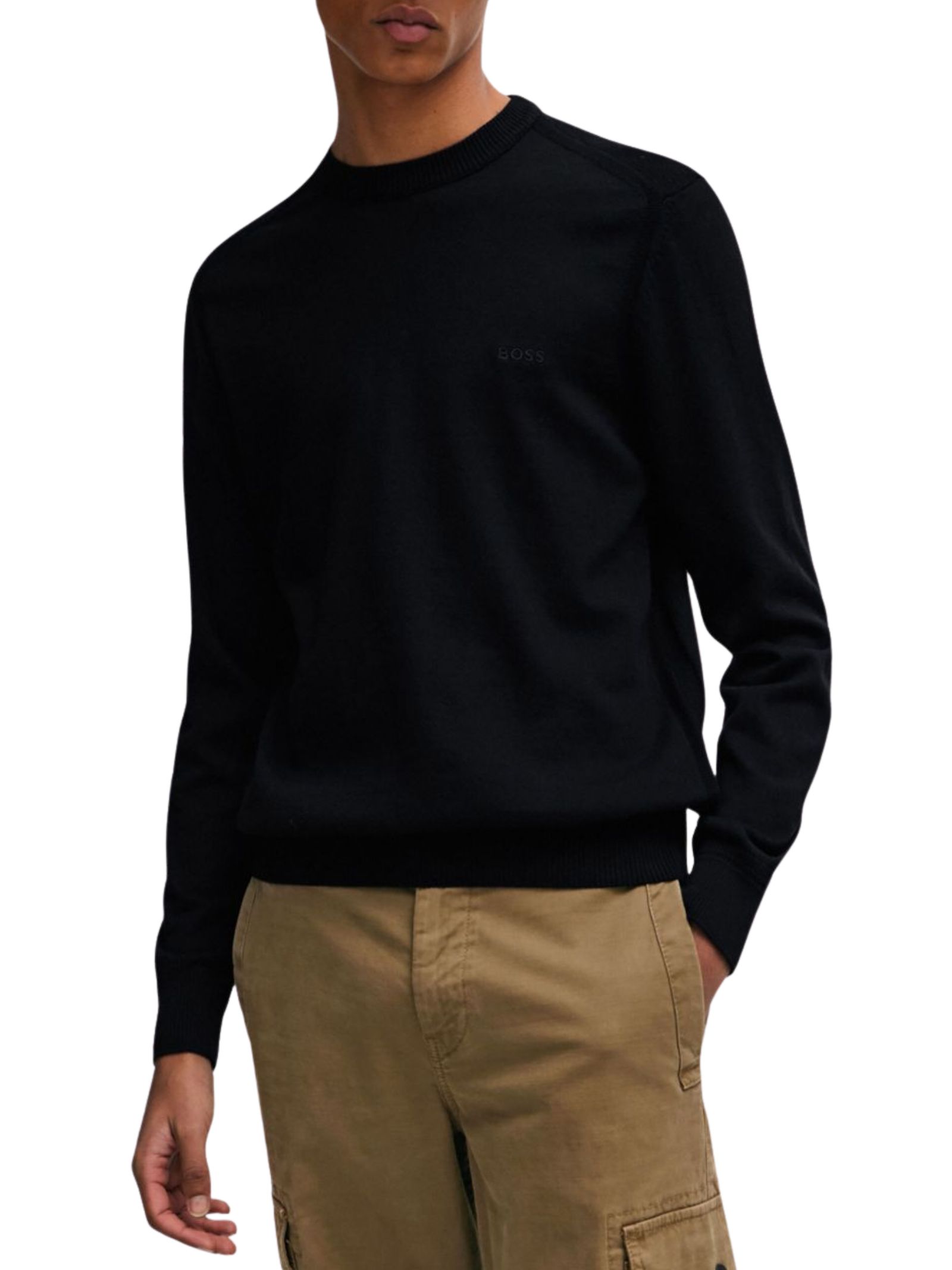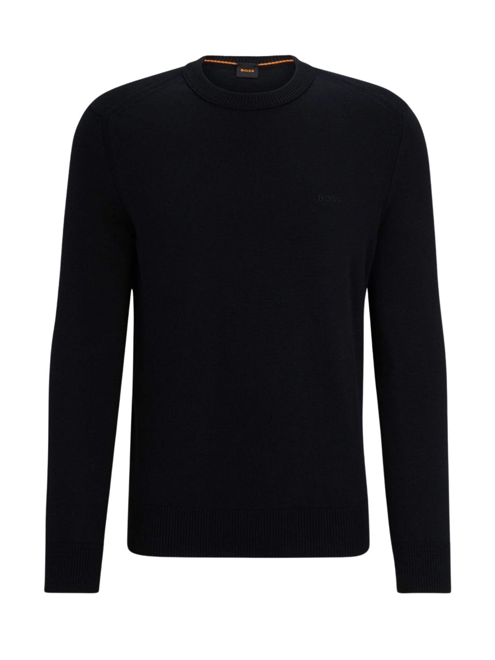 Maglia Boss realizzata in morbido jersey di cotone, impreziosita da logo ricamato sul petto, girocollo classico, maniche lunghe e finiture a costine; composizione 85% cotone e 15% lana kapok.