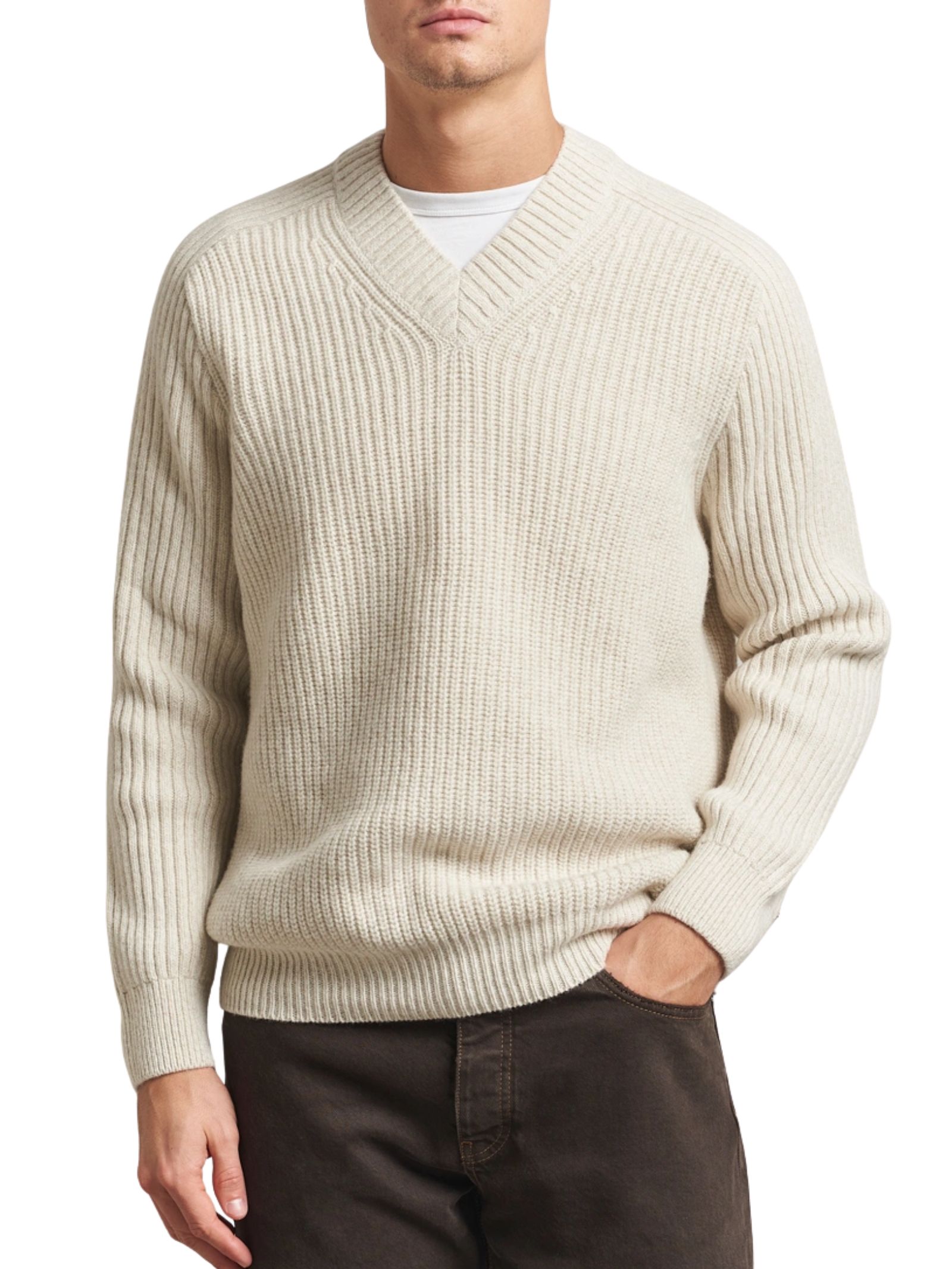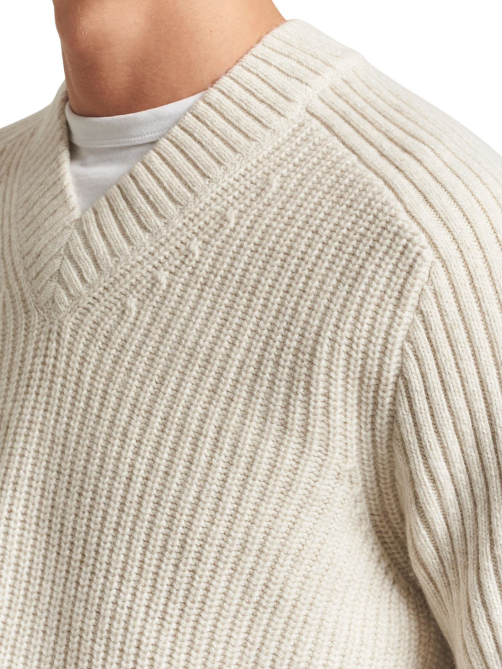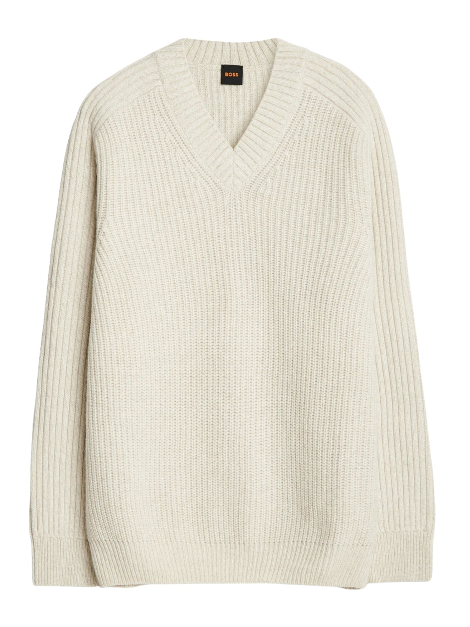 Maglione con scollo a V, realizzato in 40% lana riciclata, 40% lana vergine e 20% poliammide riciclata. Presenta polsini, colletto e orlo in maglia a coste e un patch con logo nella cucitura laterale.