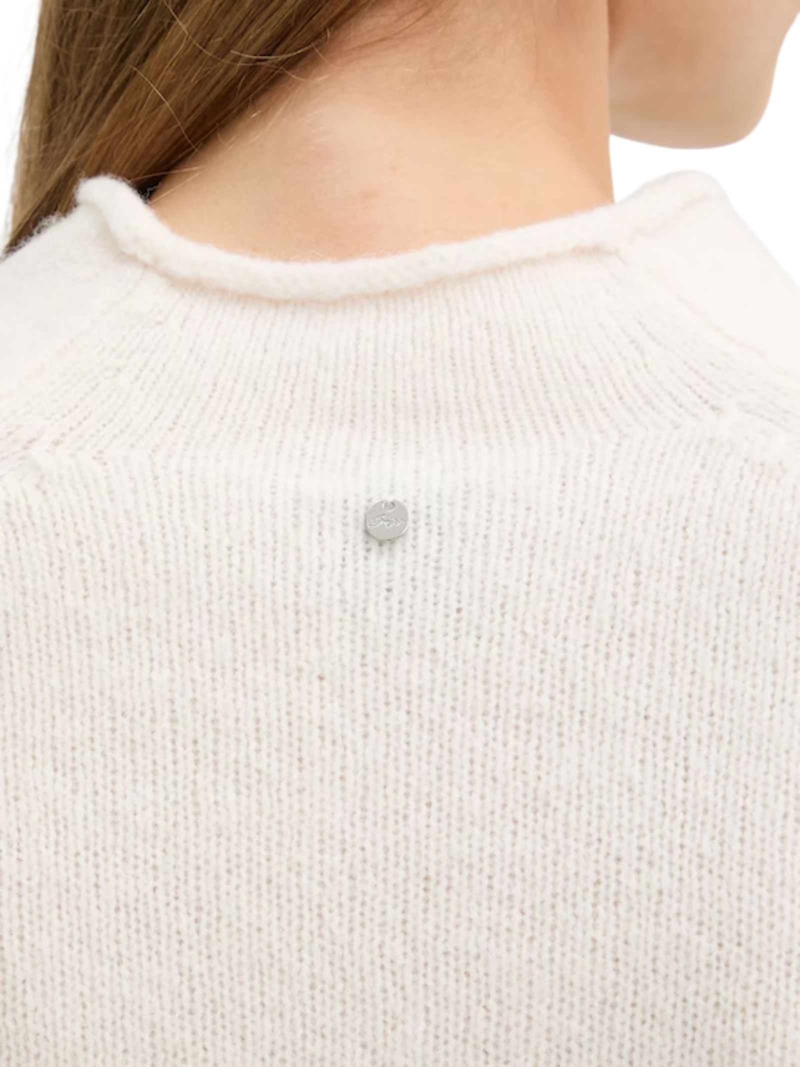 Maglione bianco BOSS Donna in misto lana con morbido alpaca è perfetto per un inverno allinsegna del comfort. Ciondolo con logo in metallo. Polsini e colletto arrotolati.Materiale: 52% Lana, 26% Poliammide, 22% Alpaca