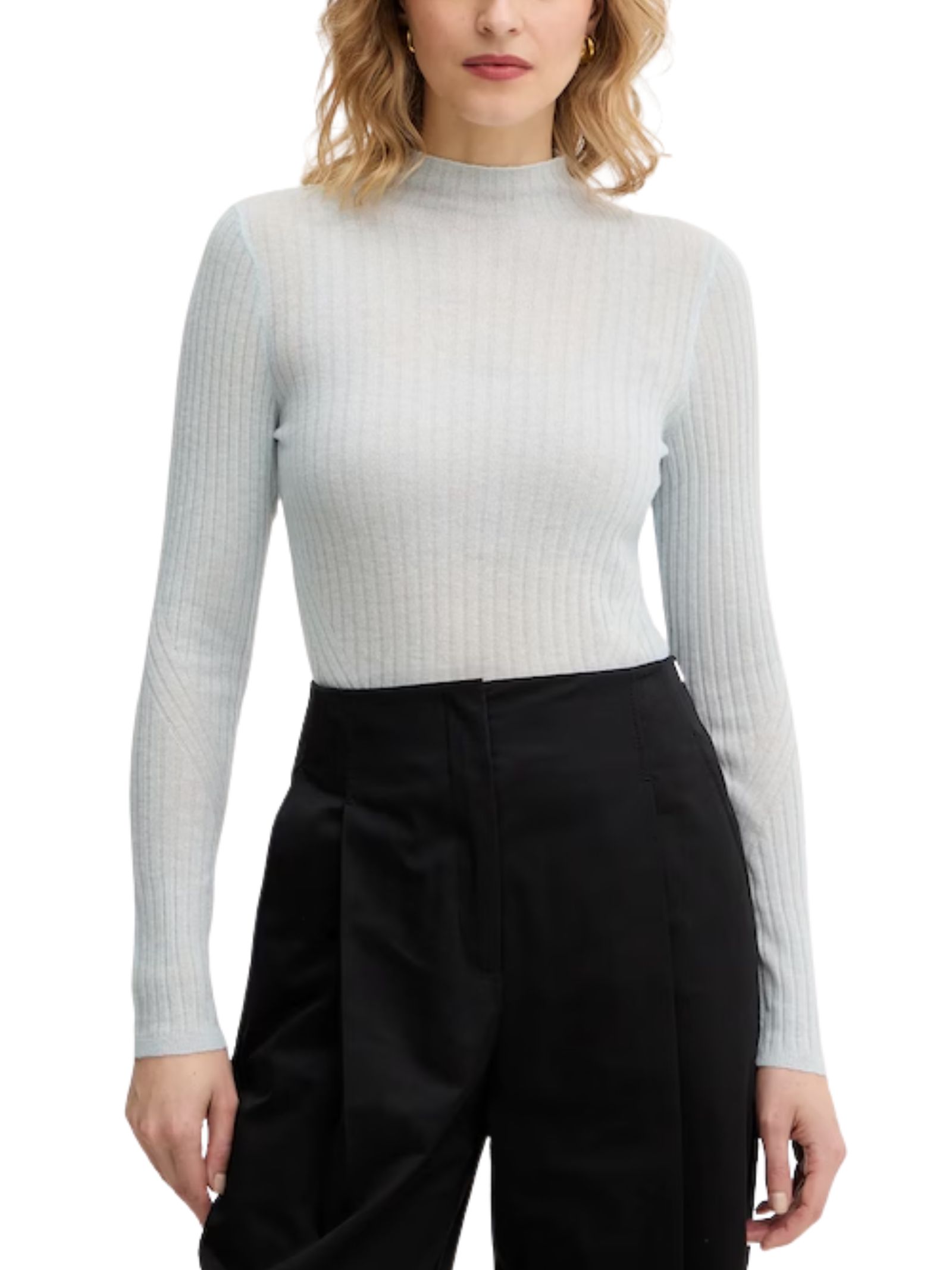 Maglione celeste BOSS dal taglio aderente che assicura libertà di movimento, colletto alto, maniche lunghe e aderenti e tessuto elasticizzato a maglia fine. Realizzato in 56% lana vergine e 44% poliammide.
