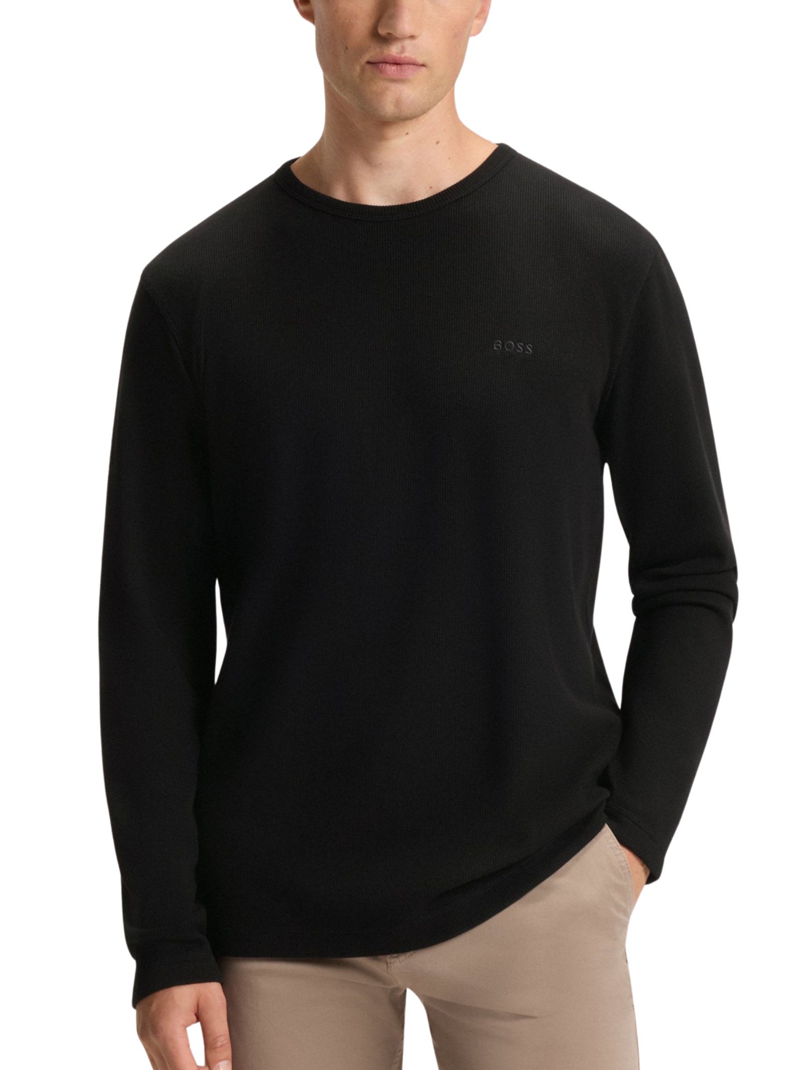 T-shirt BOSS Uomo regular fit in tessuto elasticizzato a nido dape con alta percentuale di cotone, girocollo, maniche lunghe e elegante logo ricamato. Materiale: 82% cotone, 12% poliammide, 6% elastan.