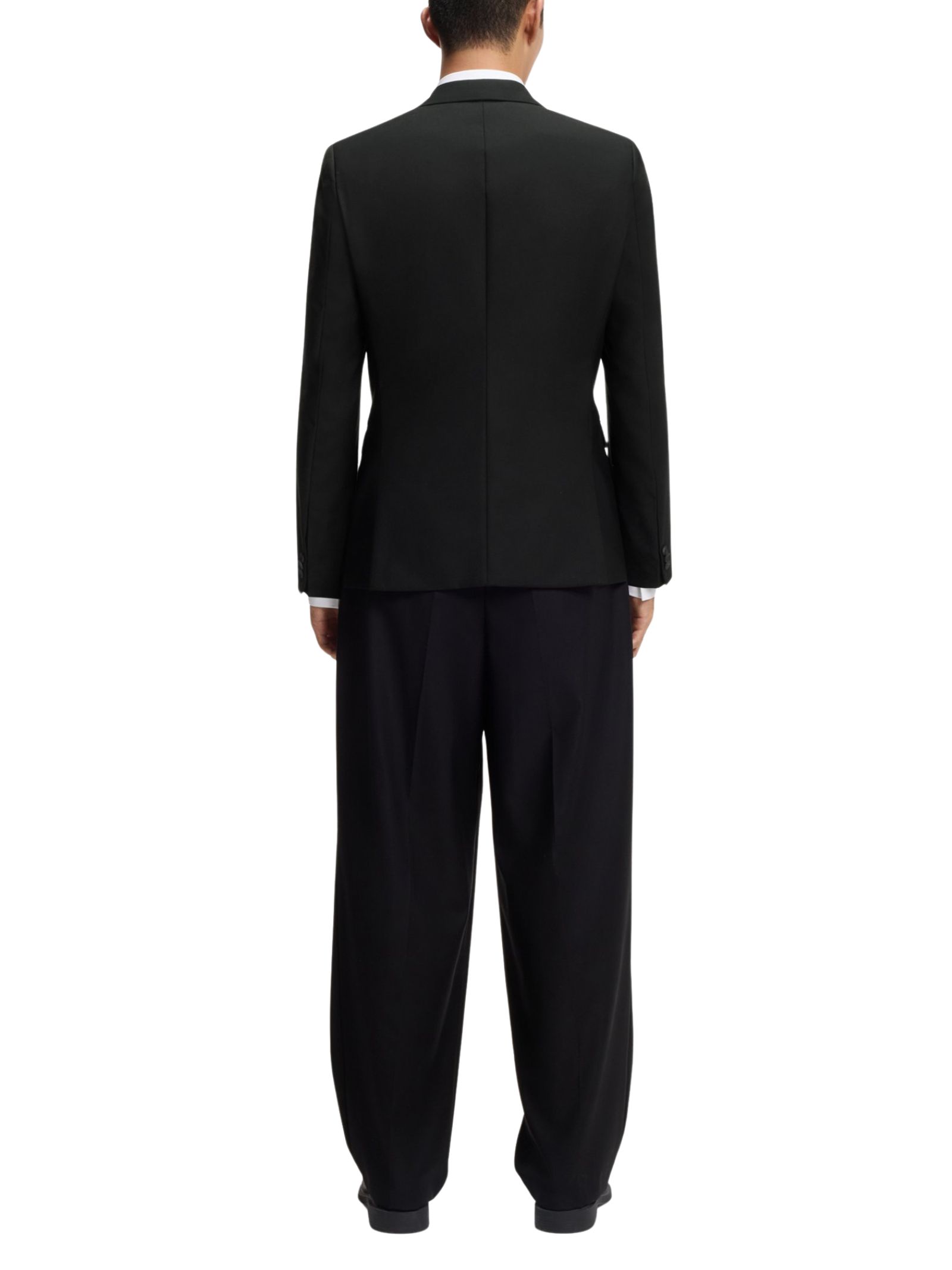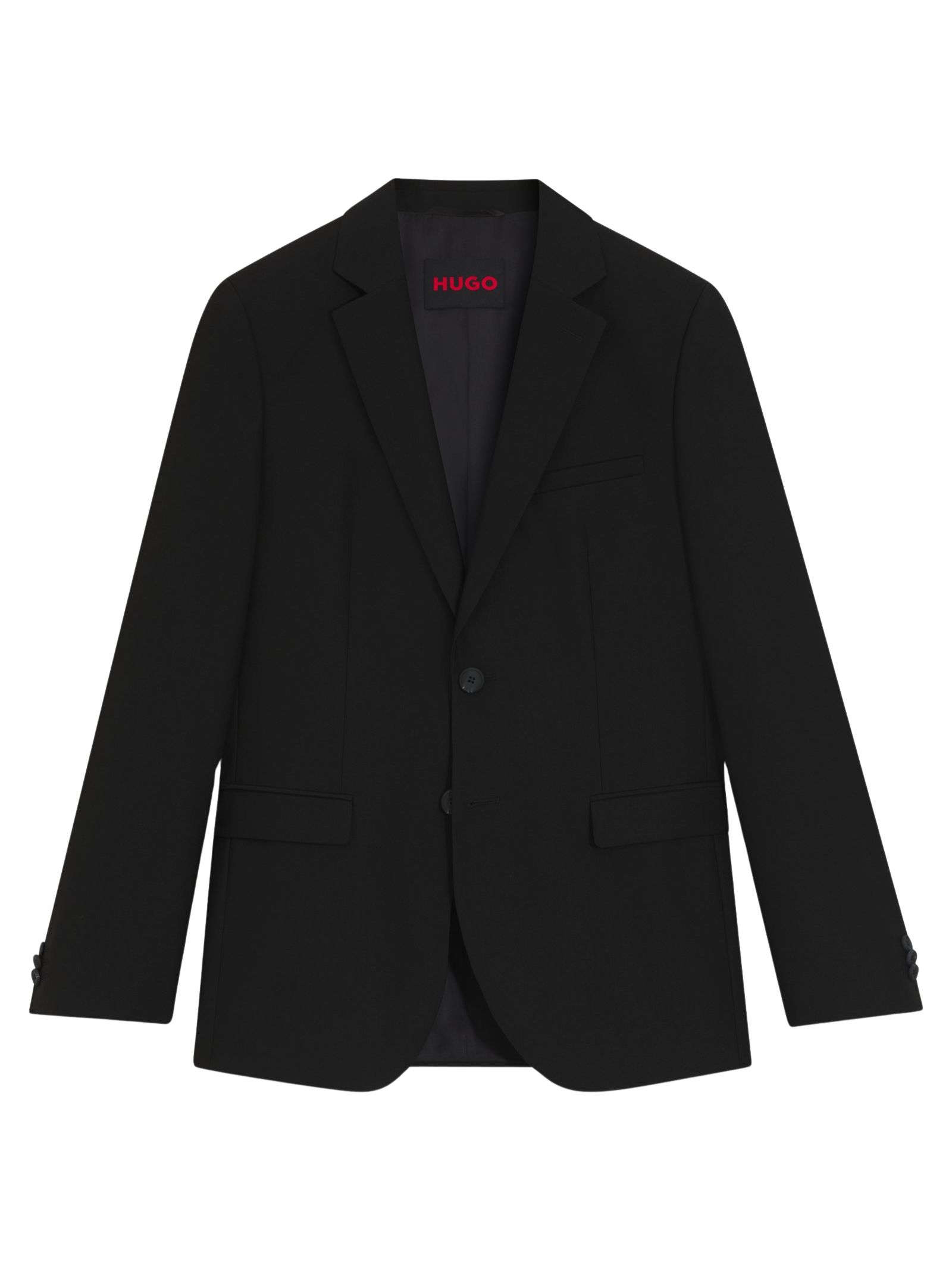 Blazer in twill nero con alto contenuto di lana, caratterizzata da un taglio extra slim dal profilo pulito, revers a lancia, chiusura a due bottoni, tasche con patta e tasche interne a filetto, sfiato laterale e fodera completa; stile moderno tipico di HUGO Menswear.