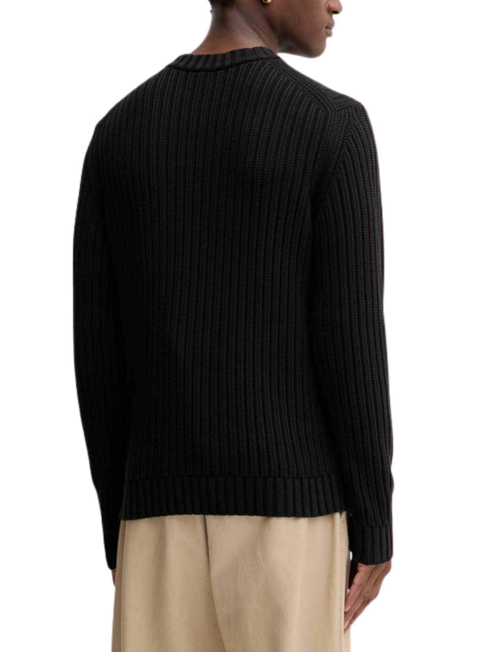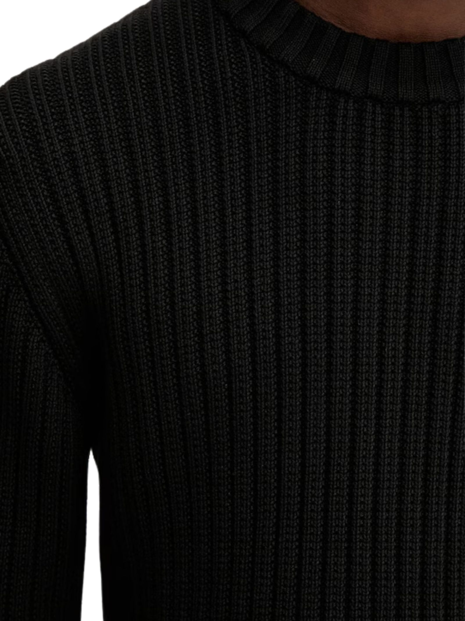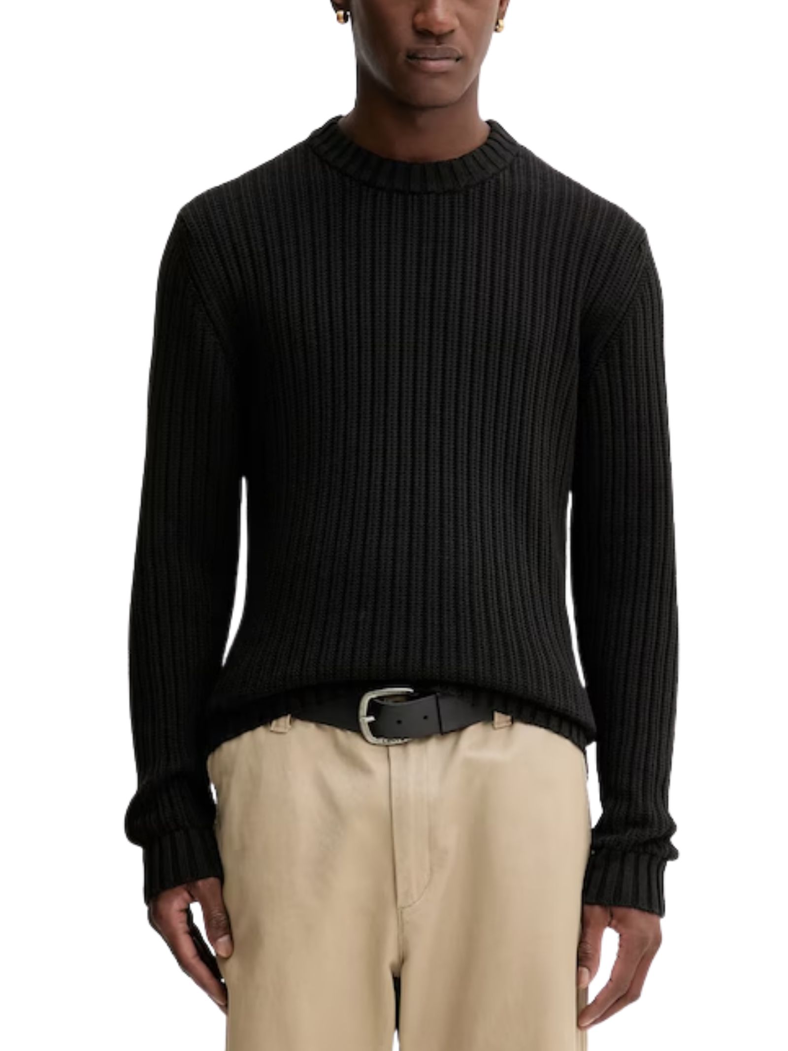 Maglione nero HUGO realizzato in cotone elastico, morbido e traspirante, senza motivo, con taglio largo per piena libertà di movimento. Presenta scollatura rotonda a coste, maniche lunghe, spalle abbassate e polsini tagliati, oltre a polsini e orlo a coste per maggiore protezione; maglia elastica di medio spessore. Composizione: 100% cotone.