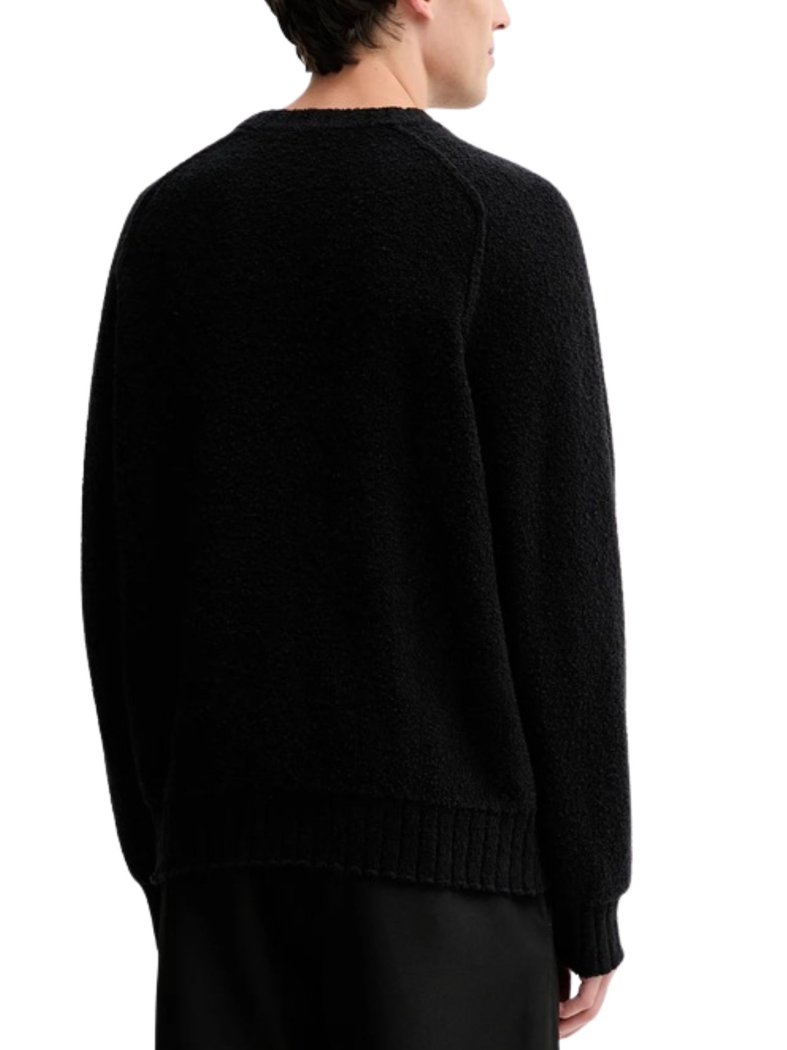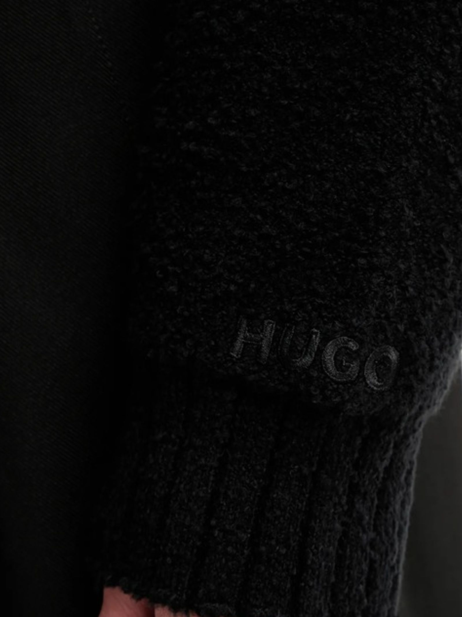 Maglione nero HUGO in tessuto elastico, confortevole e traspirante, realizzato con alta percentuale di cotone. Presenta taglio largo per piena libertà di movimento, scollatura rotonda a coste, maniche raglan per maggiore comfort, e polsini e orlo a coste per protezione; maglia elastica di medio spessore. Composizione: 68% cotone, 32% poliammide.