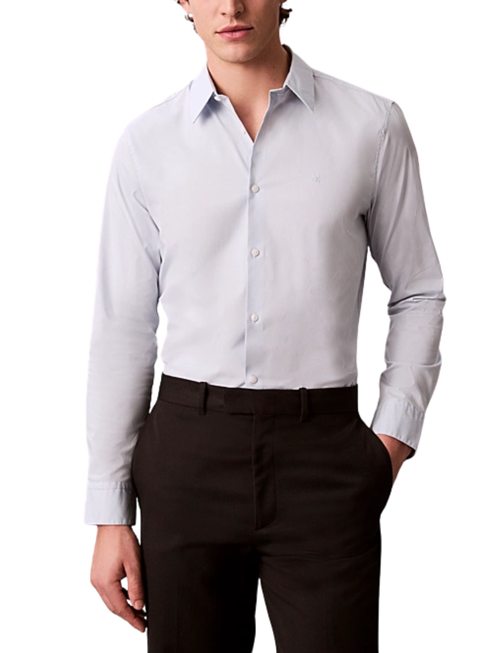 Camicia Calvin Klein in popeline di cotone elasticizzato con collo a punta, maniche lunghe, cannoncino con bottoni e fondo arrotondato. Presenta monogramma Calvin Klein ricamato sul petto. Vestibilità slim. Composizione: 96% cotone, 4% elastan.