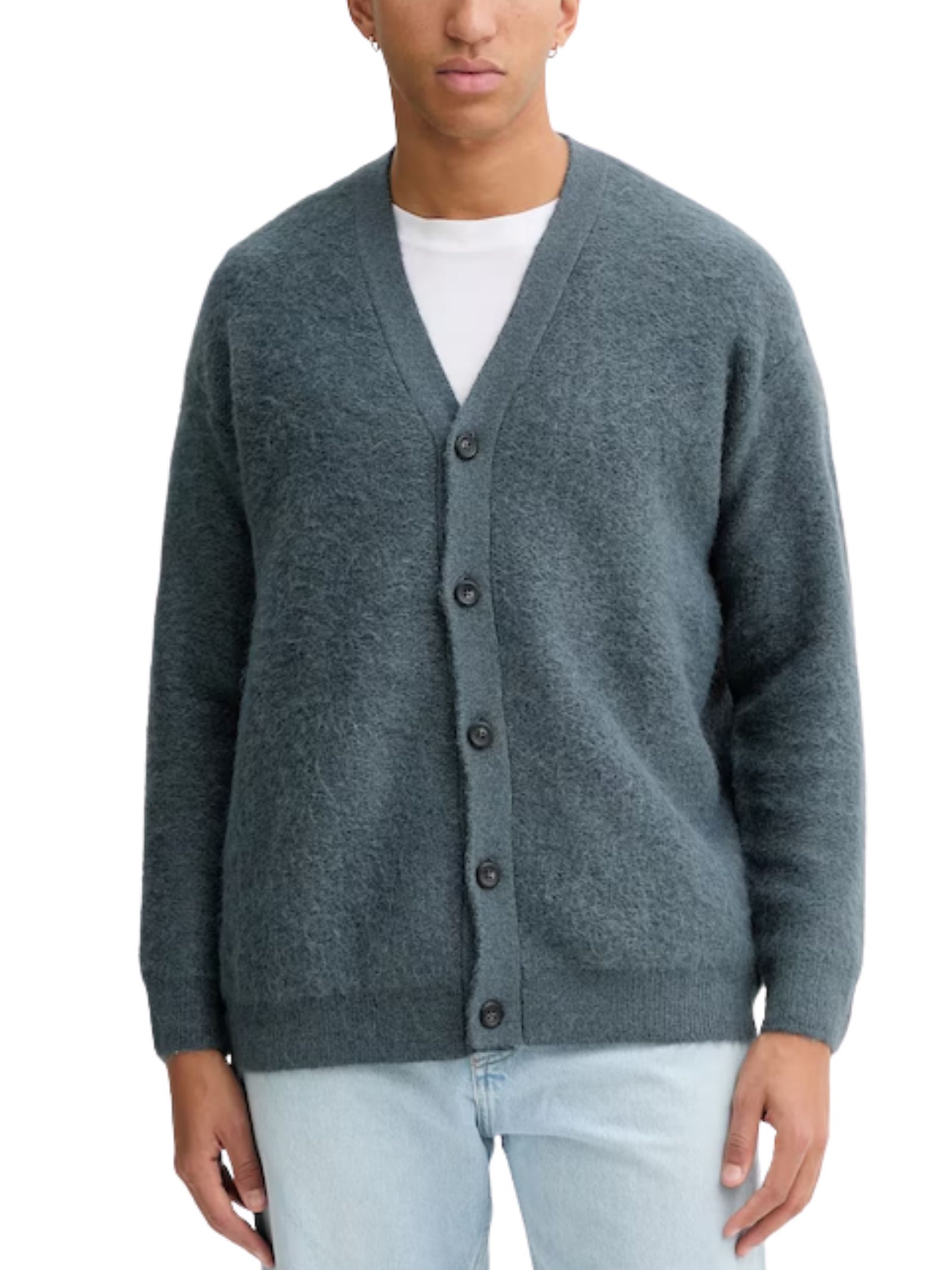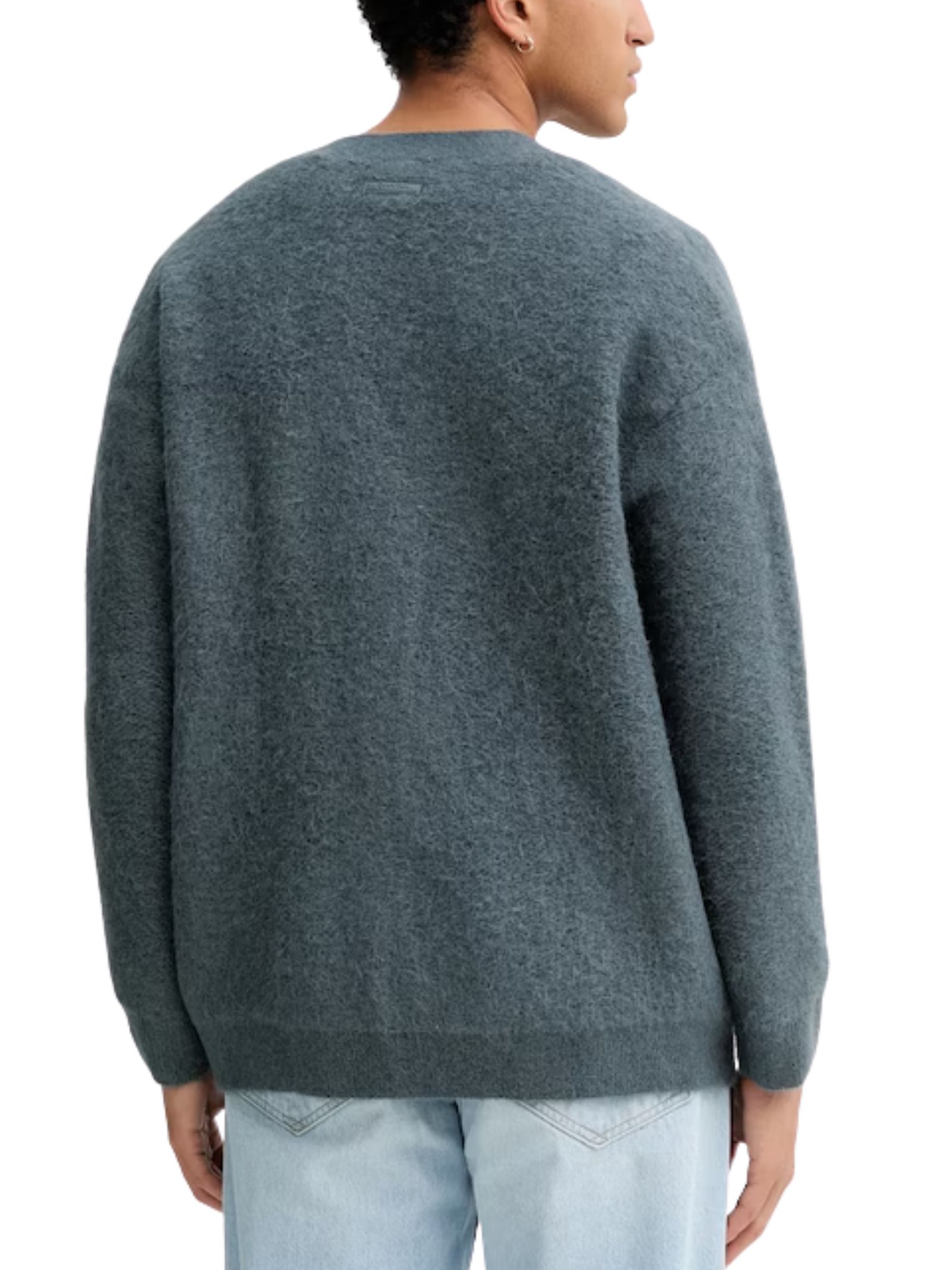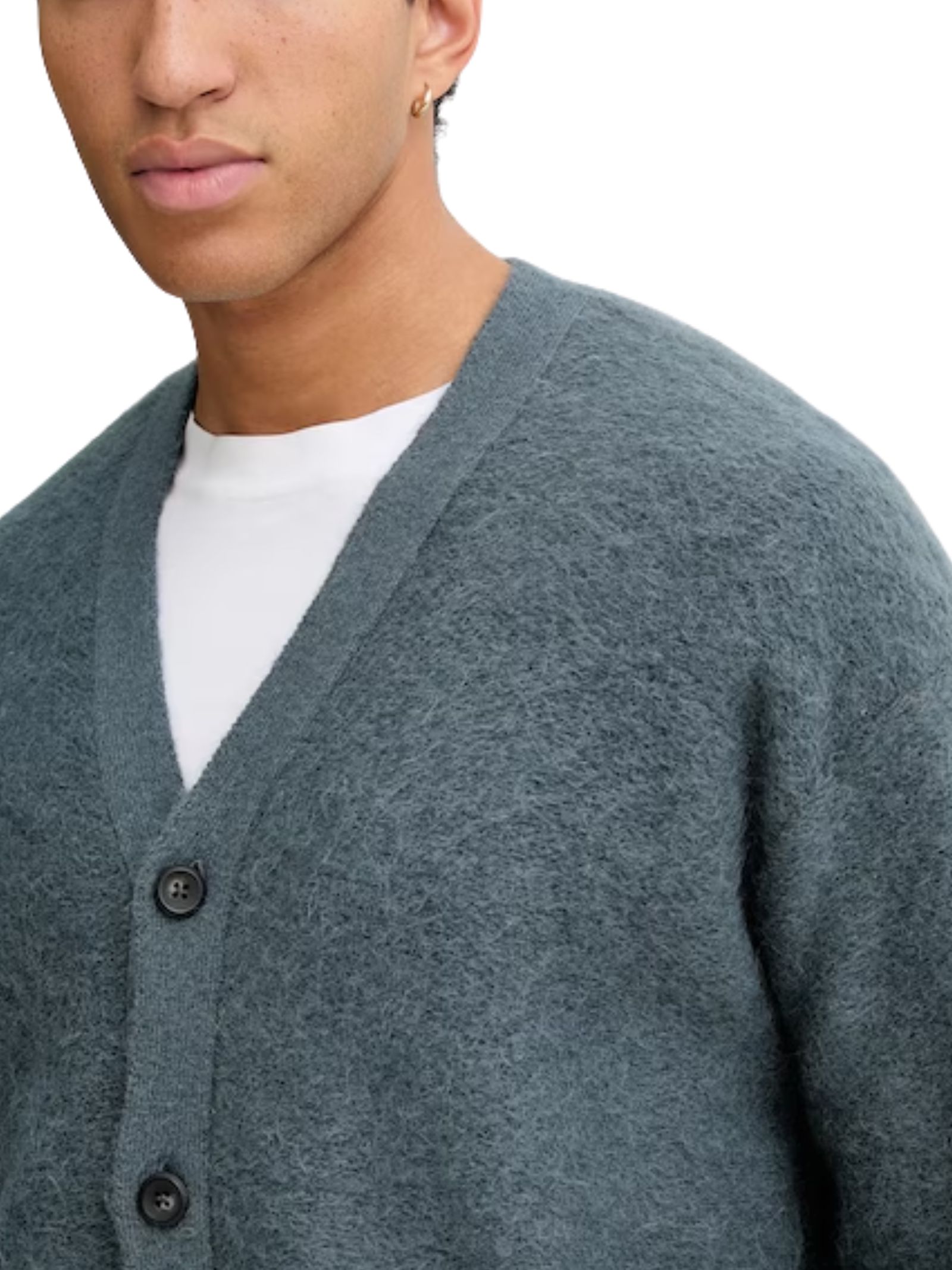 Cardigan grigio bluastro con scollo a V, maniche lunghe, chiusura con bottoni, logo applicato sul retro del collo e decoro in maglia a costine; taglio rilassato con spalle ribassate; composto da 58% poliestere, 20% lana, 20% alpaca e 2% elastan.