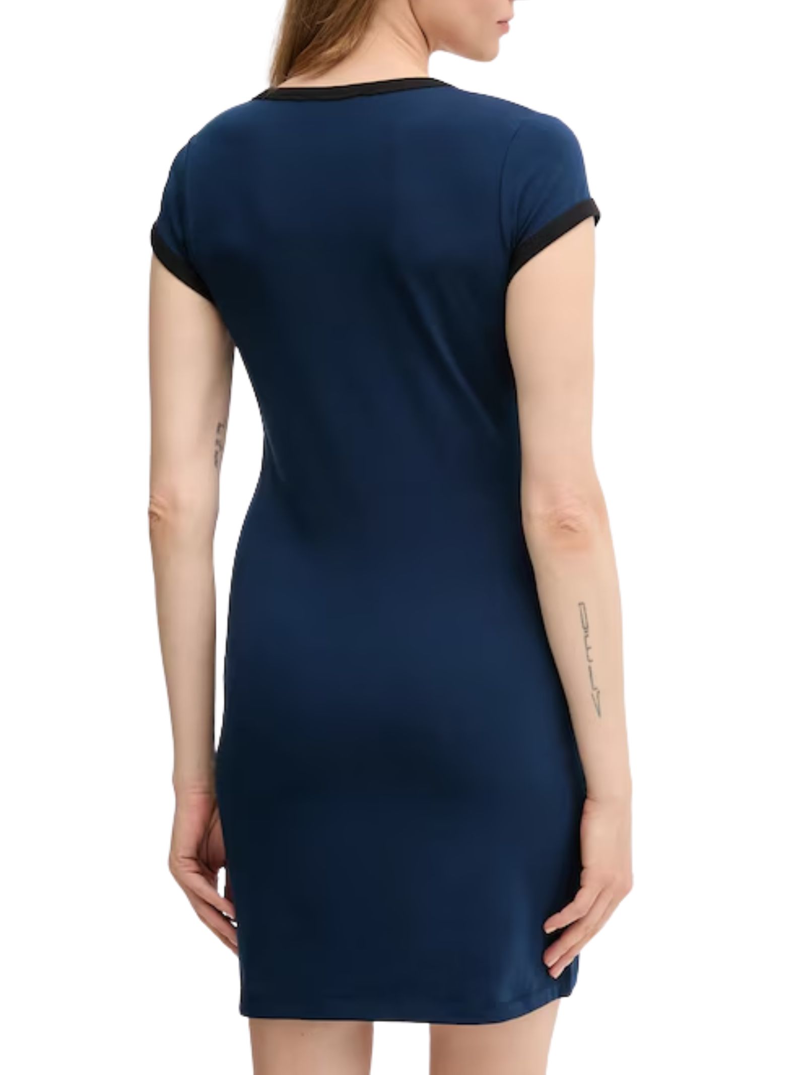 Vestito Calvin Klein Jeans realizzato in maglia fine elasticizzata con alta percentuale di cotone per un comfort ottimale. Presenta taglio aderente al corpo, lunghezza mini, maniche corte, girocollo e applicazione decorativa. 91% Cotone, 9% Elastan