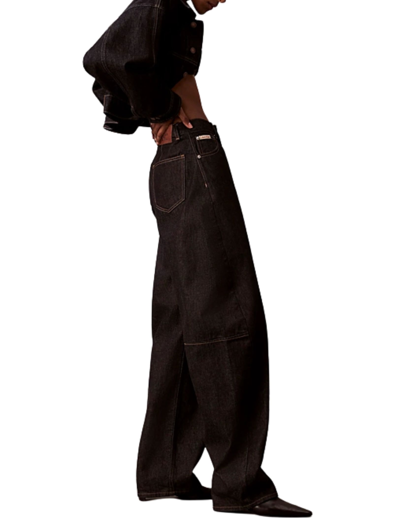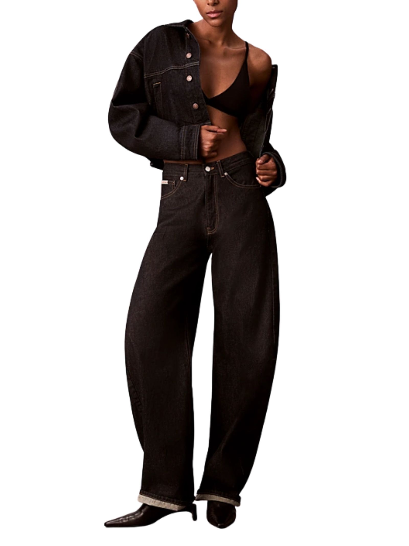 Jeans a vita alta con gamba a botte, dotati di patta con cerniera e chiusura con bottone, modello cinque tasche ed etichetta con logo Calvin Klein sul retro in vita, realizzati in 100% cotone.