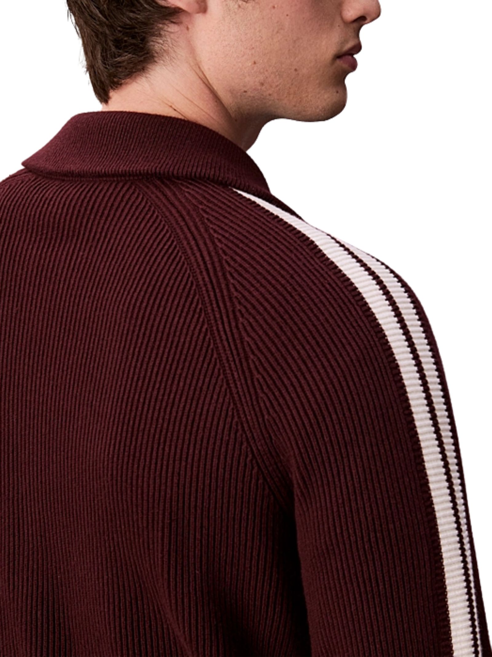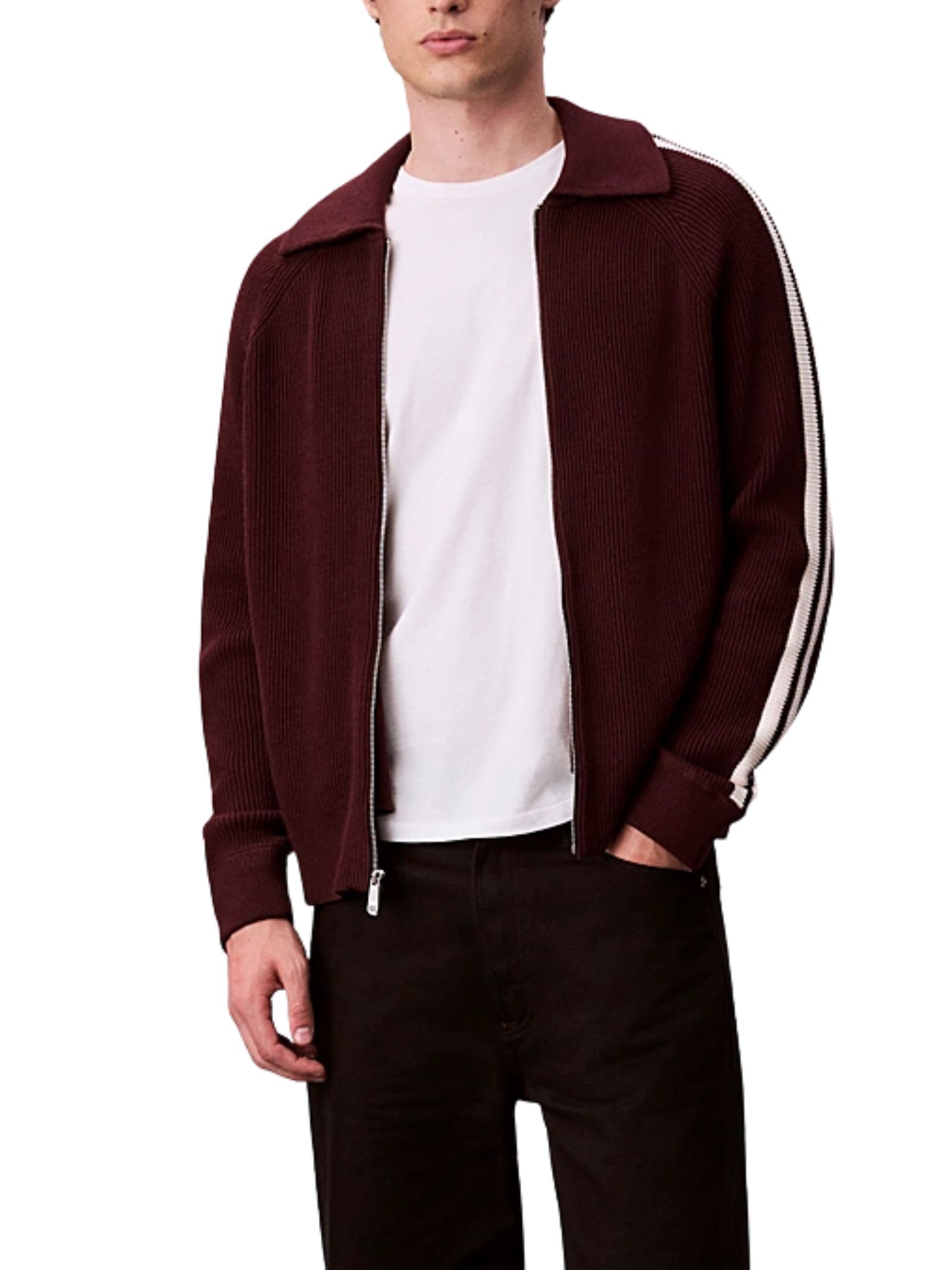 Cardigan con zip e colletto in misto lana e cotone, lavorato a costine con dettaglio rigato a contrasto sulle maniche, cursore della zip in metallo con logo ed etichetta monogramma Calvin Klein con linguetta sullorlo; presenta un taglio relaxed per una vestibilità comoda ed è realizzato in una composizione 90% cotone e 10% lana.