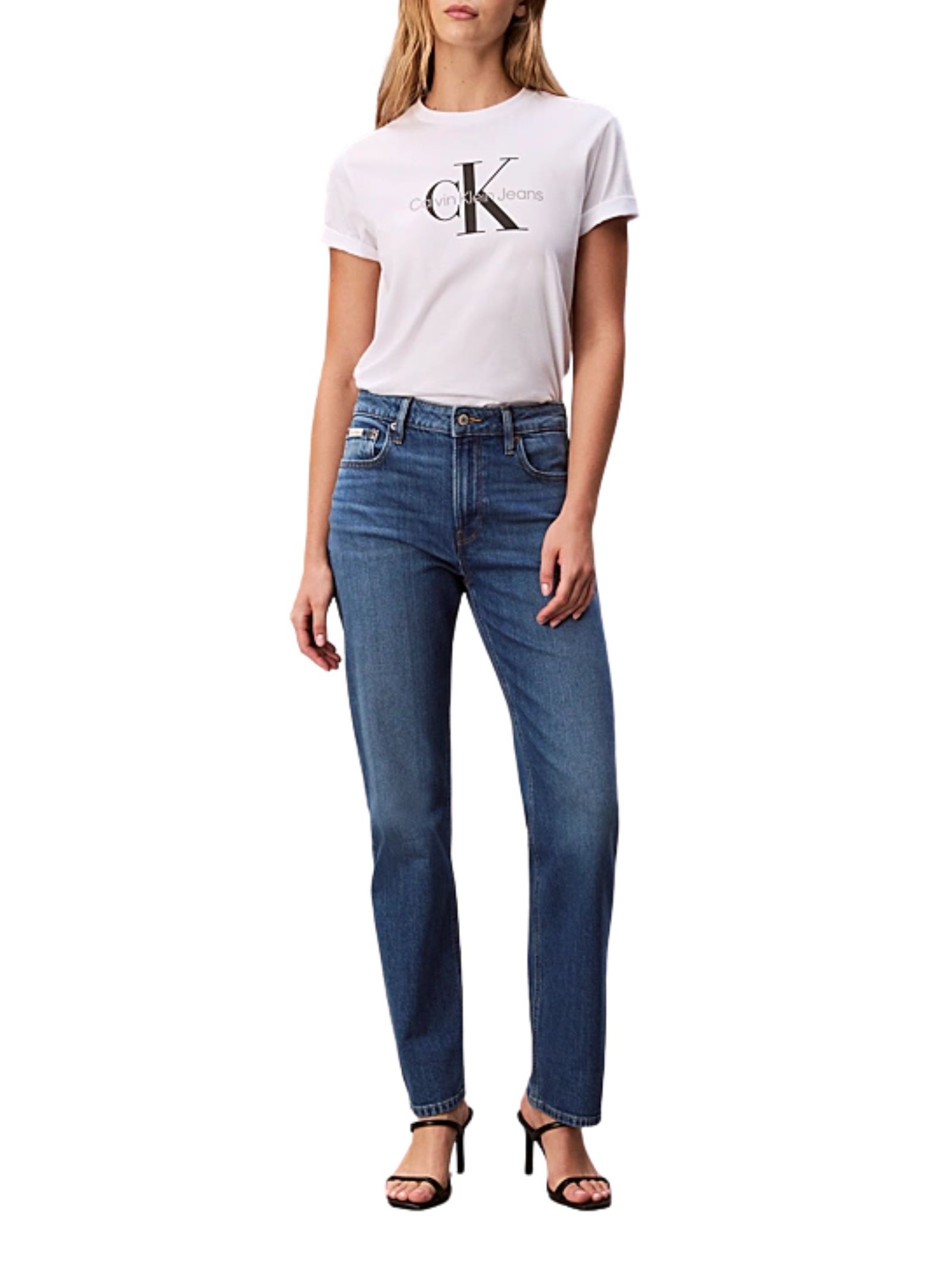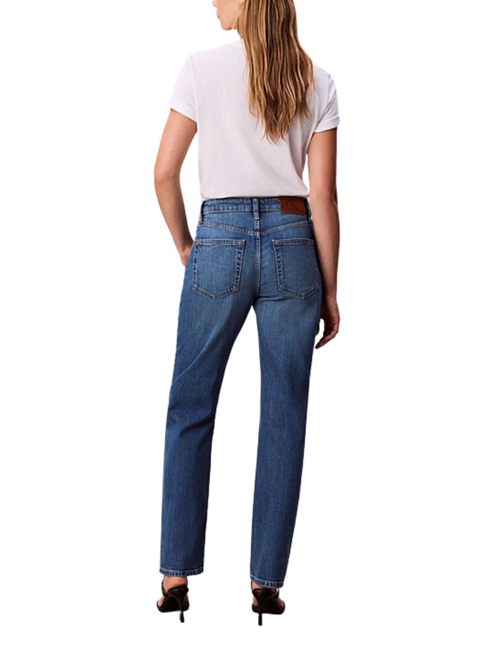 Jeans in denim elasticizzato comodo con patta con cerniera, stile cinque tasche e lavaggio vintage blu medio, rifiniti con rivetti con logo Calvin Klein ed etichetta in pelle, caratterizzati da vita alta e gamba dritta, realizzati in 99% cotone e 1% elastan.