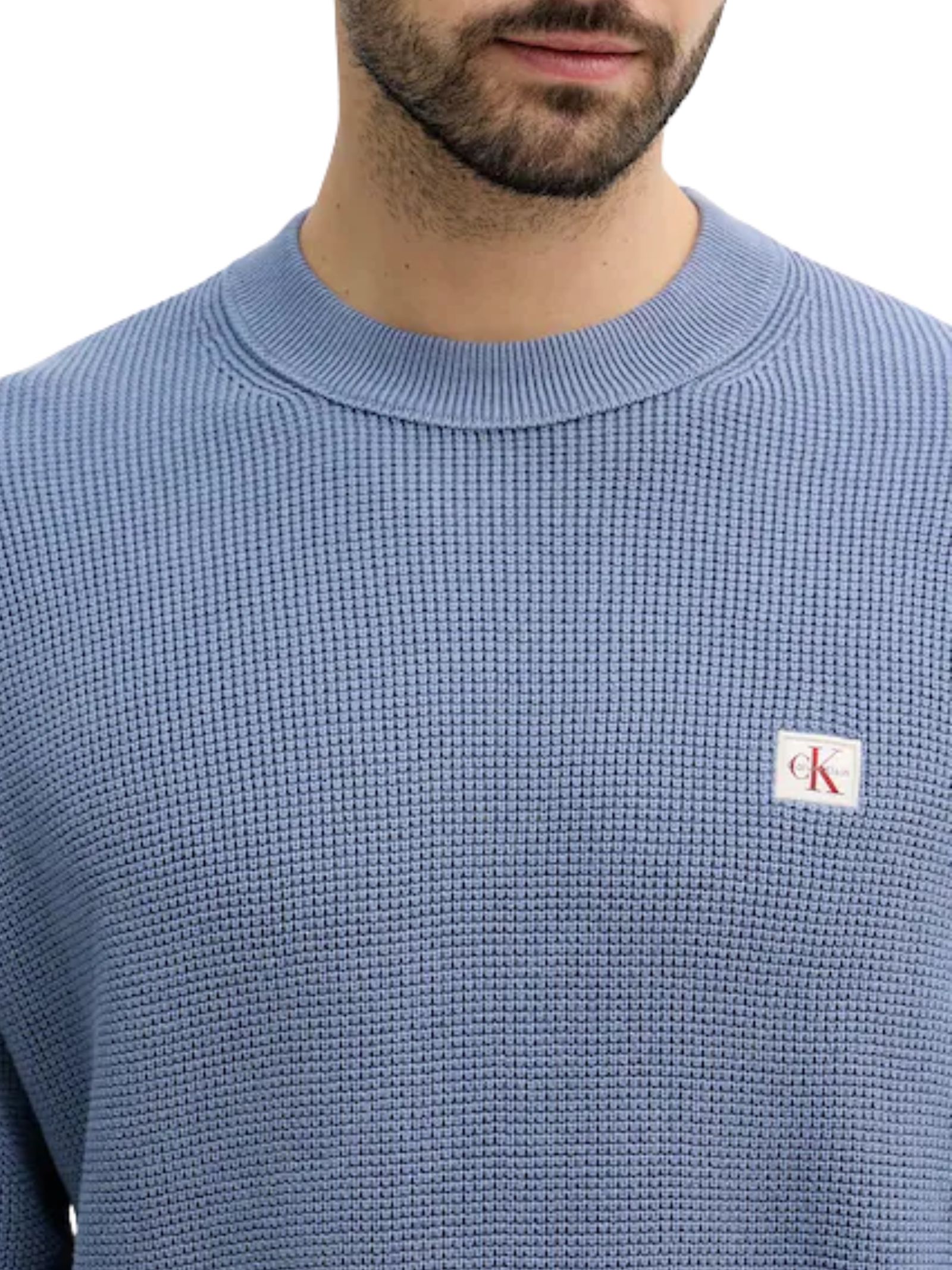 Maglione Calvin Klein Jeans in tessuto di cotone elastico senza motivo, confortevole e traspirante, con vestibilità ampia che garantisce libertà di movimento, girocollo a coste, maniche lunghe con spalle abbassate, polsini e orlo a coste, maglia elastica di medio spessore e toppa sul petto.