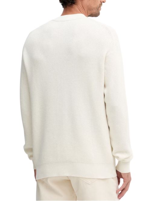 Maglione Calvin Klein Jeans in tessuto di cotone elastico senza motivo, confortevole e traspirante, con vestibilità ampia che garantisce libertà di movimento, girocollo a coste, maniche lunghe con spalle abbassate, polsini e orlo a coste, maglia elastica di medio spessore e toppa sul petto.