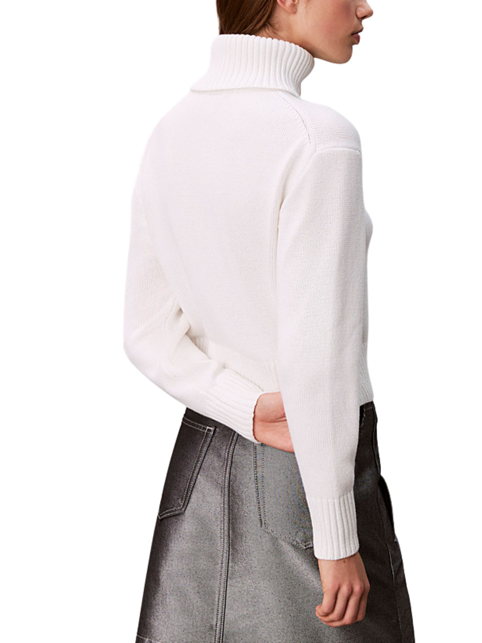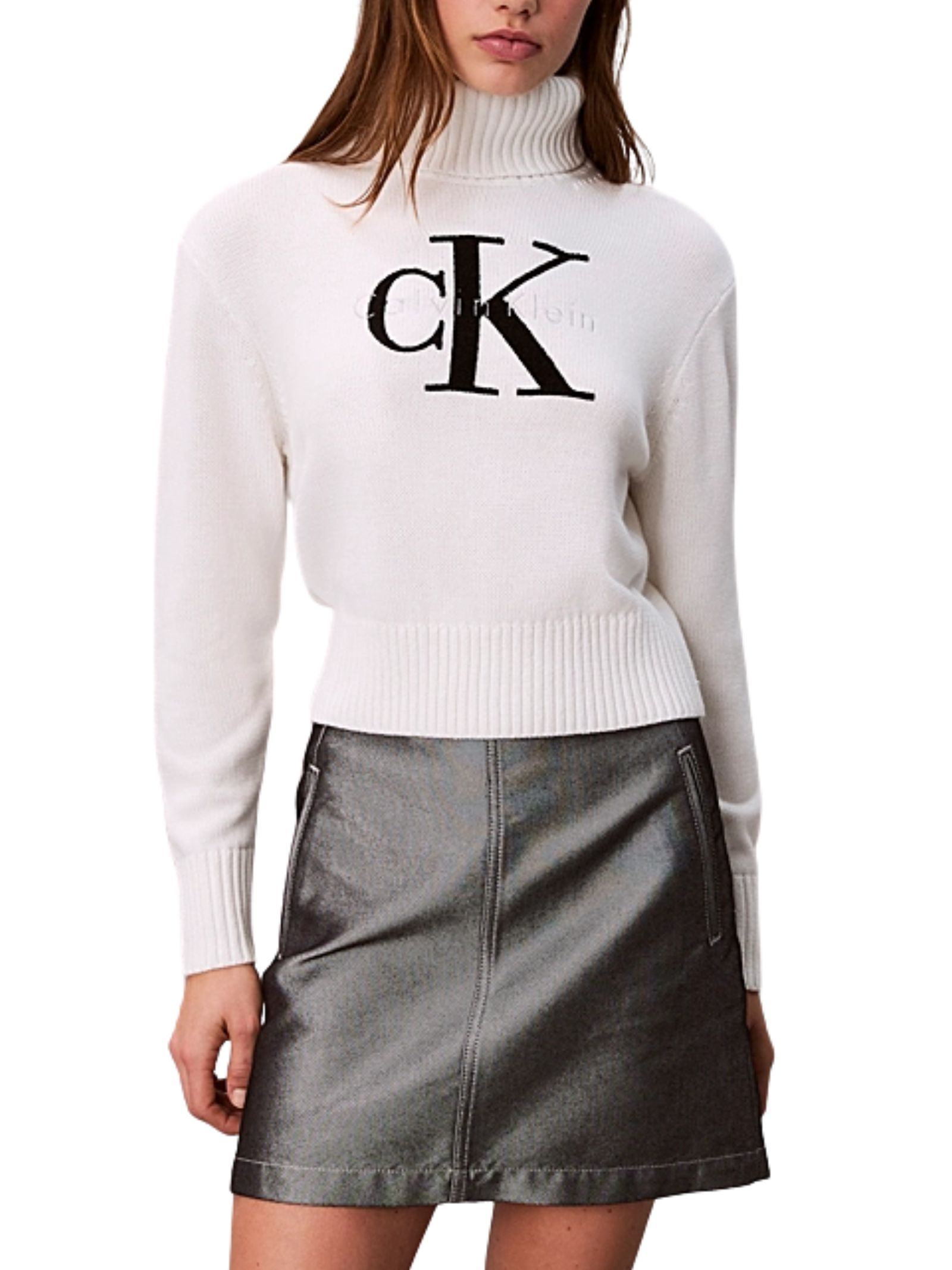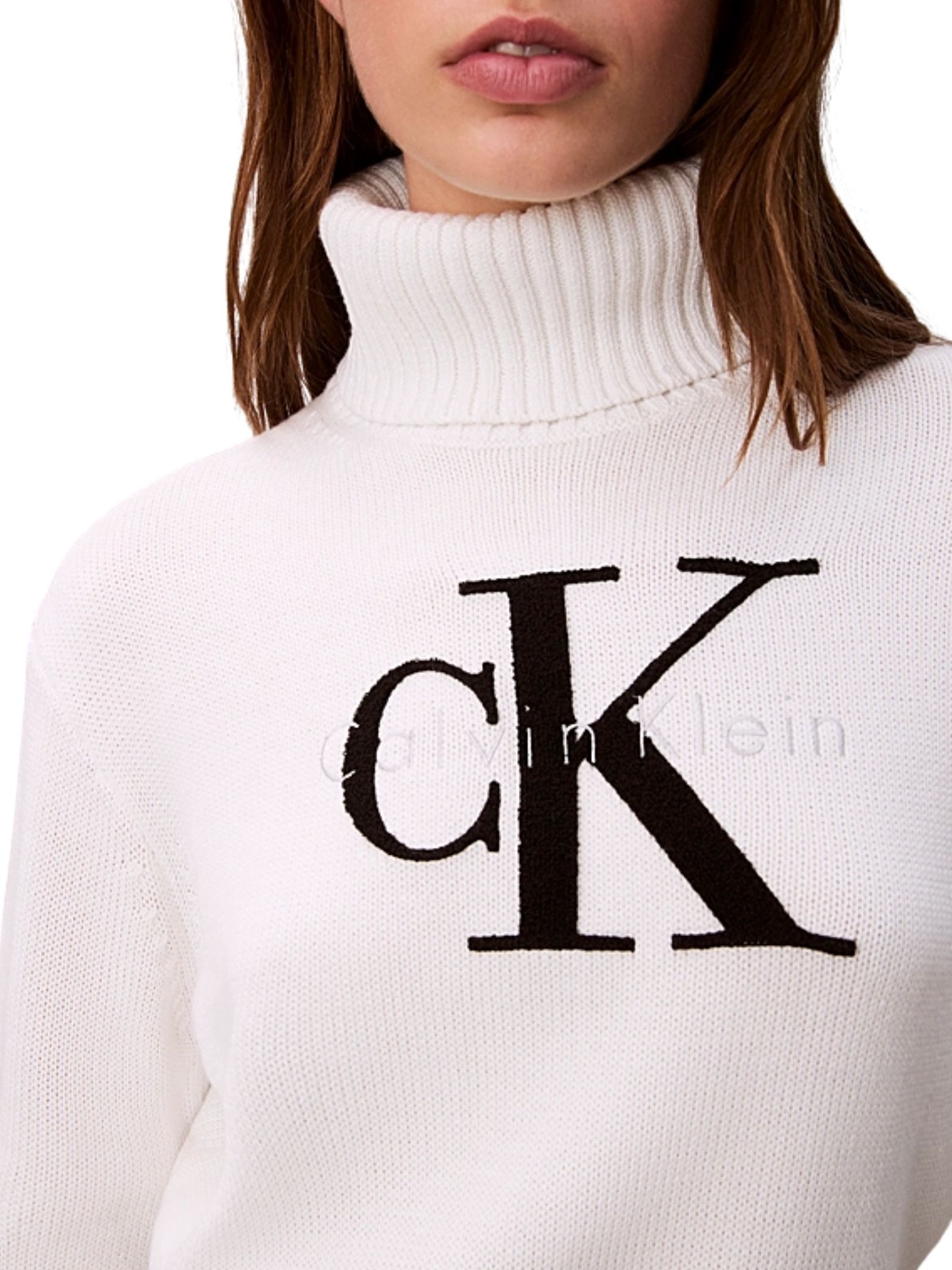 Maglia bianca in misto cotone con morbida texture in ciniglia, scollo tondo e finiture a costine su colletto, polsini e orlo, arricchita dal monogramma Calvin Klein ricamato sul petto; taglio regolare e lunghezza corta; composta da 60% cotone e 40% acrilico.