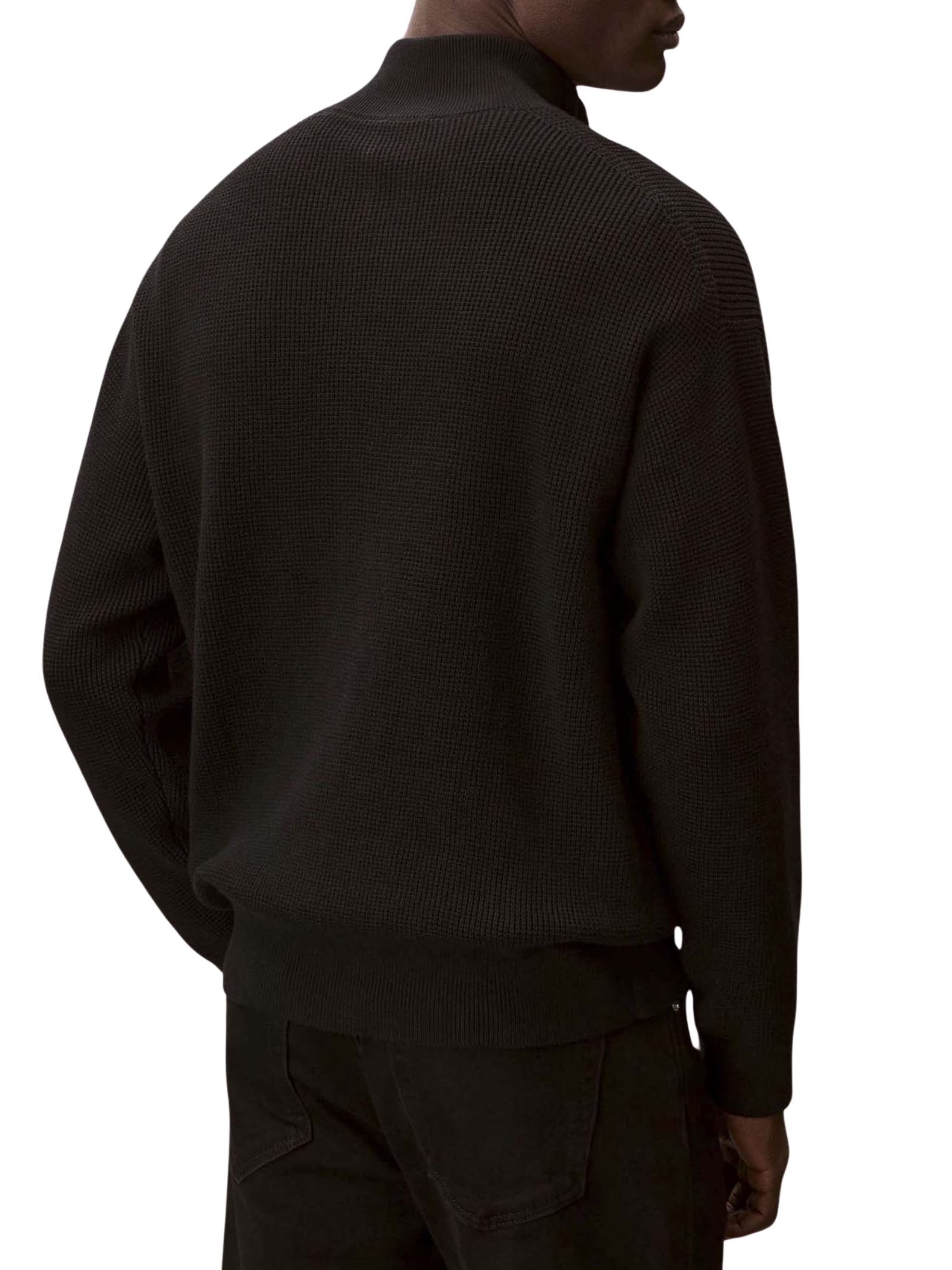 Maglione in cotone caratterizzata da texture a nido dape, maniche lunghe e collo alto con chiusura zip a un quarto, rifinita con polsini e orlo elasticizzati e dettaglio monologo, dalla vestibilità comoda ideale per un look casual curato. Composizione: 100% cotone.