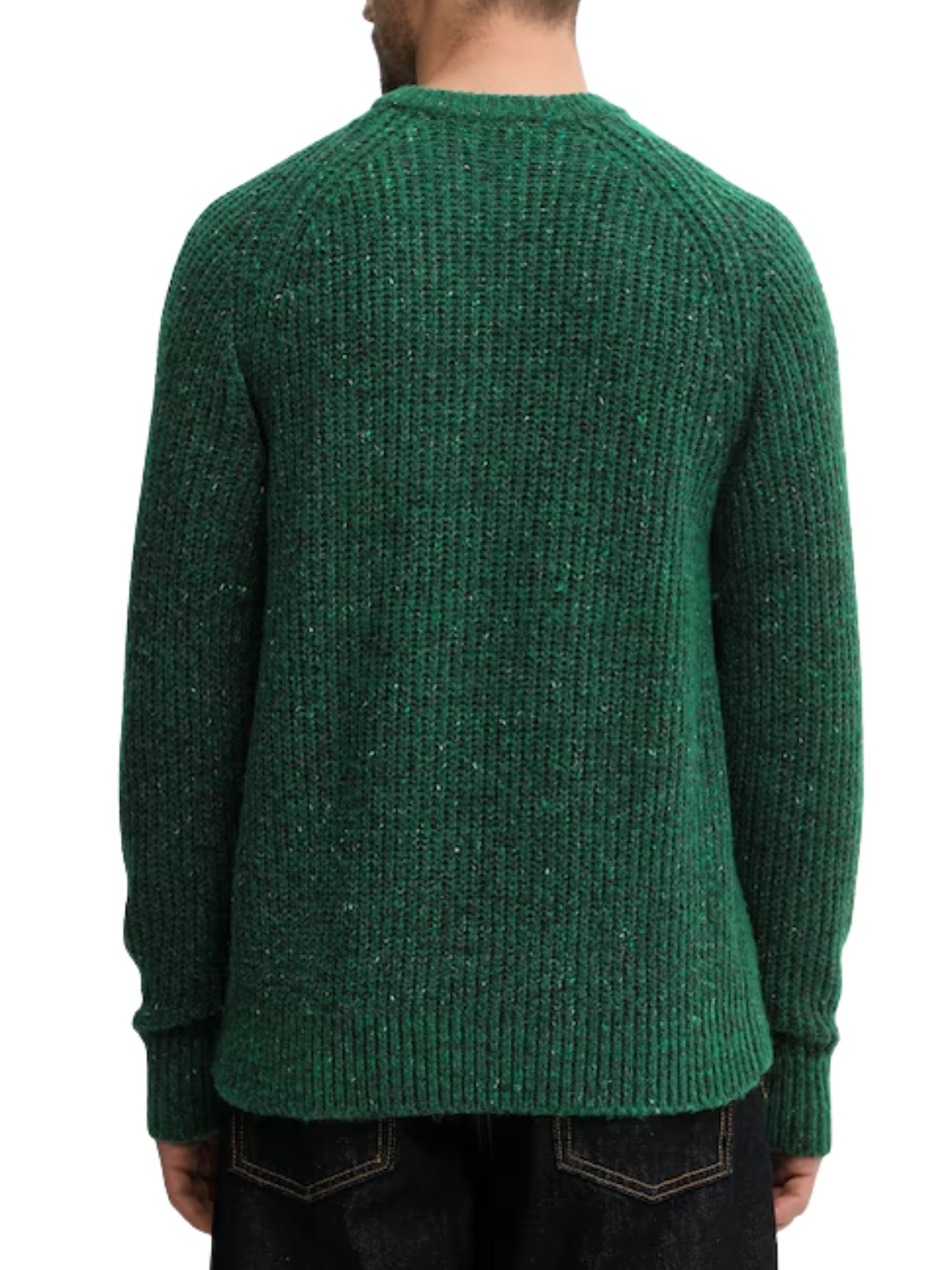 Maglione verde raglan in misto lana dal taglio relaxed, con girocollo e maniche lunghe, finitura a costine e dettaglio logo monogramma sull'orlo; realizzato in una composizione 58% lana, 36% poliestere e 6% nylon.