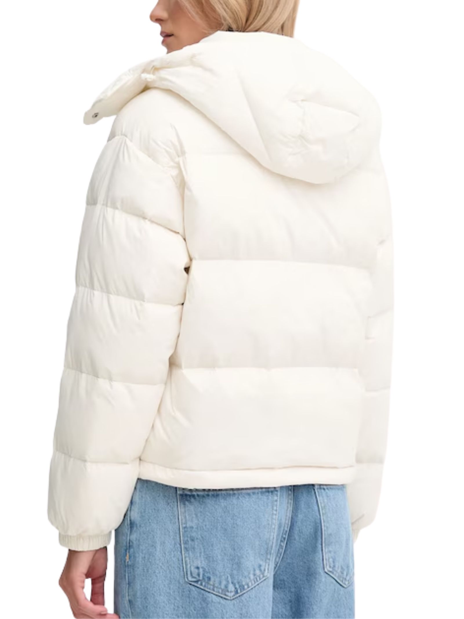 Giacca imbottita Calvin Klein Jeans in piuma doca, realizzata in tessuto trapuntato isolante per garantire un elevato comfort termico, è impermeabile e antivento, offrendo protezione e libertà di movimento grazie al taglio ampio. Presenta chiusura a zip lunga con patta antivento interna, colletto alto e cappuccio staccabile e regolabile con coulisse e stopper. Le spalle abbassate e i polsini elastici migliorano la vestibilità, mentre lorlo regolabile consente un isolamento personalizzato. Dotata di due tasche laterali con chiusura a pressione e una tasca interna. Interamente isolata e foderata.