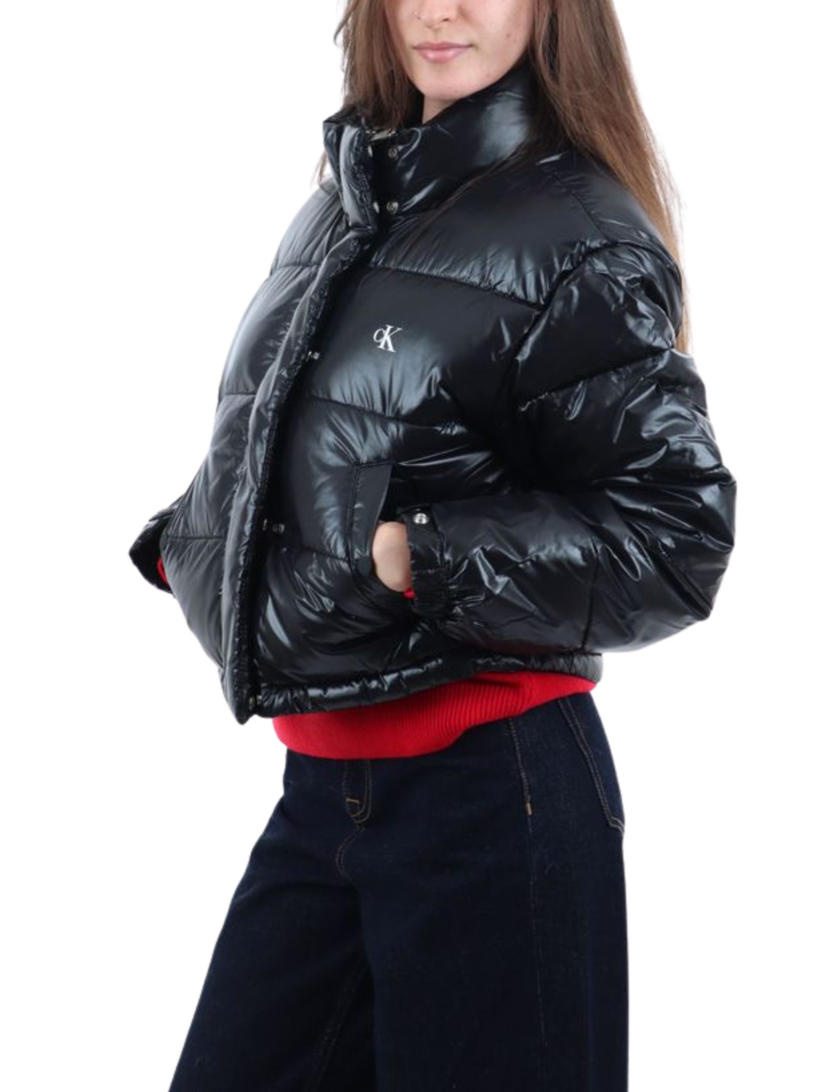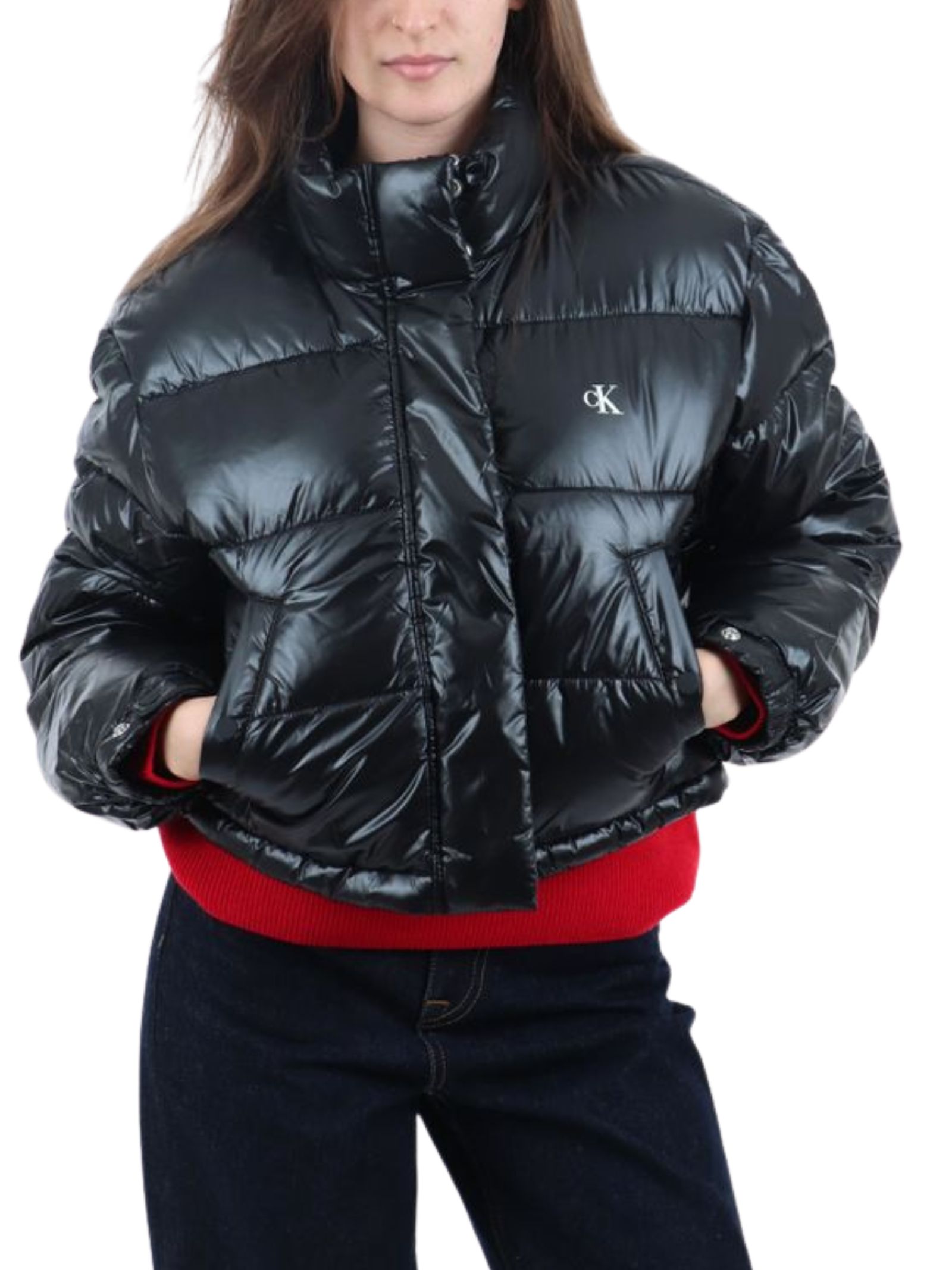 Piumino corto da donna Calvin Klein Jeans realizzato in 100% poliammide con finitura lucida per un look moderno e sofisticato. Il design cropped valorizza la silhouette, mentre limbottitura garantisce calore e comfort nelle giornate fredde. Presenta chiusura frontale con zip, collo alto per una migliore protezione dal vento e logo CK ricamato sul petto.