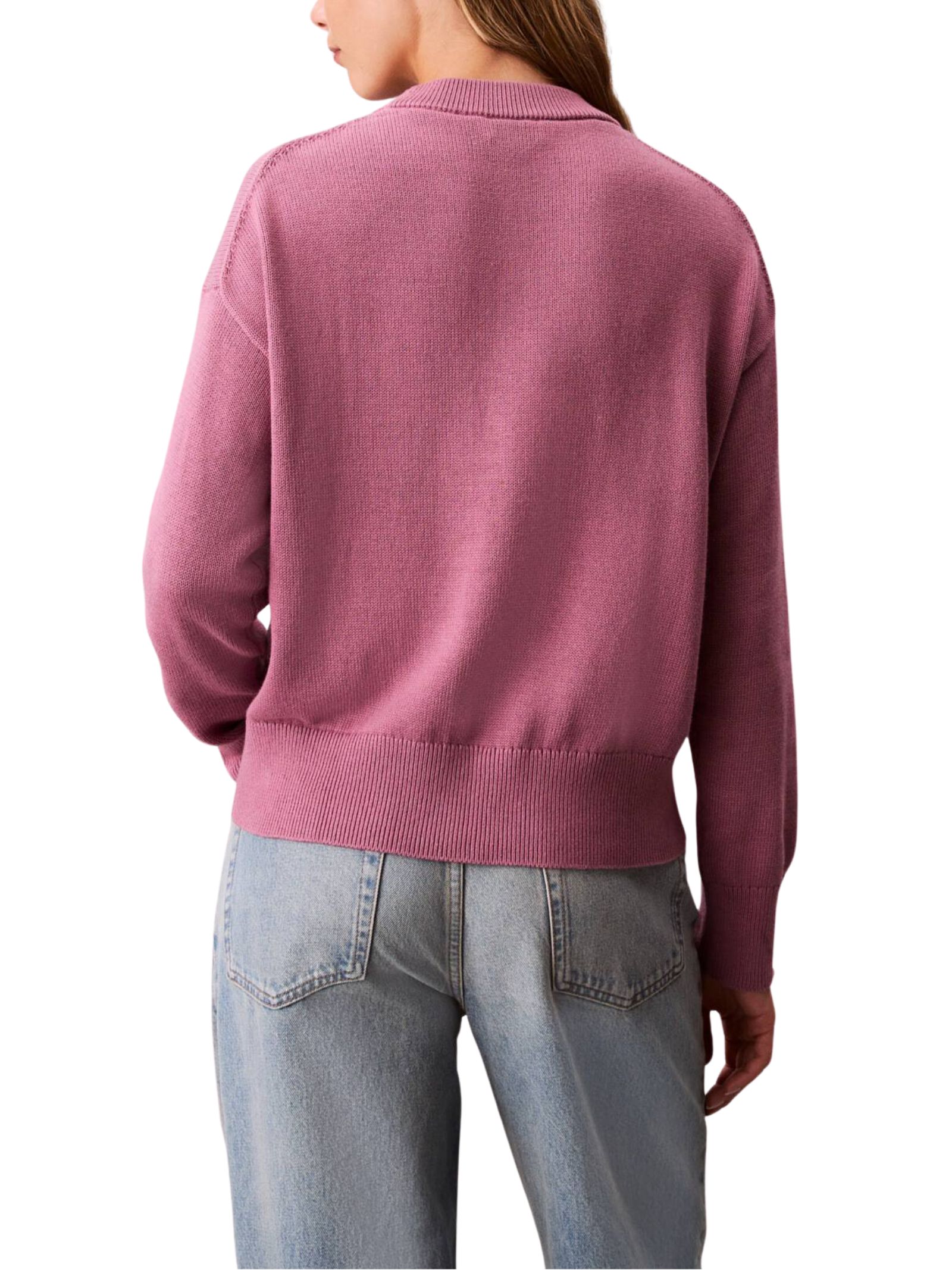 Morbida maglia rosa malva in cotone con girocollo, finiture a costine su colletto, polsini e orlo e ricamo Calvin Klein sul petto; taglio regolare; realizzata in 100% cotone.