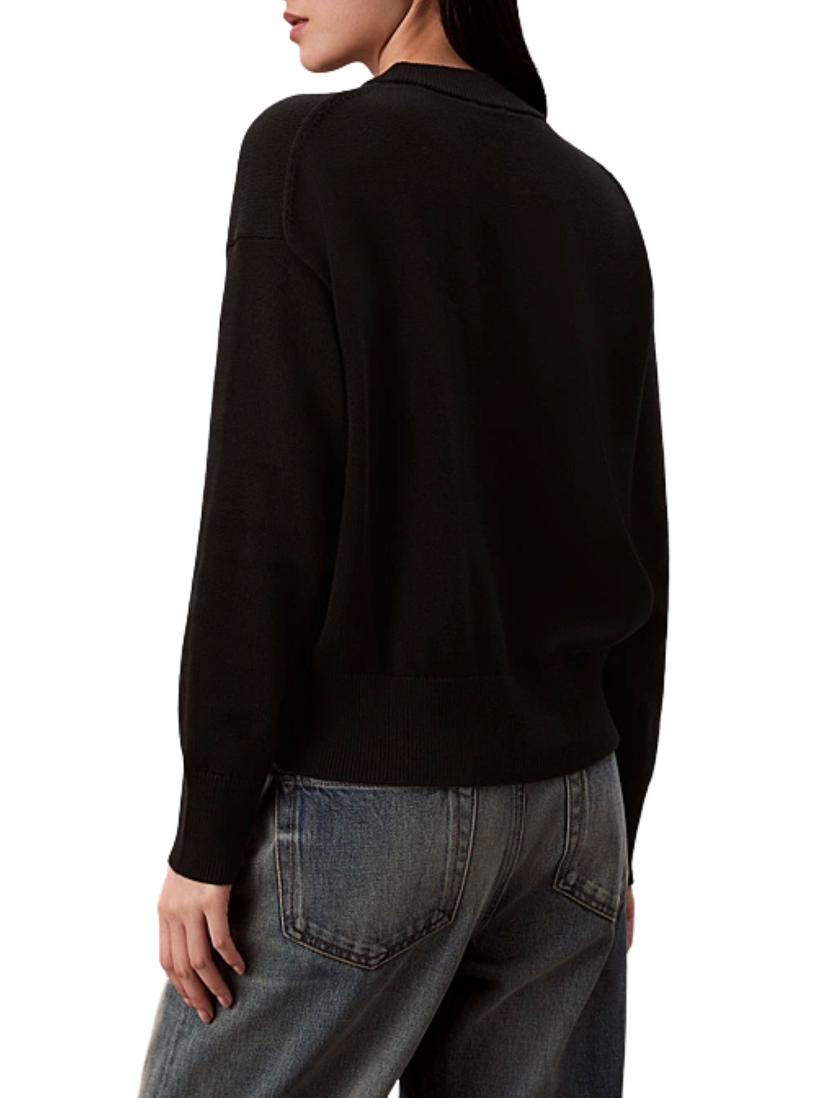 Morbida maglia nera in cotone con girocollo, finiture a costine su colletto, polsini e orlo e ricamo Calvin Klein sul petto; taglio regolare; realizzata in 100% cotone.