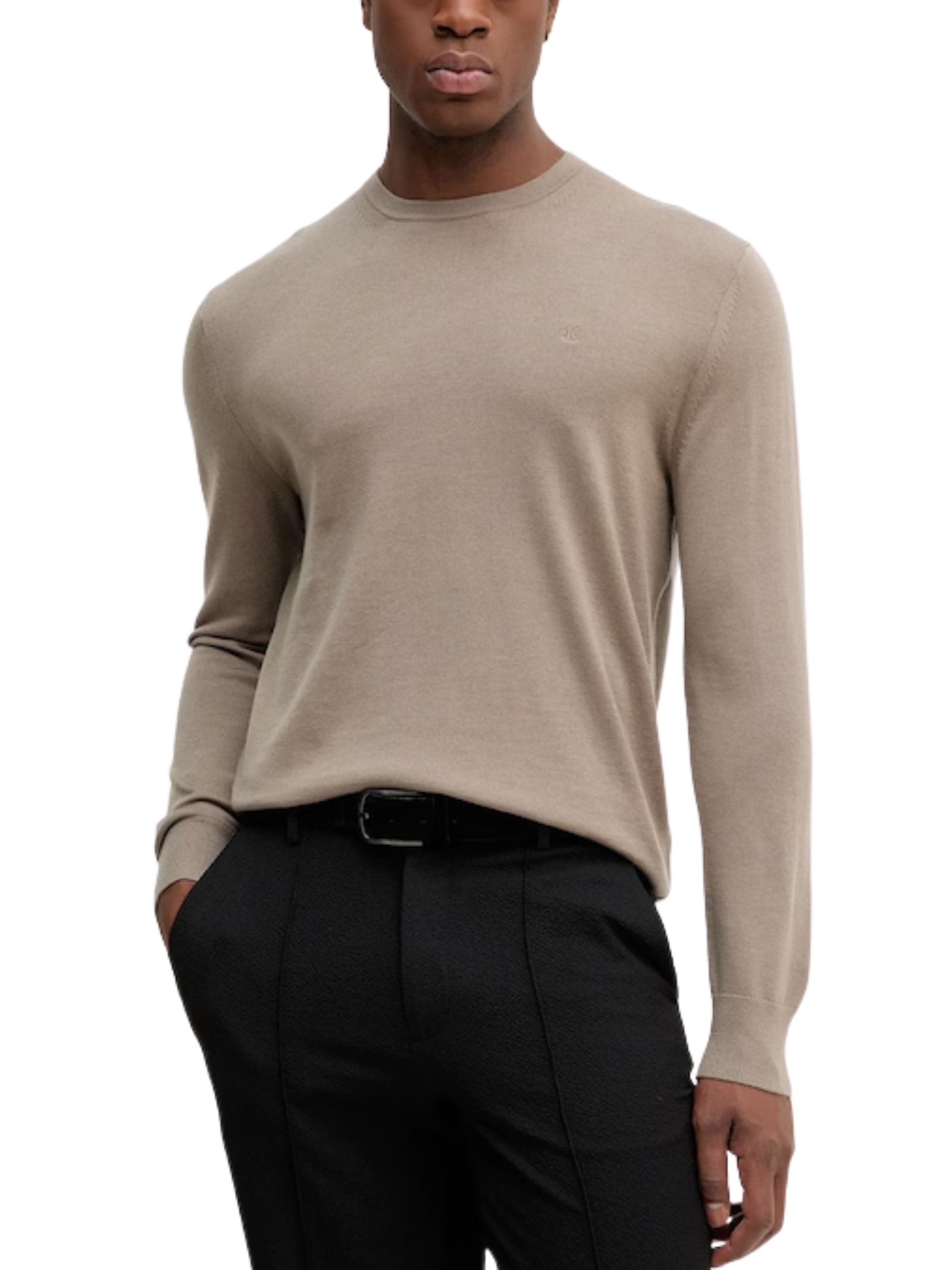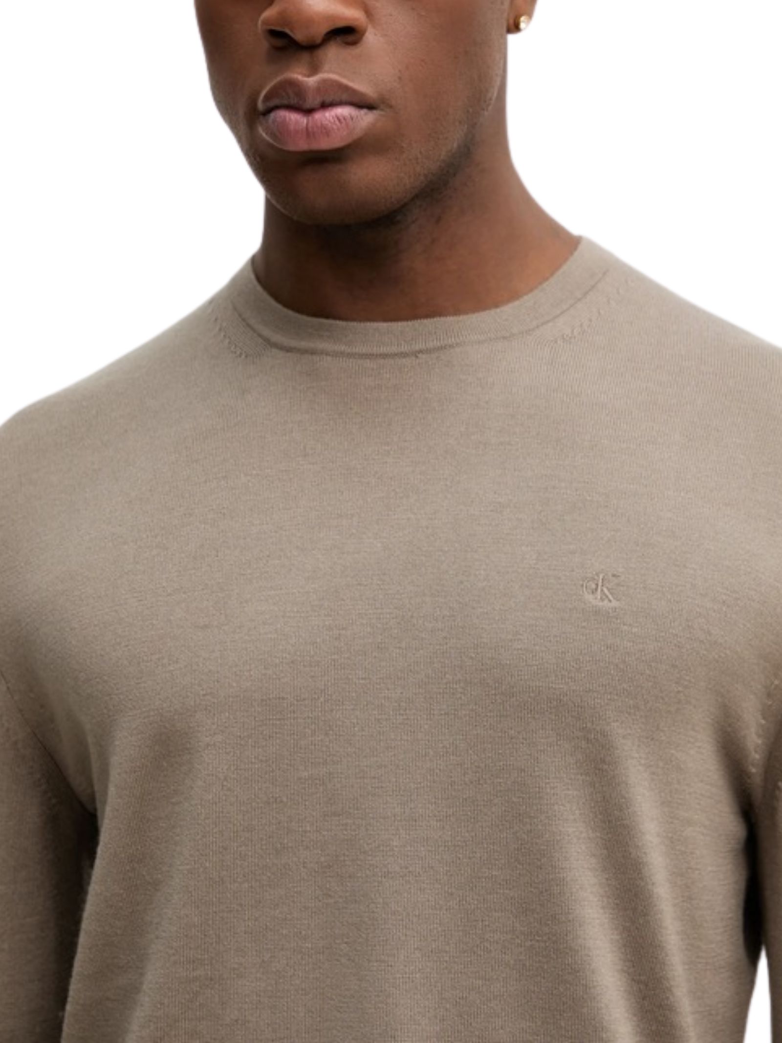 Maglioncino tortora Calvin Klein in lana elasticizzata a maglia fine, con scollatura rotonda, maniche lunghe e polsini e orlo a coste, dal taglio regolare comodo e versatile, con logo ricamato sul davanti, adatto sia a look eleganti che casual. 100% lana merino