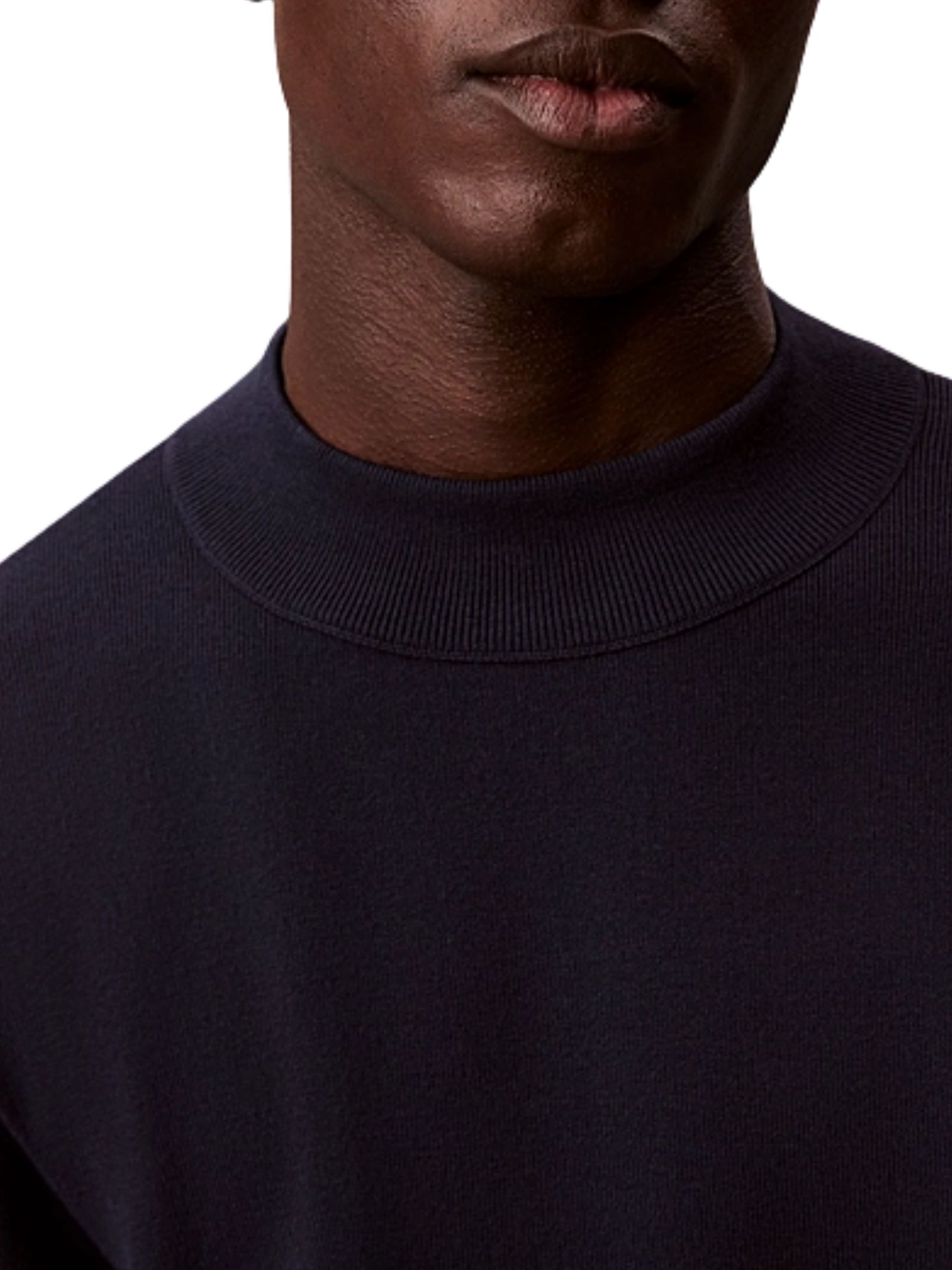 Maglioncino blu a collo a lupetto in maglia a costine con maniche lunghe, orlo con spacco e finiture a punta, completo di toppa con logo sul lato anteriore; taglio rilassato con spalle ribassate; composto da 61% viscosa, 24% poliestere, 13% poliammide e 2% elastan.