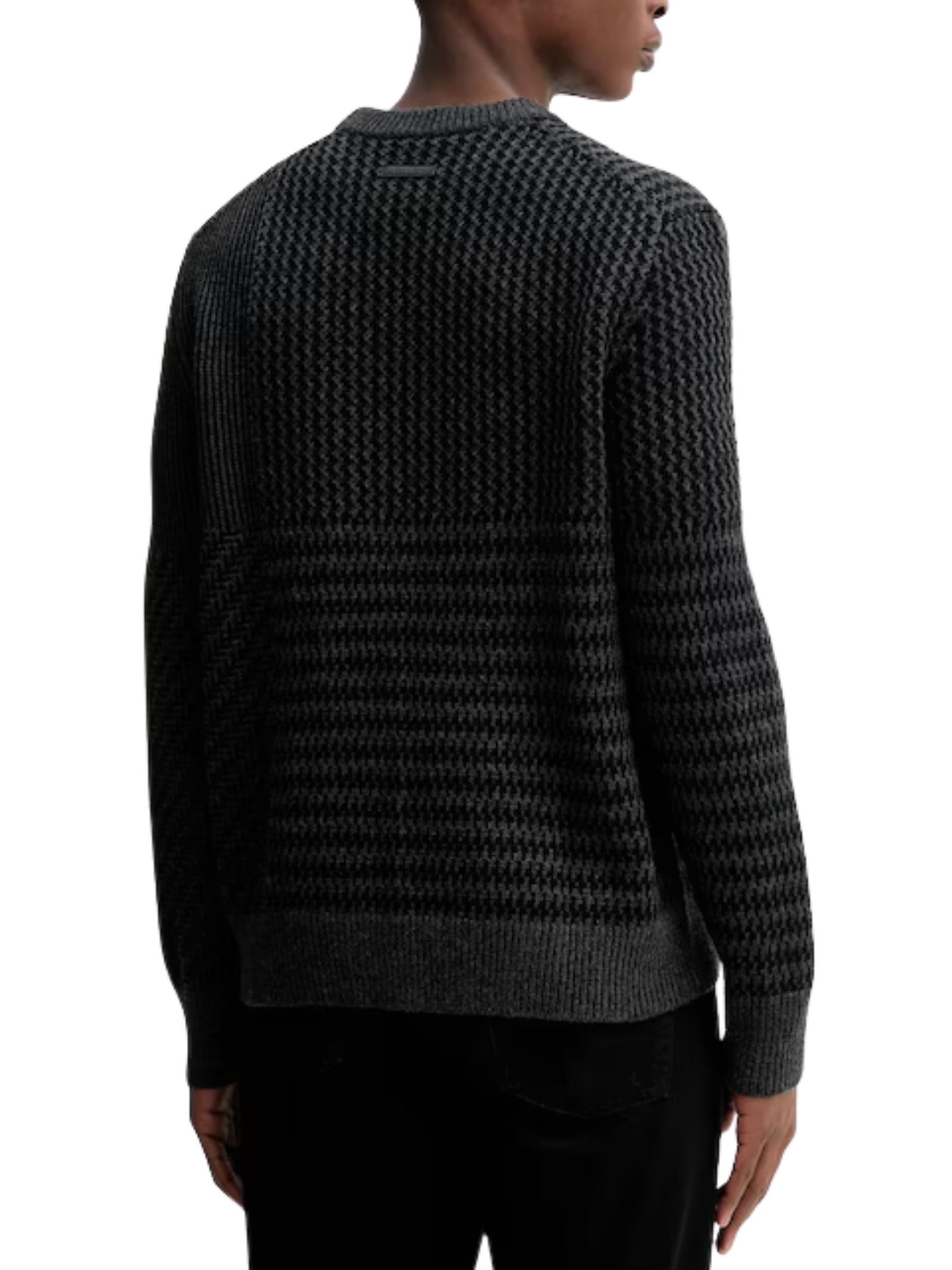 Maglione grigio e nero girocollo con taglio dritto per piena libertà di movimento, polsini e orlo con cordino elastico e tessuto a maglia a fantasia; composto da 80% lana e 20% poliammide.