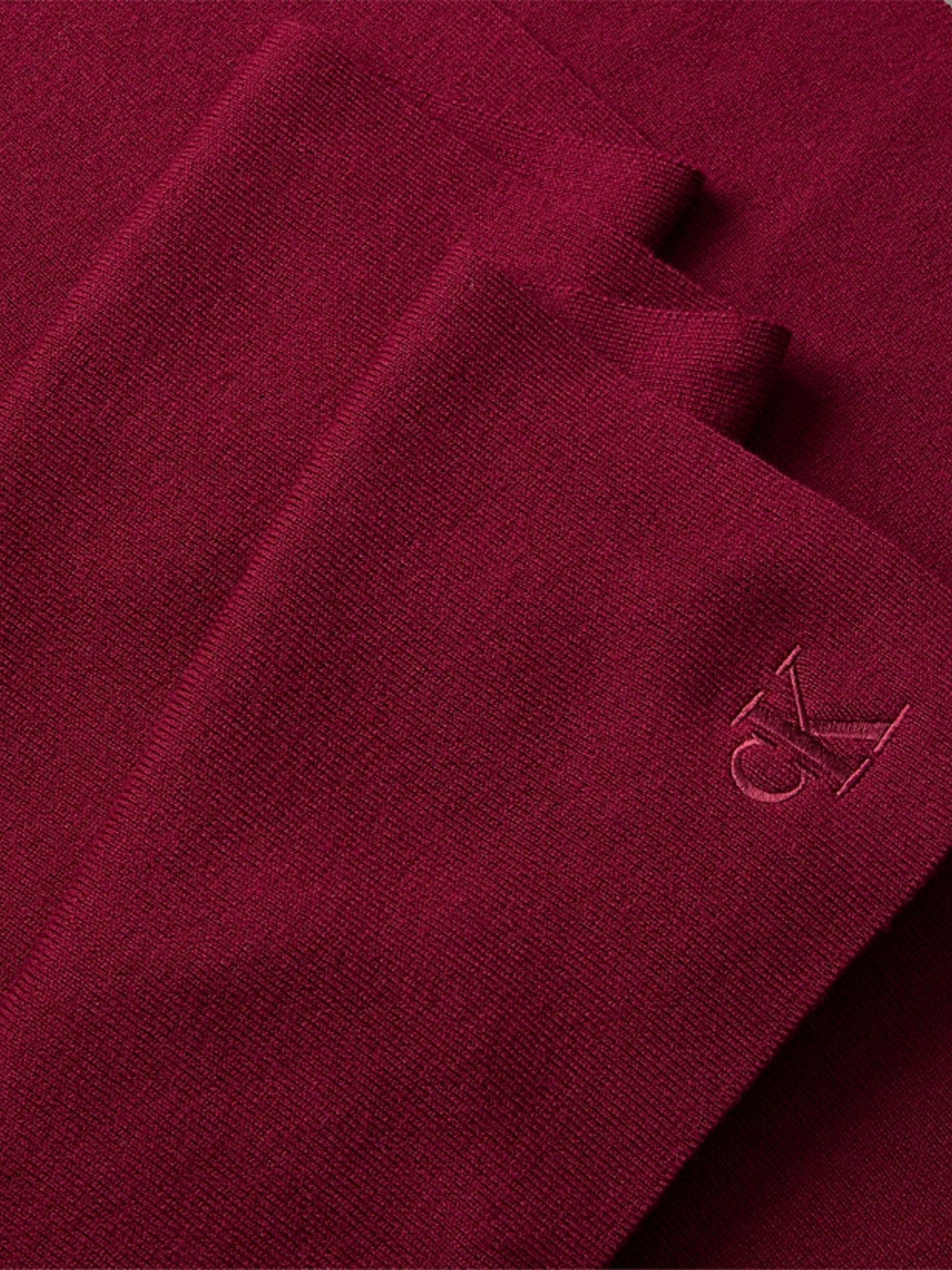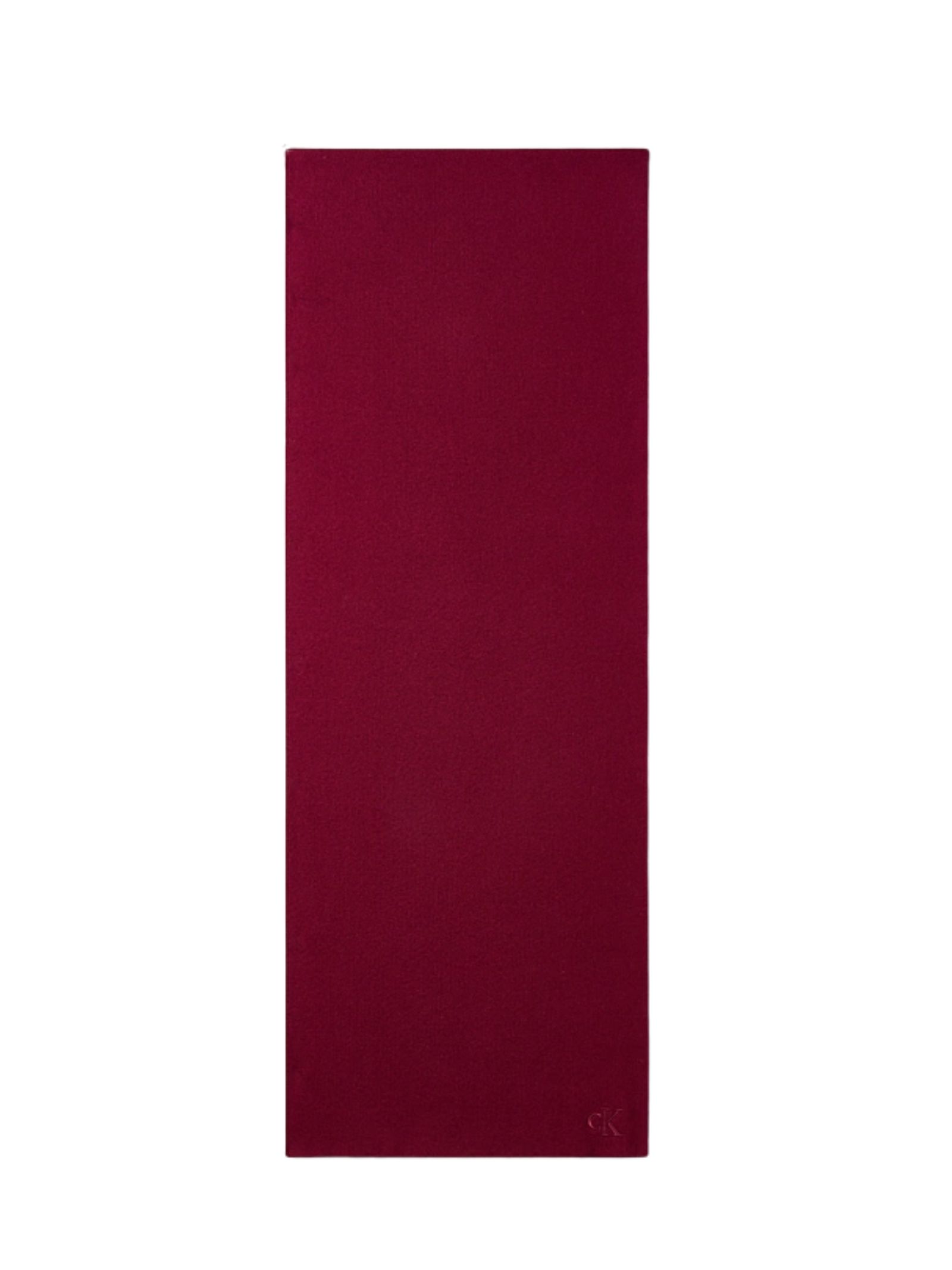 Sciarpa bordeaux in caldo misto viscosa-poliestere con maglia a costine sottili, bordi rifiniti e logo monogramma Calvin Klein ricamato sullangolo; taglia unica, dimensioni 198x35,5 cm, composta da 72% viscosa e 28% poliestere.