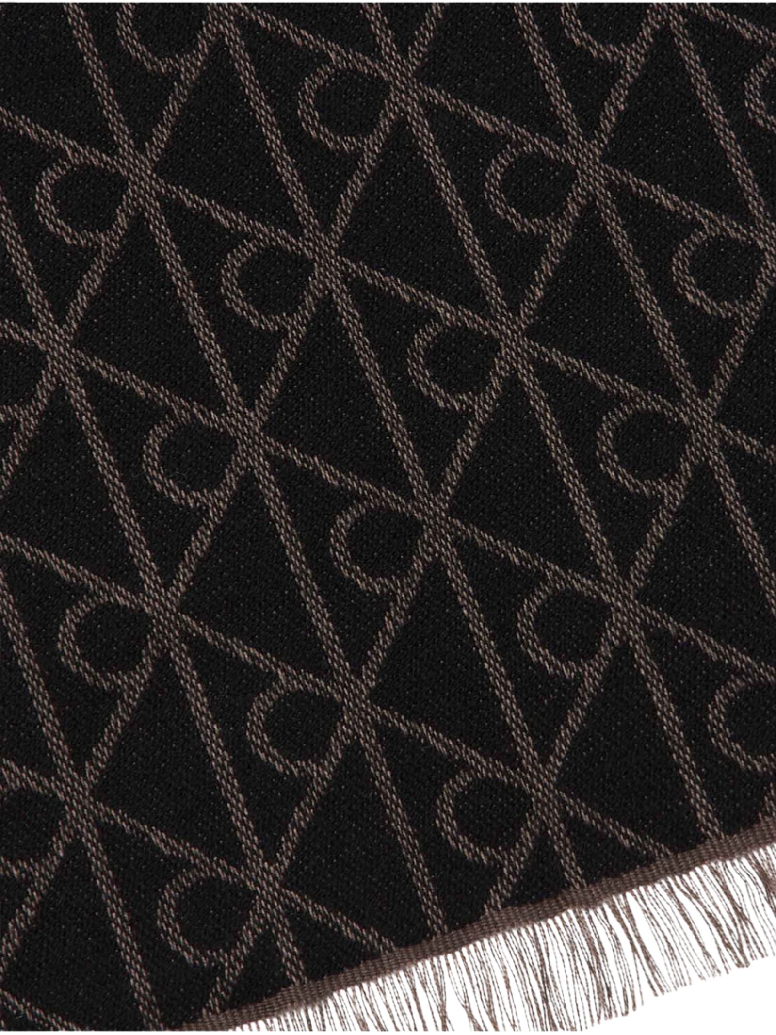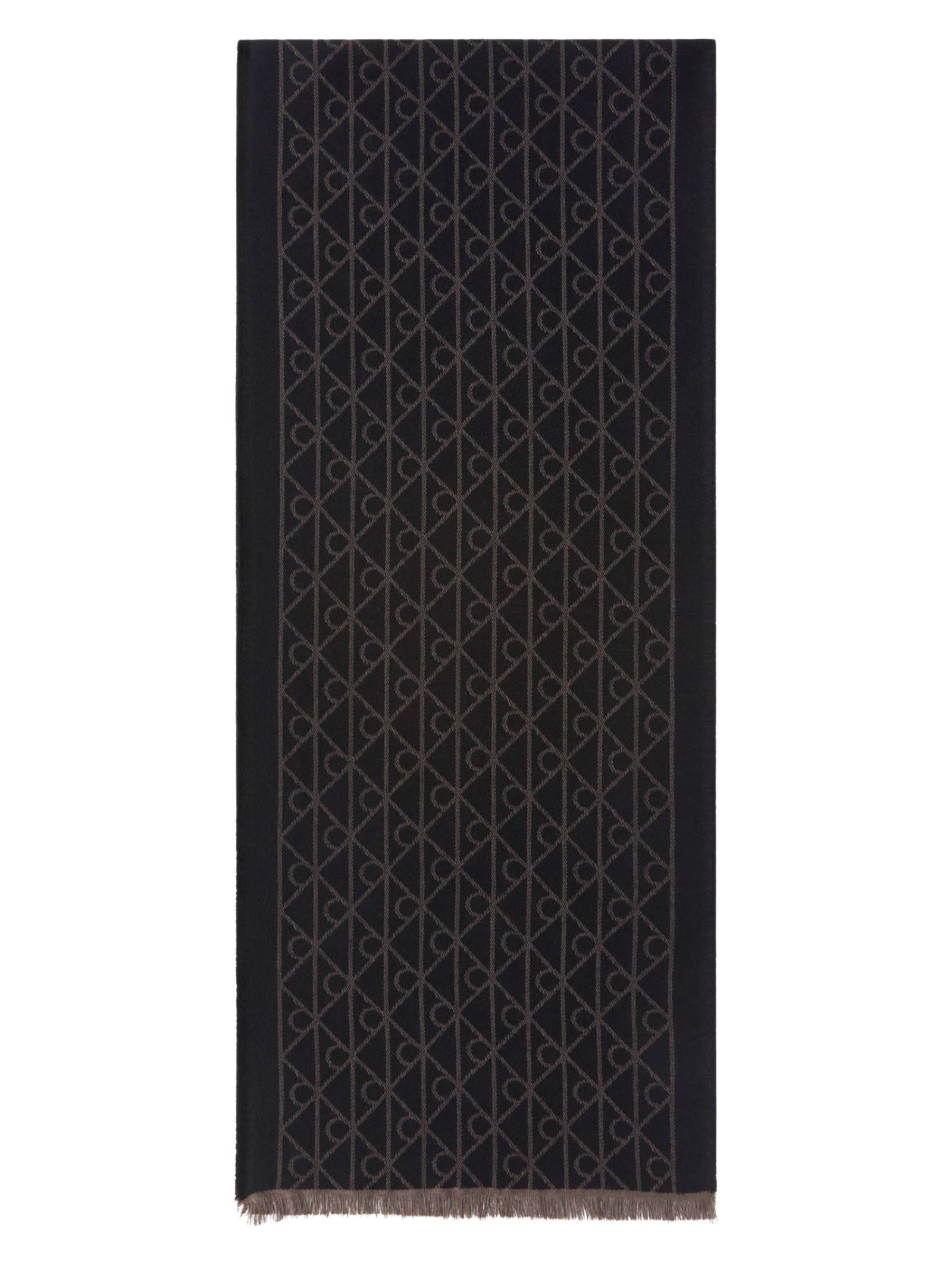 Sciarpa nera e marrone Calvin Klein di peso medio in maglia fine con orli sfrangiati; dimensioni 35x175 cm, composta da 70% lana e 30% poliestere.