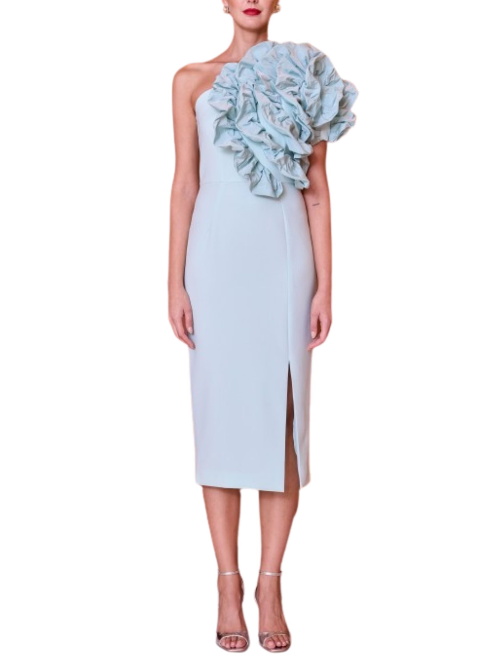 Abito midi monospalla in tessuto leggero caratterizzato da un dettaglio voluminoso e plissettato sulla spalla con un effetto scenografico a fiore. Linea aderente al corpo con spacco frontale discreto, perfetto per valorizzare la figura; in tessuto tecnico stretch, ideale per cerimonie o eventi eleganti. Composizione: 92% poliestere, 8% elastan.