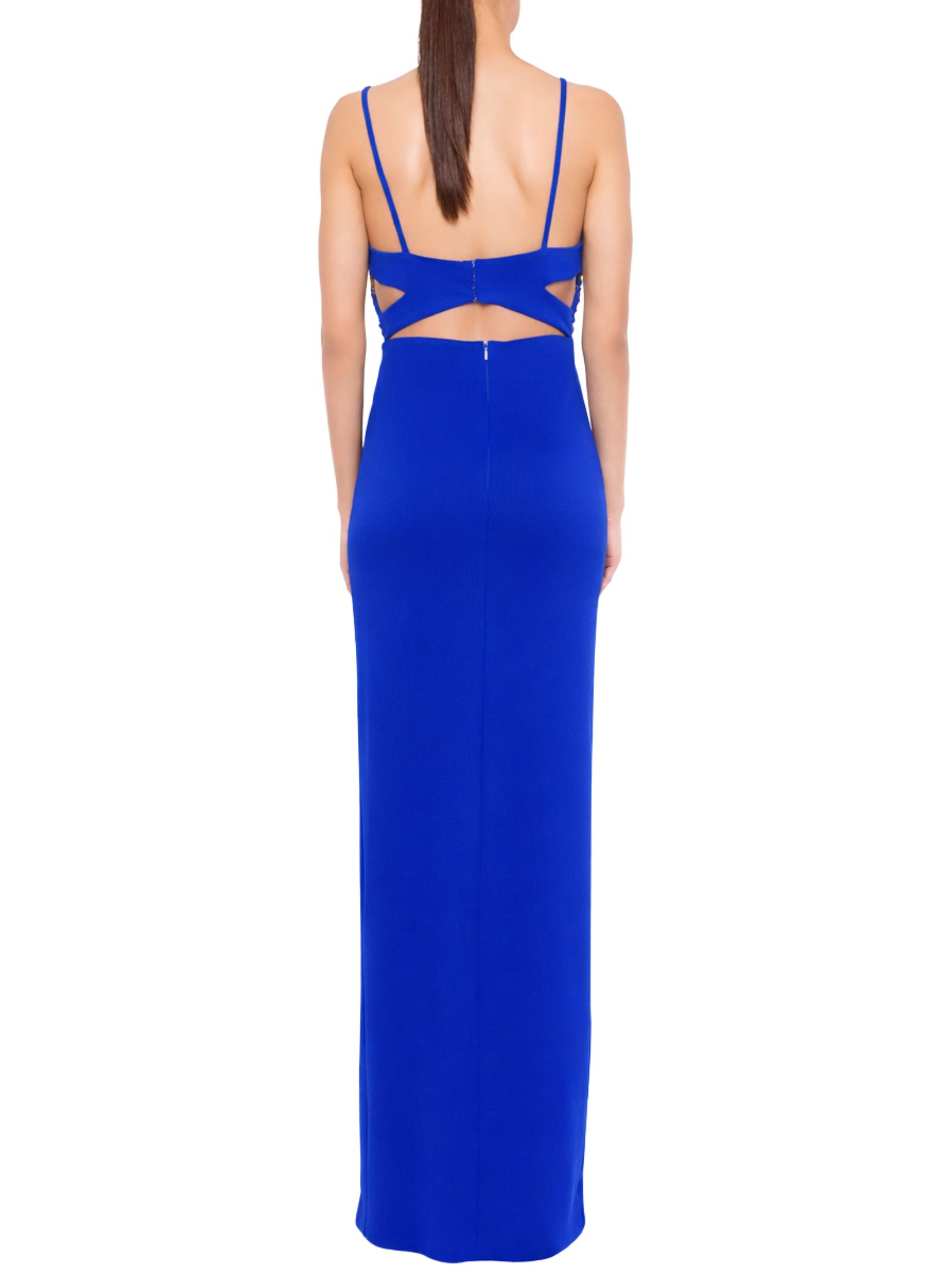 Abito lungo caratterizzato da linea dritta ed elegante con spacco laterale sulla gonna che slancia la silhouette. Scollatura profonda a V con delicato drappeggio sul davanti, sostenuta da sottili spalline che valorizzano il décolleté. Composizione: 94% poliestere, 6% elastan.