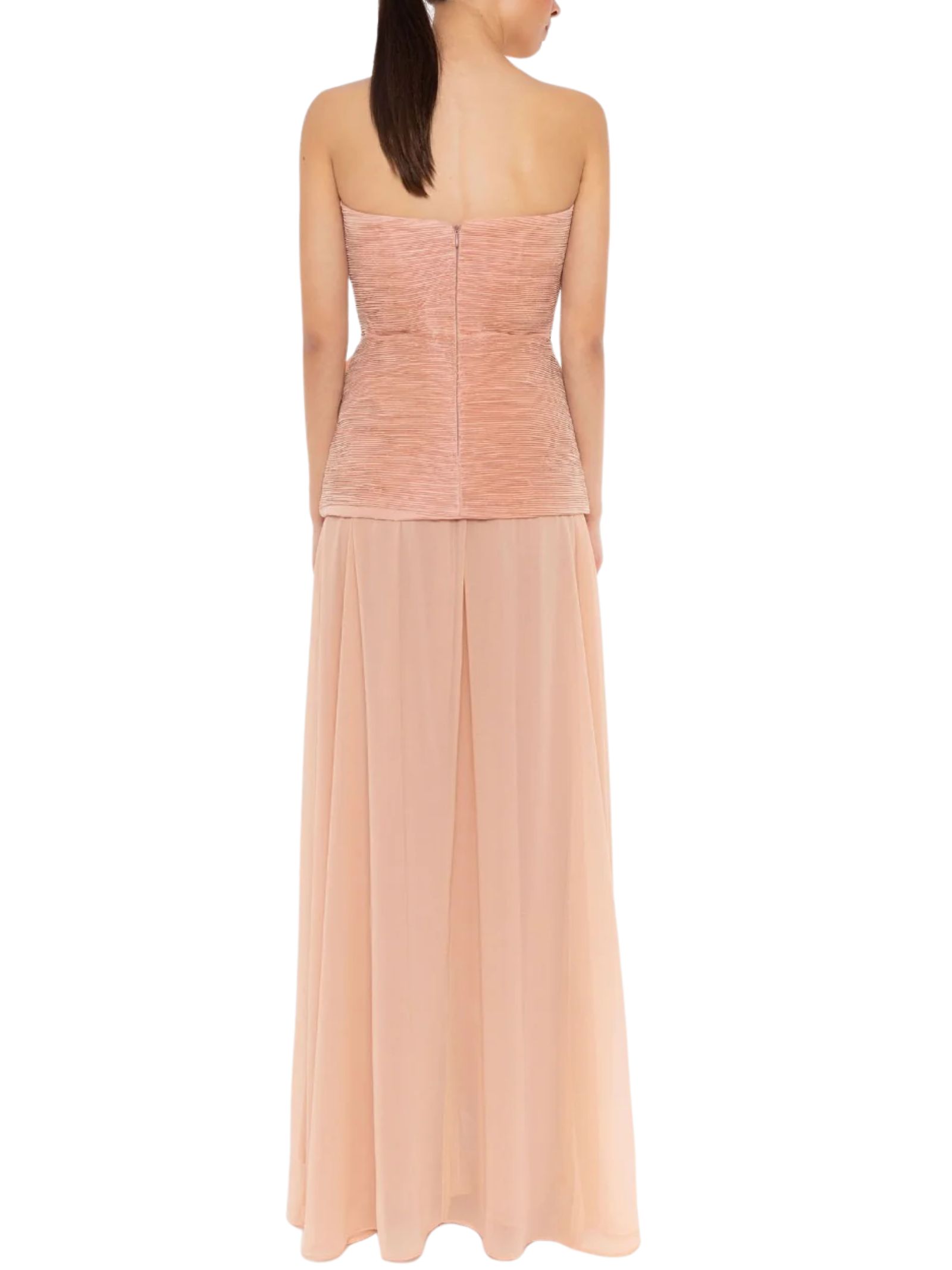 Un completo elegante senza spalline con corpino plissettato e applicazione floreale laterale che aggiunge un tocco romantico e sofisticato, caratterizzato da gonna lunga in tessuto leggero e fluido che dona movimento e raffinatezza, perfetto per cerimonie ed eventi speciali. Composizione: 100% poliestere.