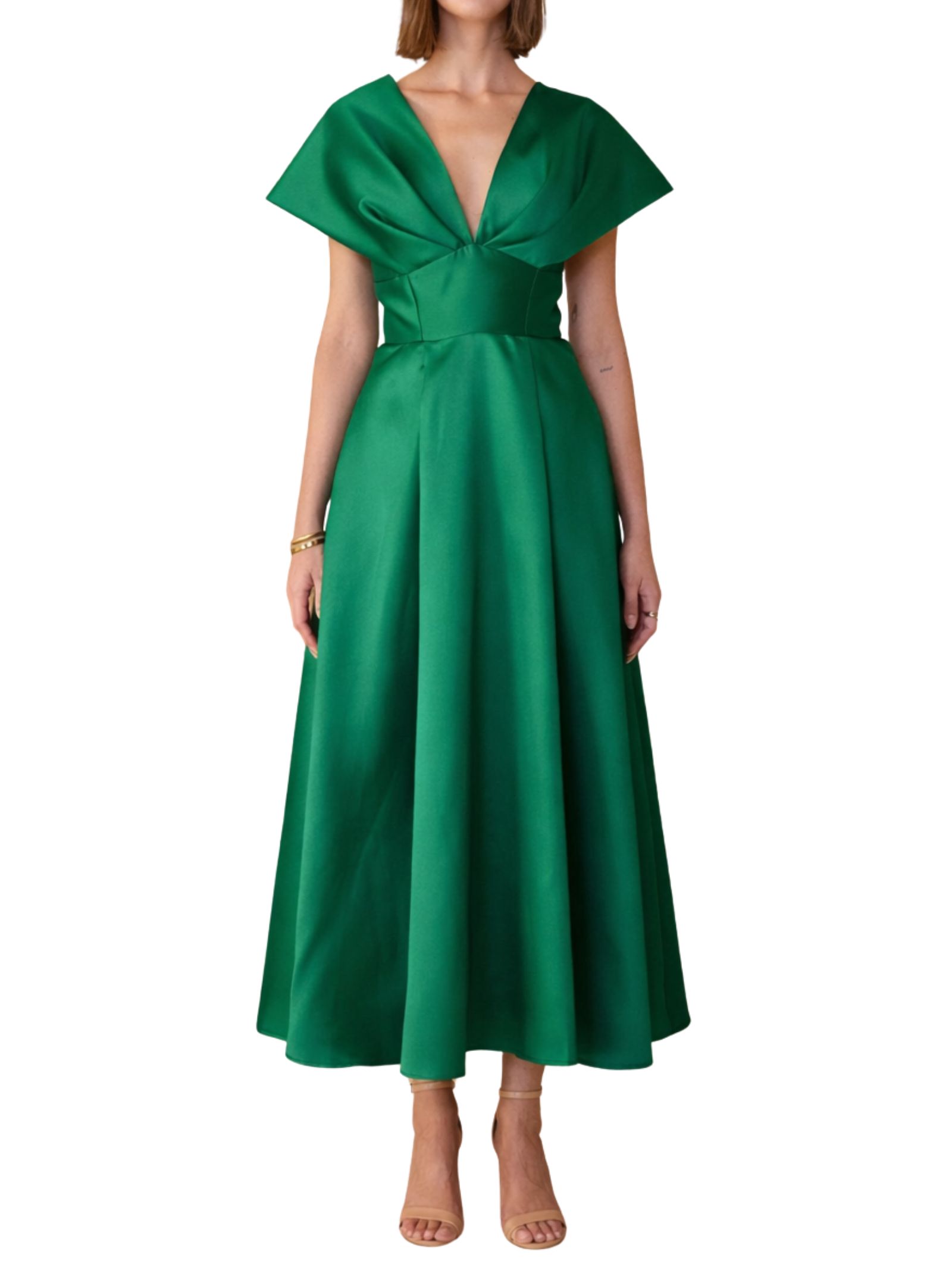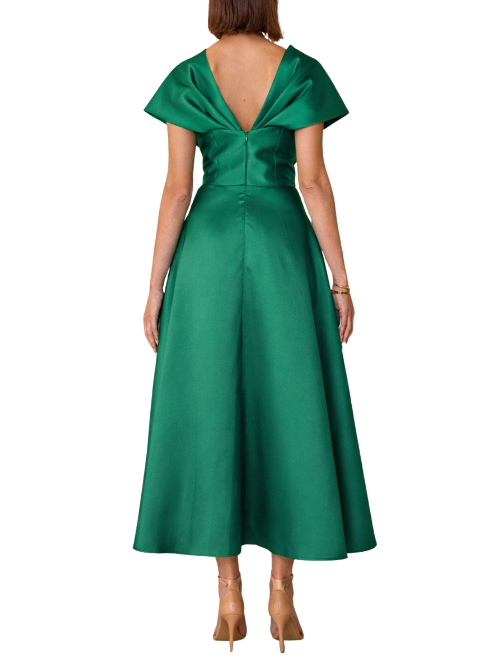 Abito midi in raso con scollo a V profondo e ampie maniche a kimono in un corpetto aderente con cintura integrata in vita, gonna ampia a ruota con pieghe morbide e tasche laterali. L'abito ha un taglio elegante e fluido, perfetto per eventi formali o cerimonie. Composizione: 100% poliestere.