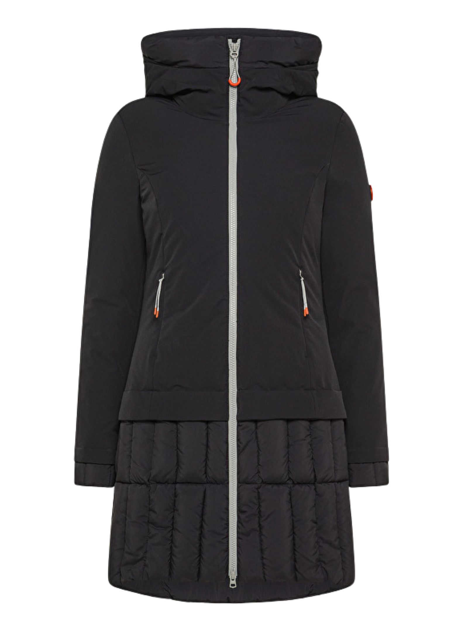Parka tecnico realizzato con due materiali ad alte prestazioni, combina nella parte superiore scuba tecnico in nylon elasticizzato dalla texture morbida e opaca, con finitura water repellent, e nella parte inferiore nylon superleggerotrapuntatocon imbottitura per garantire leggerezza e calore mirato. Il contrasto tra le due texture crea un effetto a doppio livello che dona dinamicità e sottolinea la costruzione tecnica del capo. Completano il design la zip centrale a doppio cursore, tasche laterali a filetto e ampio cappuccio avvolgente. Vestibilità regular e lunghezza lunga. Realizzato in 92% poliammide e 8% elastan con imbottitura 100% poliestere.