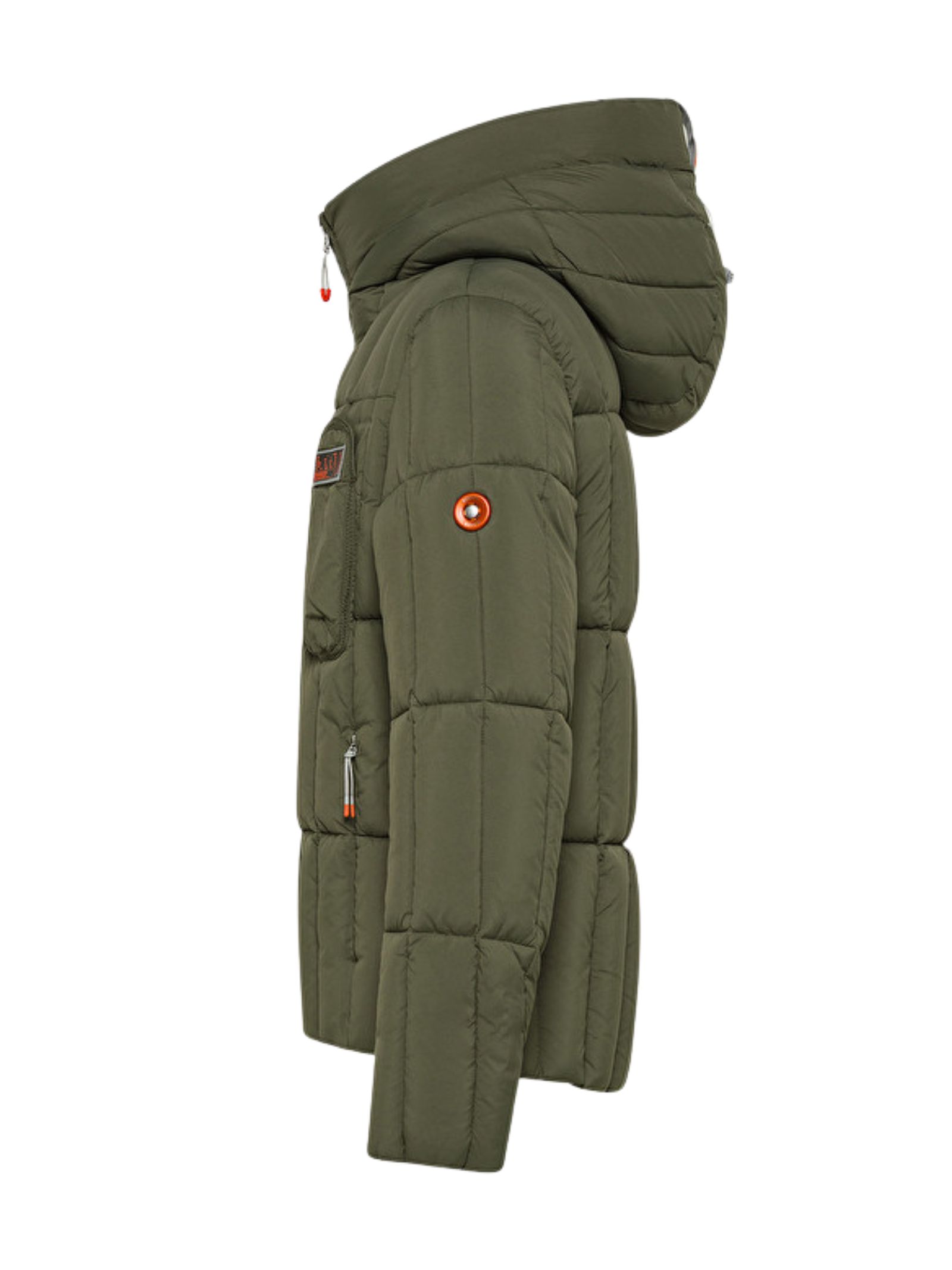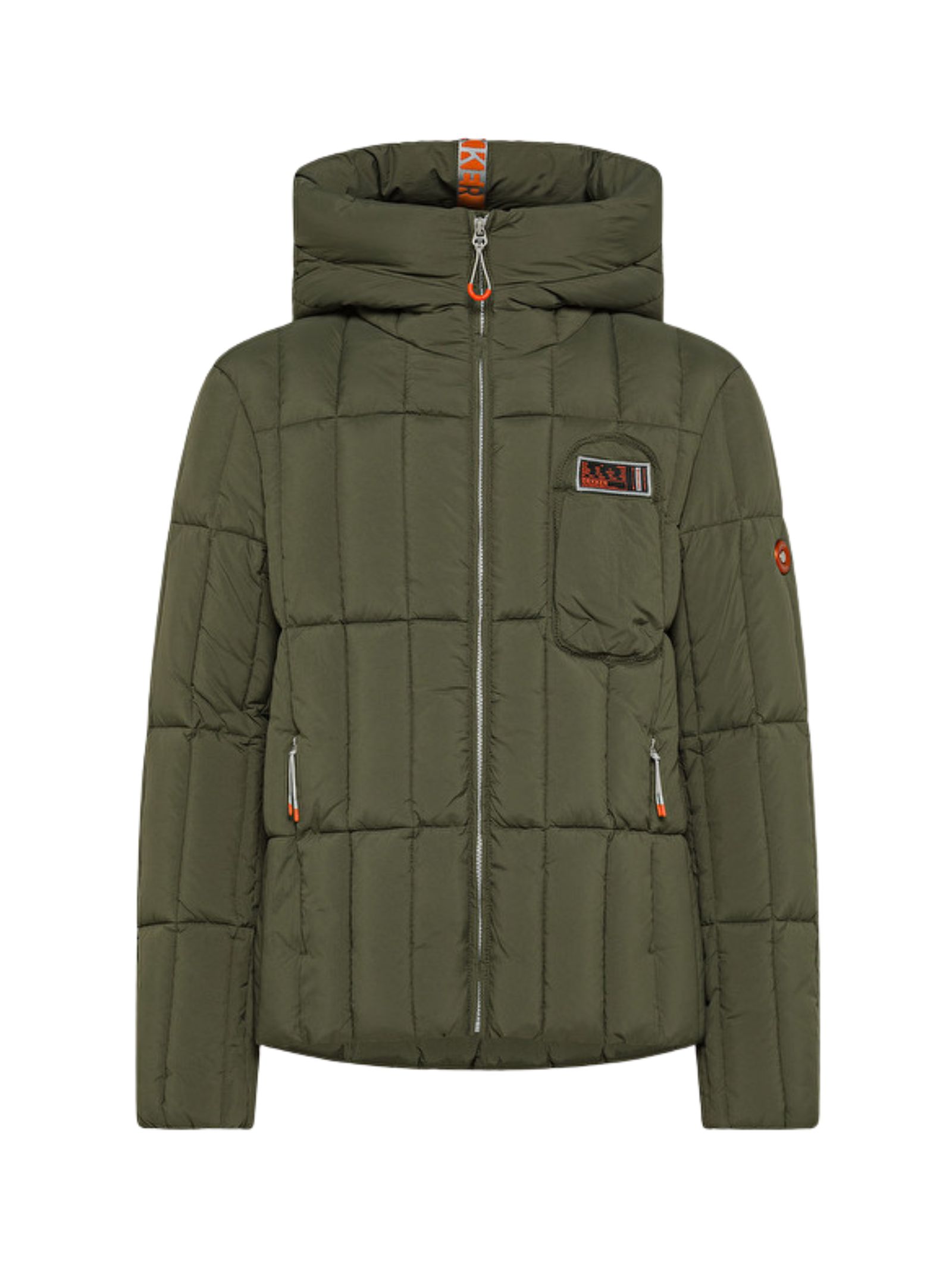 Piumino corto in nylon superleggero 20 denari con finitura semi-opaca e trapuntatura a piccoli lingotti, ispirato allestetica militare navale. Leggero e resistente, offre protezione e comfort grazie allimbottitura Sorona e al trattamento water repellent. Dotato di zip frontale integrale, tasche laterali invisibili, collo a cratere e cappuccio avvolgente, è arricchito da taschino con patch, oblò metallico sulla manica e nastro arancione logato sul cappuccio. Vestibilità regular per un look tecnico, funzionale e urbano.