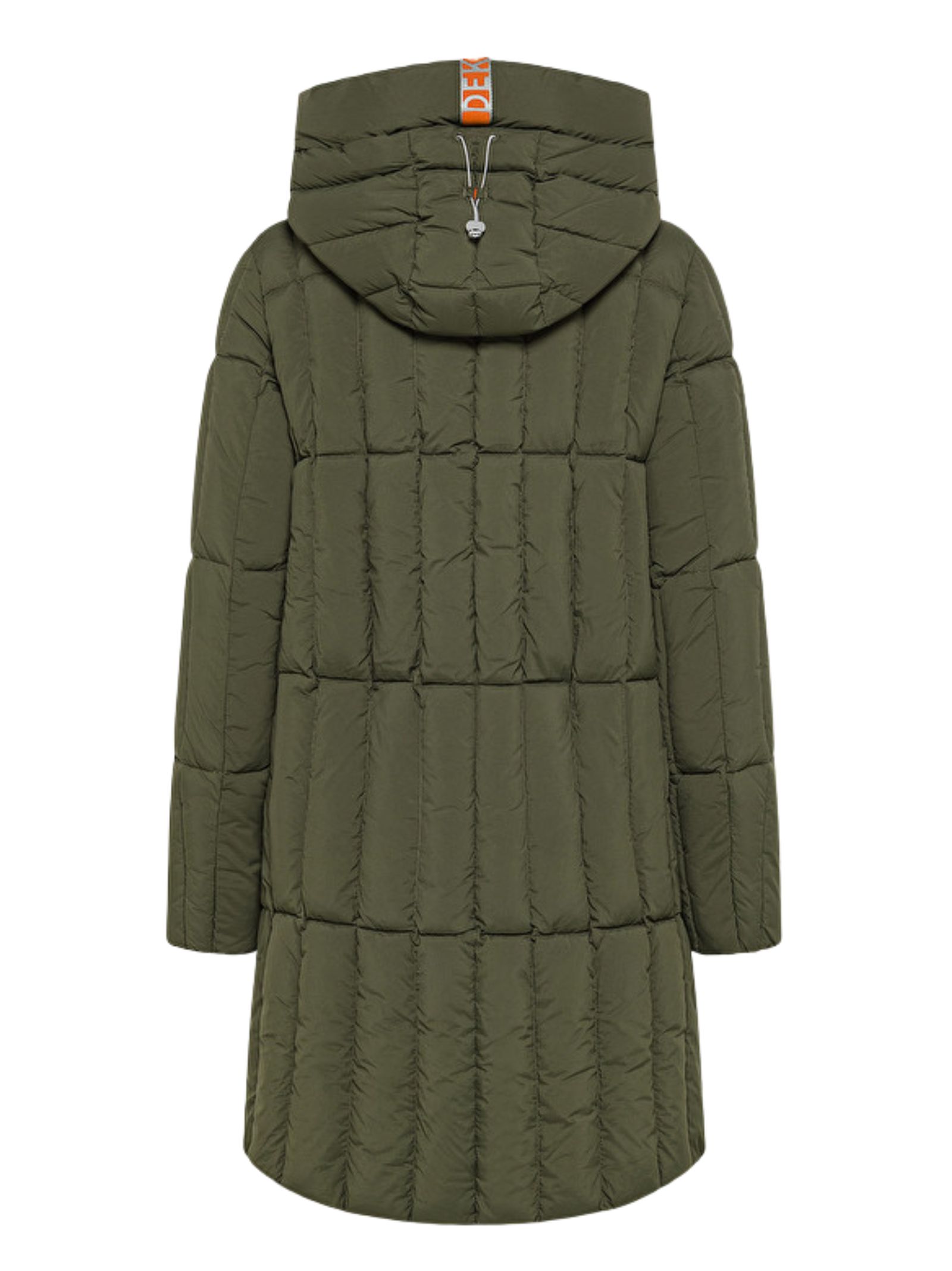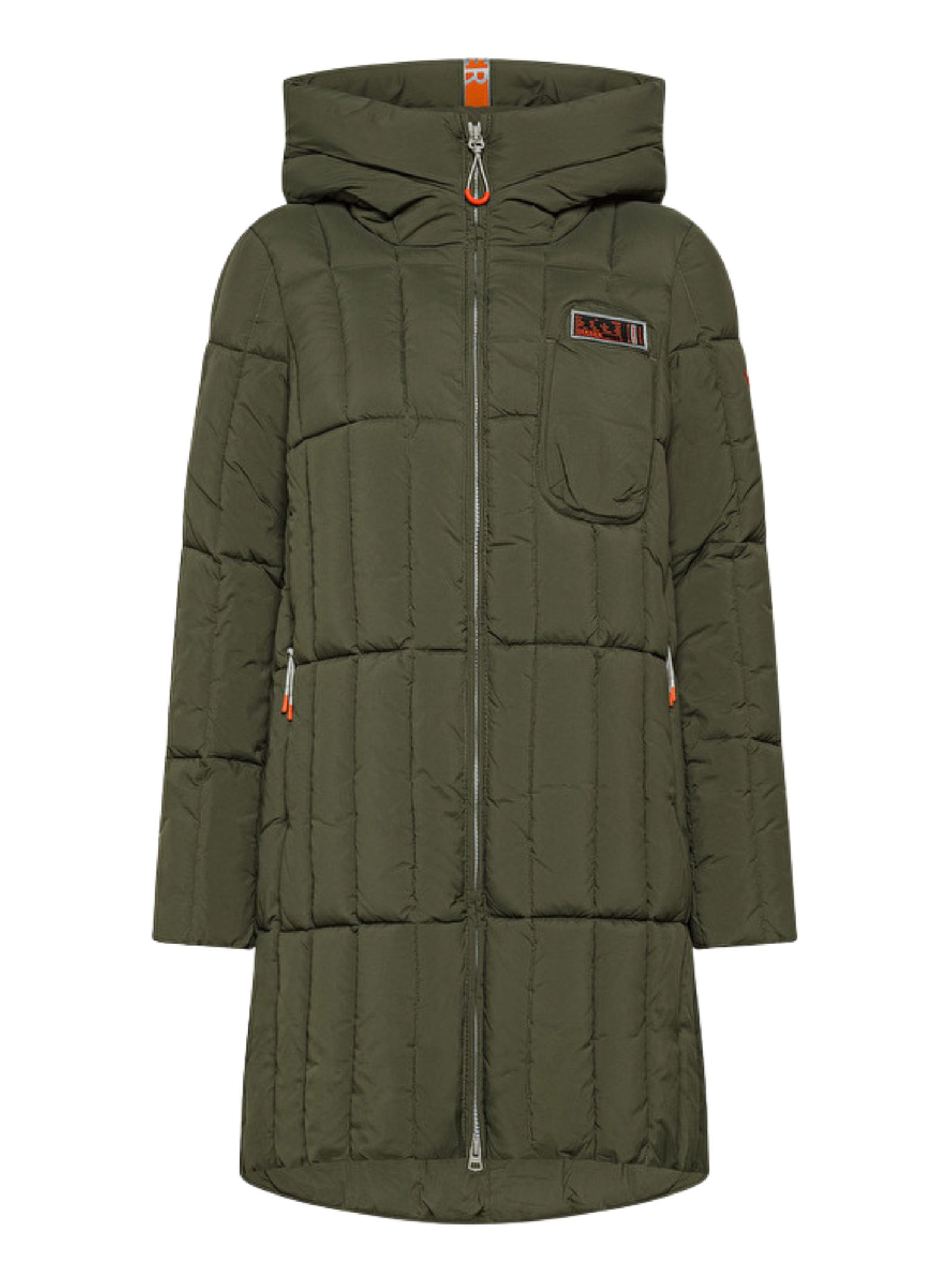 Piumino lungo in nylon superleggero con finitura semi-opaca, trapuntato a piccoli lingotti per un look dinamico e contemporaneo. Limbottitura Sorona e il trattamento water repellent assicurano calore, protezione e leggerezza. Dotato di zip centrale a doppio cursore, tasche laterali con dettaglio arancio e cappuccio avvolgente, è completato da taschino con patch, oblò metallico sul braccio e nastro logato sul cappuccio. Vestibilità regular per un outerwear urbano e versatile.