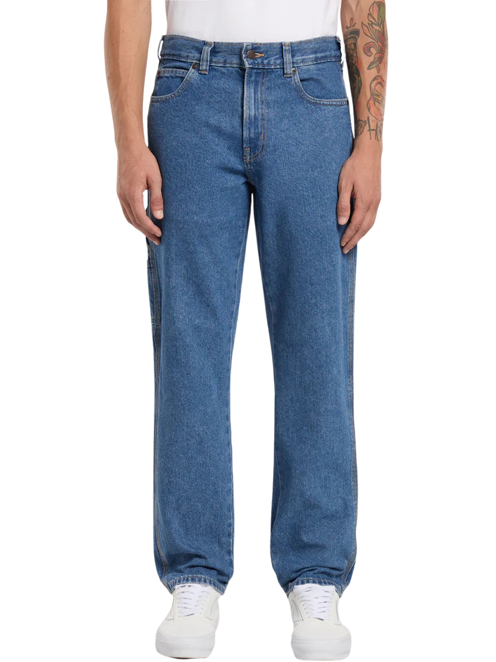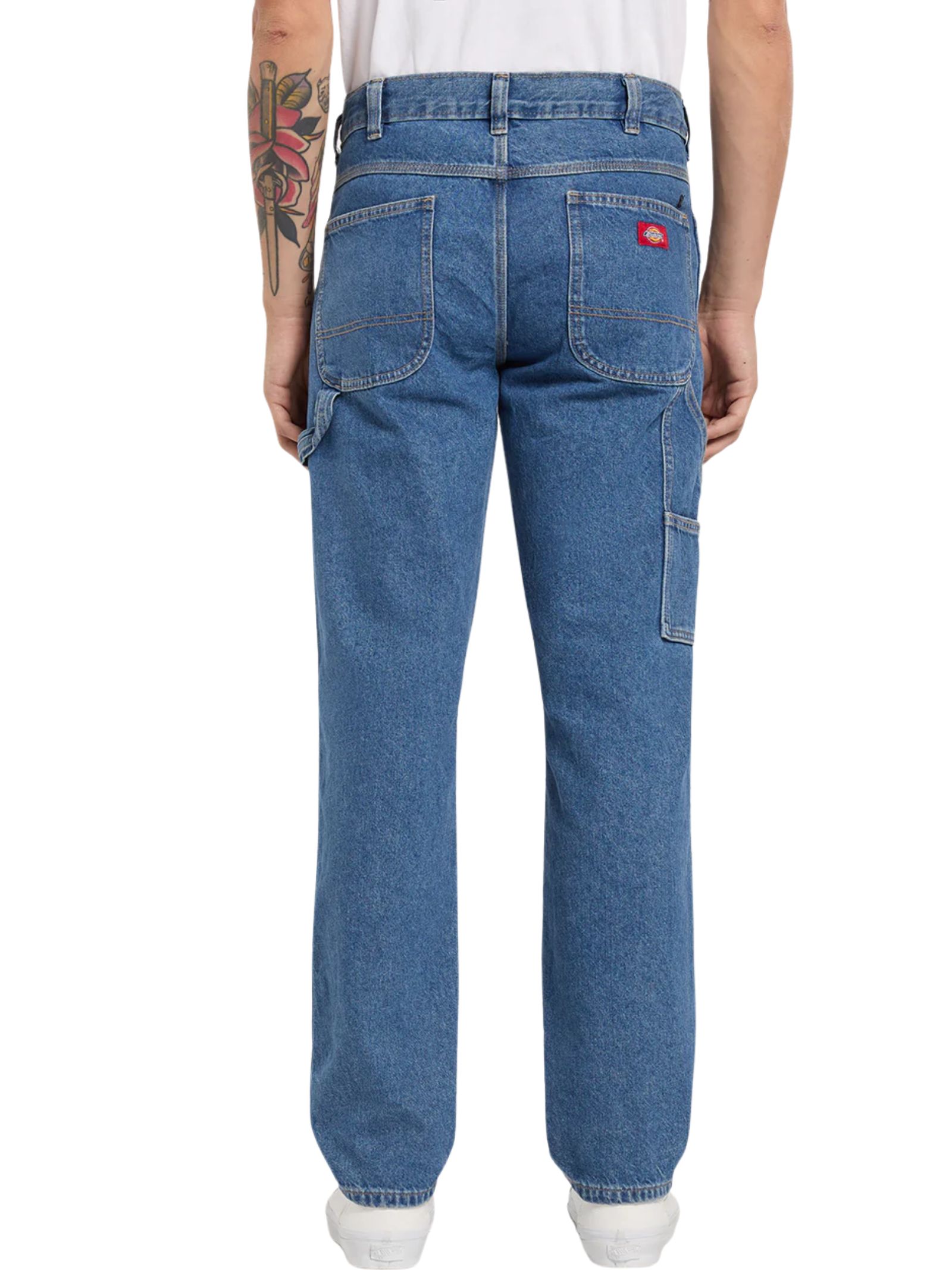 Jeans 998 Carpenter Dickies dal carattere autentico ispirato al workwear, con vestibilità regular e gamba affusolata che dona un look moderno, design classico a cinque tasche arricchito da dettagli funzionali come passante per martello e tasche porta attrezzi, chiusura con bottoni e zip e passanti per cintura, perfetti per uno stile casual e dinamico. Composizione: 100% cotone.