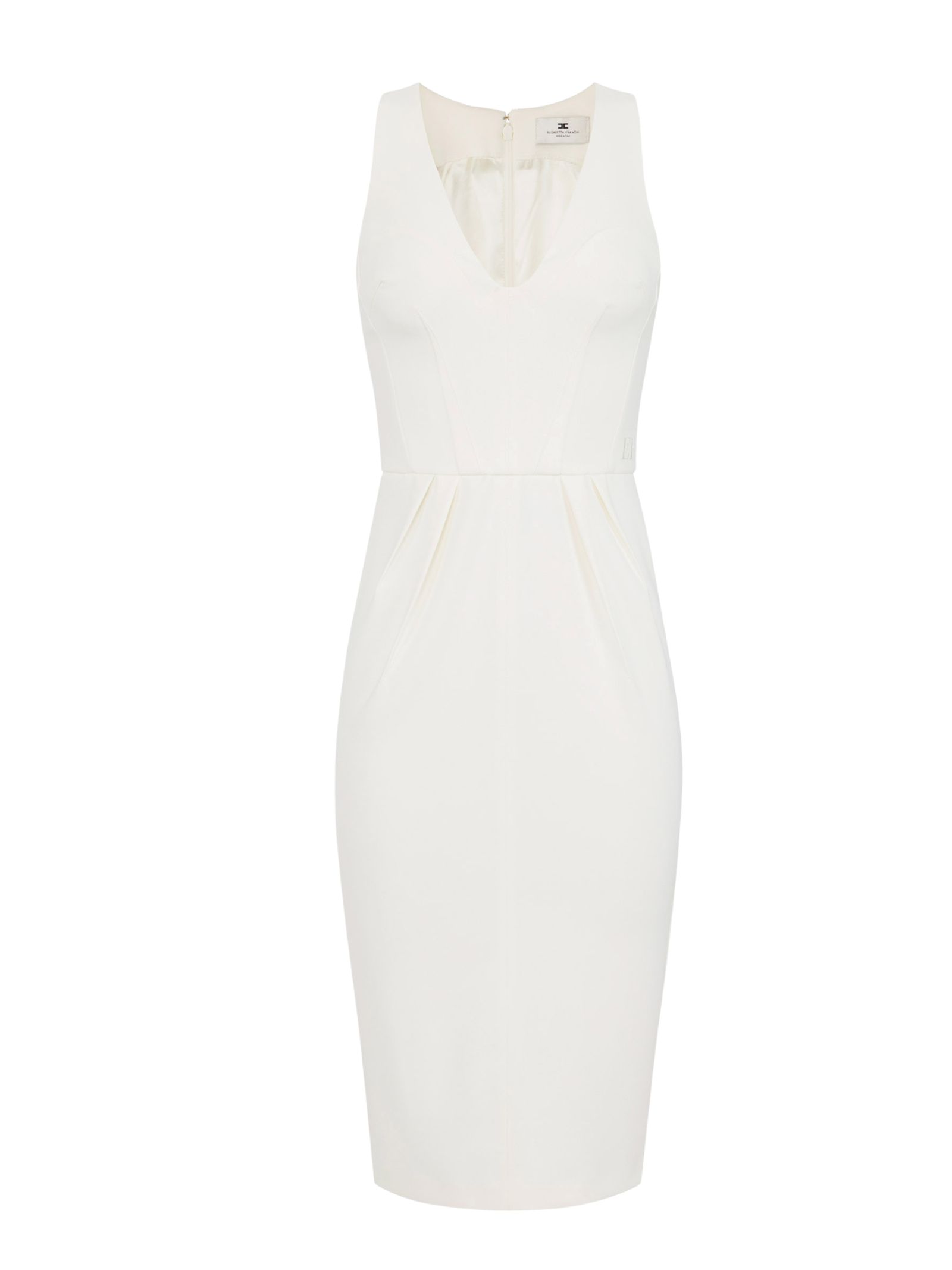 Abito smanicato in crêpe leggero, scollo a V e pinces cucite stile origami; logo ricamato in vita e vestibilità aderente.