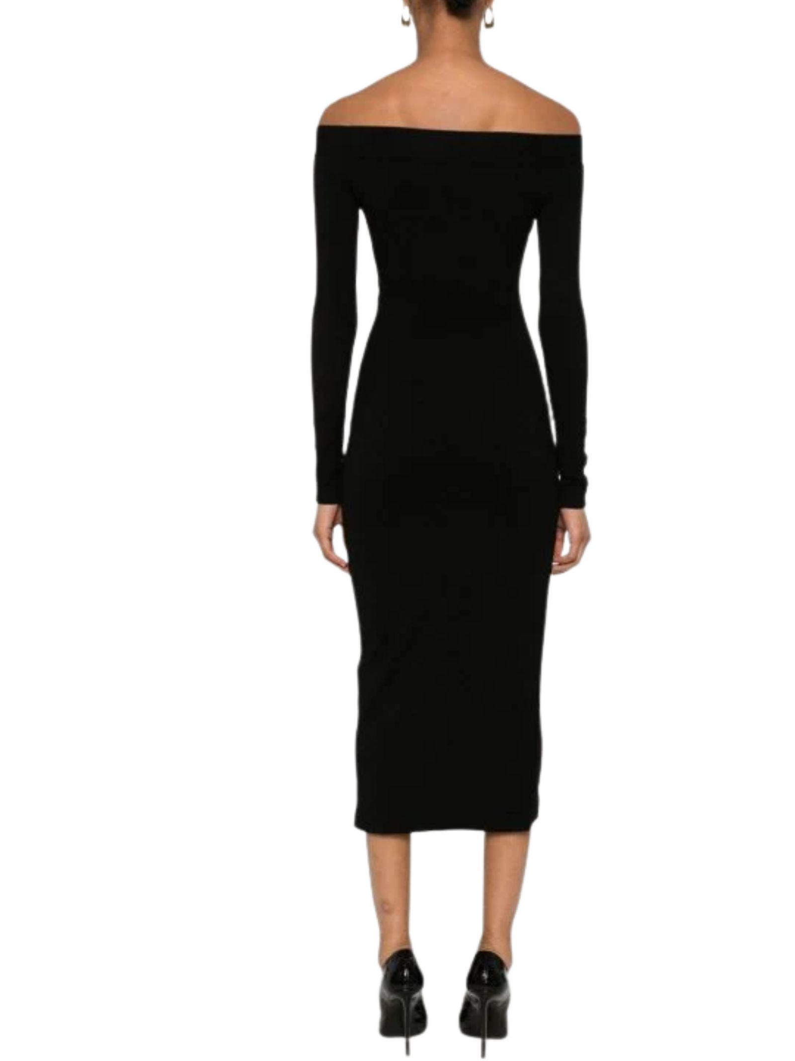 Abito in maglia fine con scollo bardot e spalle scoperte, caratterizzato da linea aderente, maniche lunghe, bottoni decorativi, spacco laterale e orlo dritto, media lunghezza. Composizione: 76% Viscosa, 24% Poliammide.