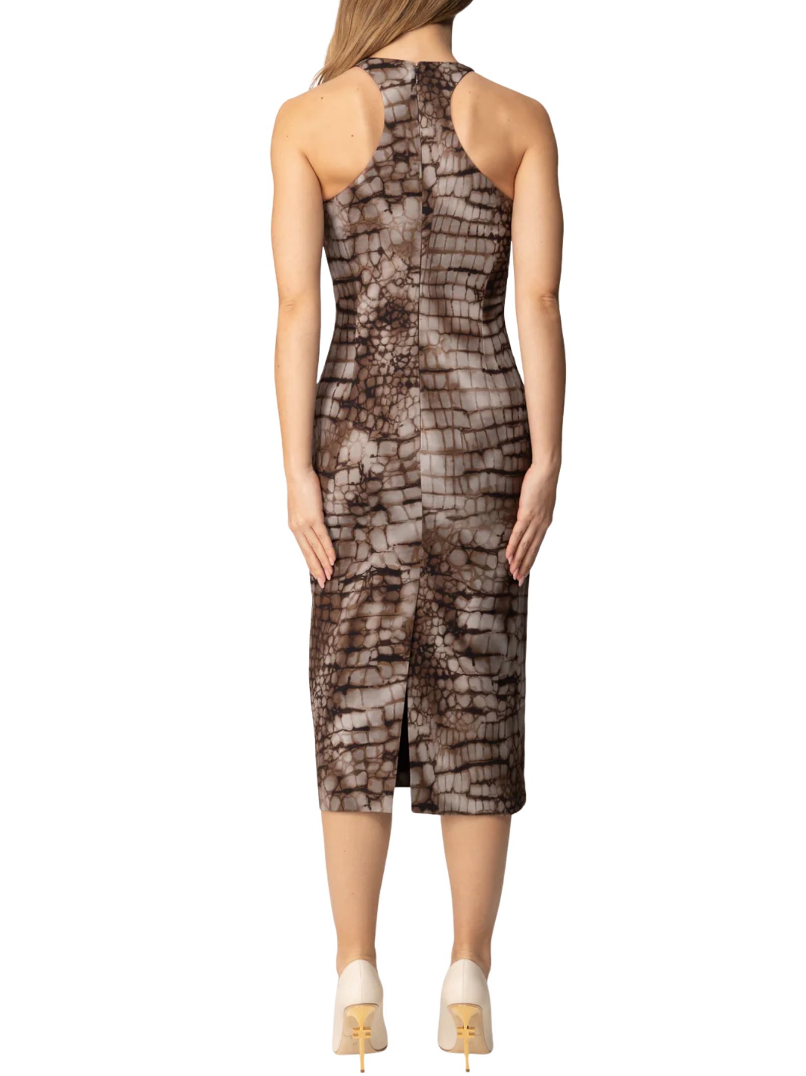 Abito dalla silhouette slim e design midi, con stampa animalier e tessuto in viscosa ed elastan per un comfort e una vestibilità perfetta; scollo all'americana con dettaglio dorato e chiusura con zip sul retro, ideale per eventi eleganti e serate. Composizione 96% viscosa 4% elastan.