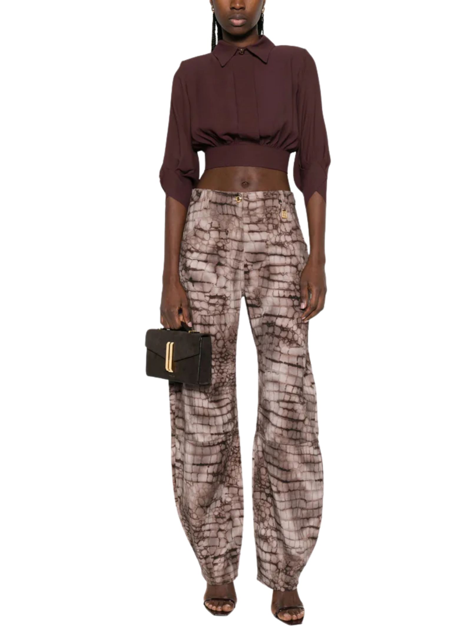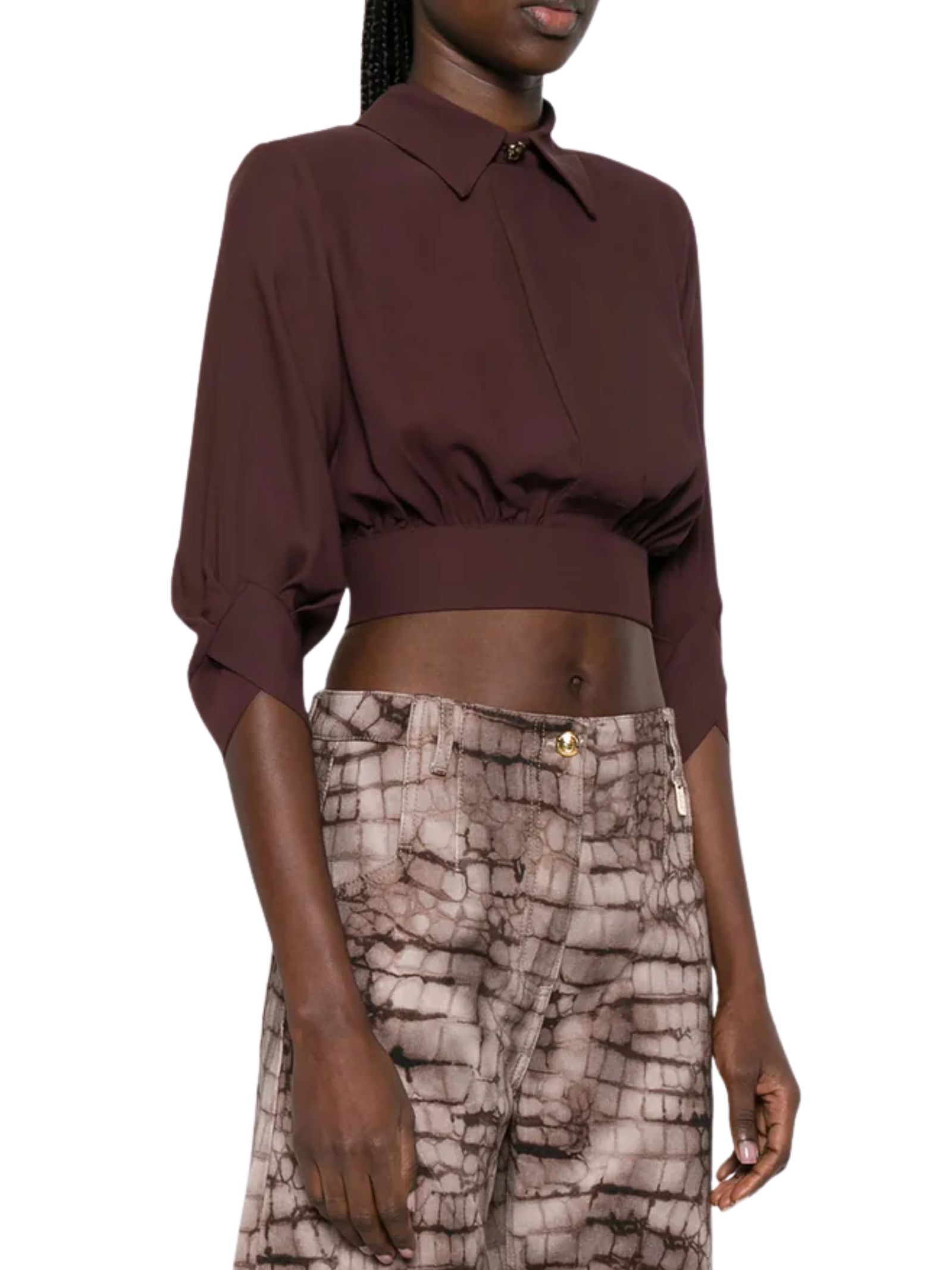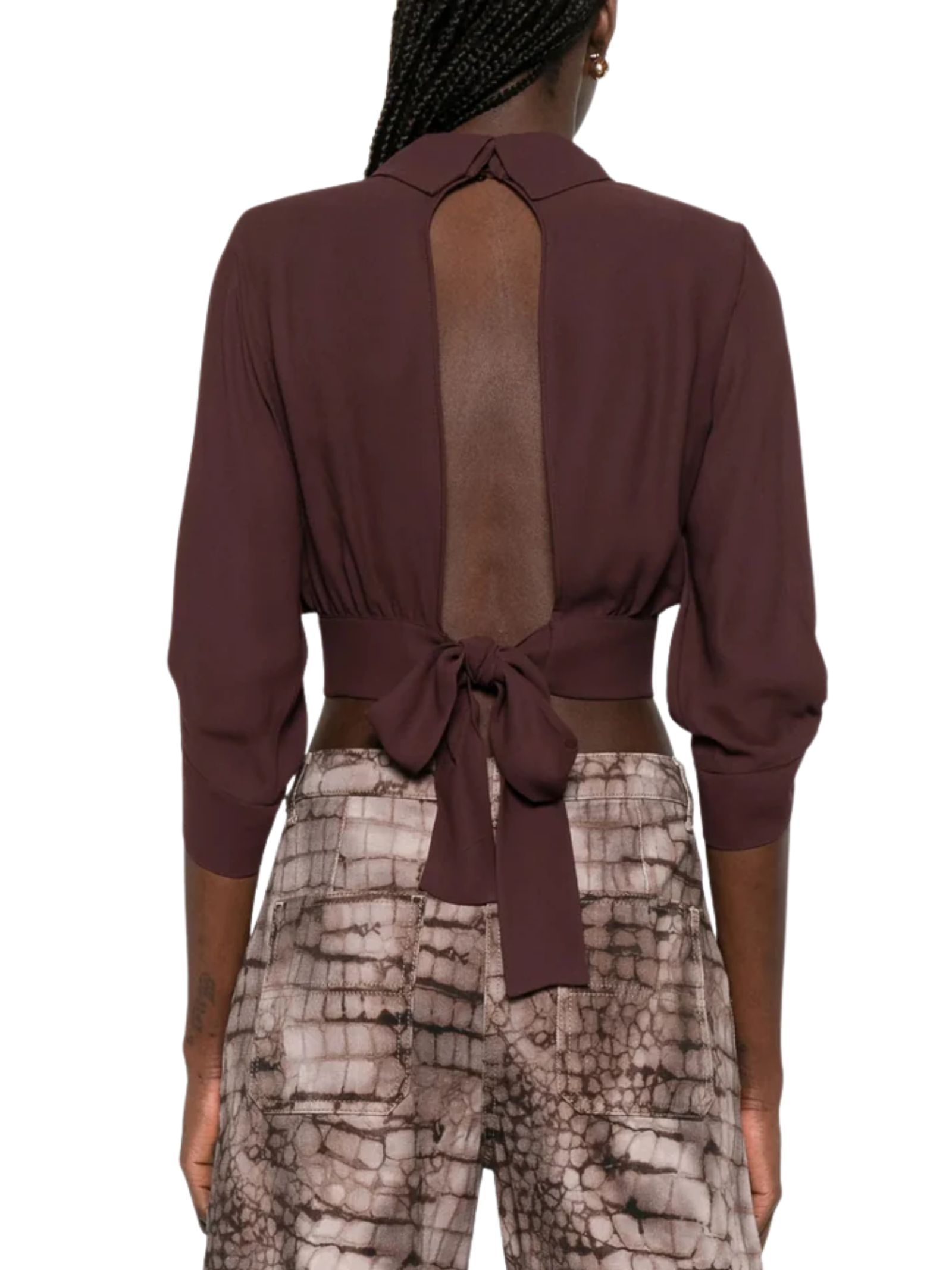 Camicia in georgette dalla vestibilità regular con colletto classico e maniche ¾; polsini a mandorla per una maggiore libertà di movimento, abbottonatura impreziosita da logo ricamato tono su tono; apertura sul retro con fusciacca da annodare, perfetta per un look elegante e femminile. Composizione: 100% viscosa.