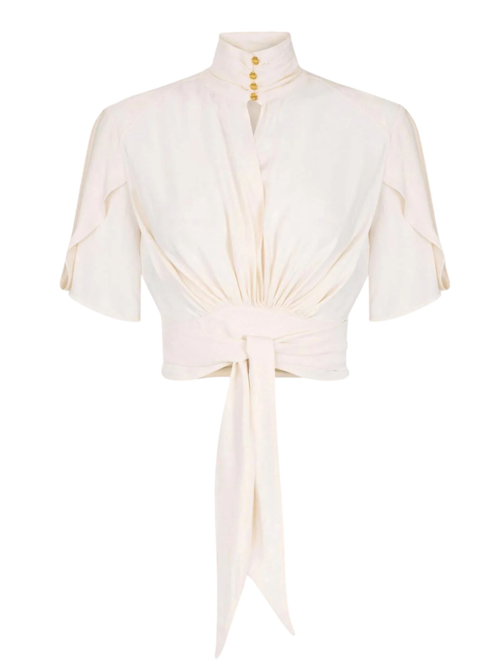 Camicia in georgette dalla vestibilità regular, caratterizzata da volumi fluidi e linee femminili che valorizzano la silhouette senza appesantire il look; maniche corte con volant sulle spalle, drappeggio centrale sul davanti, fusciacca e collo alto impreziosito da bottoncini in metallo dorato con logo. Composizione: 100% viscosa.