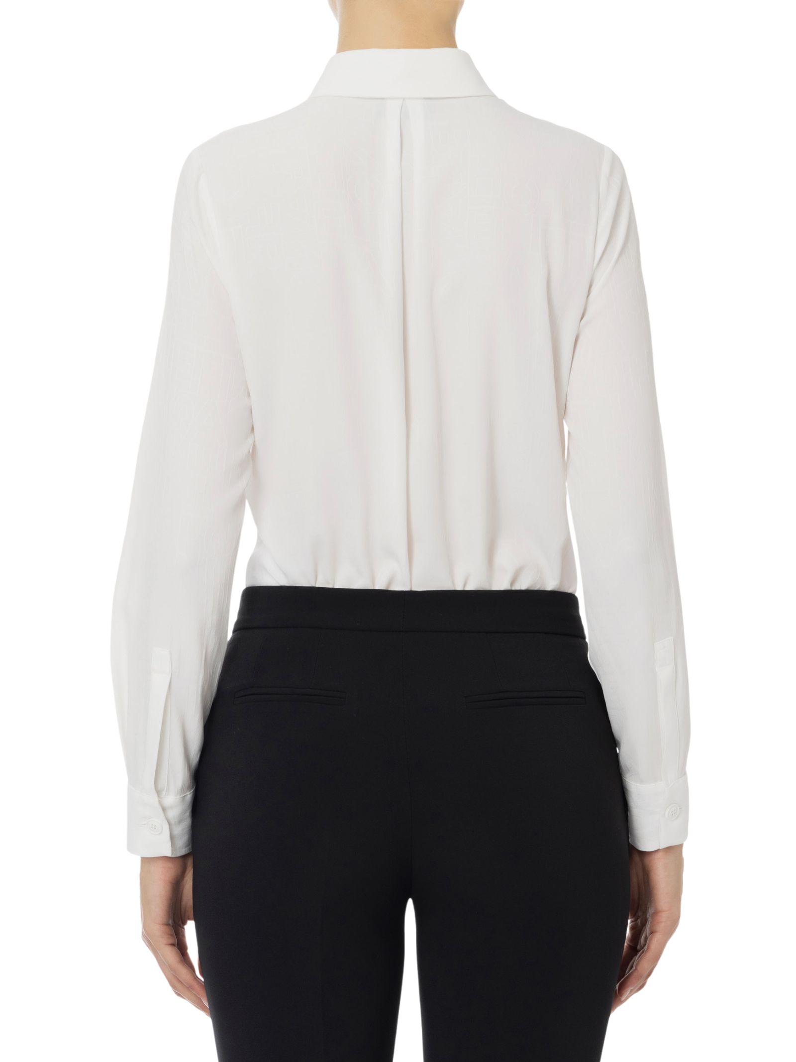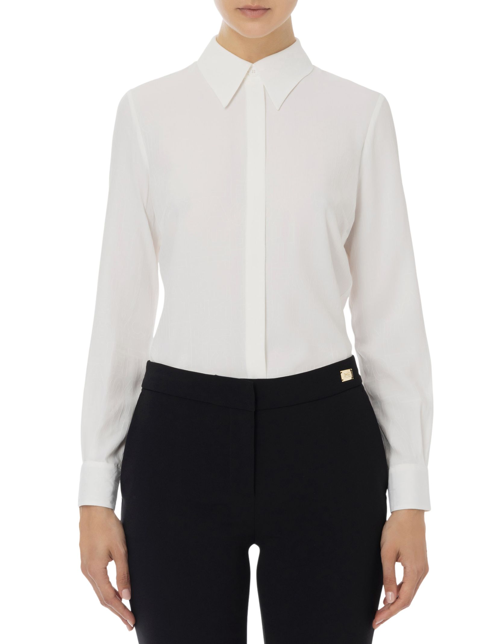 Camicia in georgette jacquard lettering con maniche lunghe, caratterizzata da chiusura con bottoni nascosti per un effetto pulito ed essenziale.