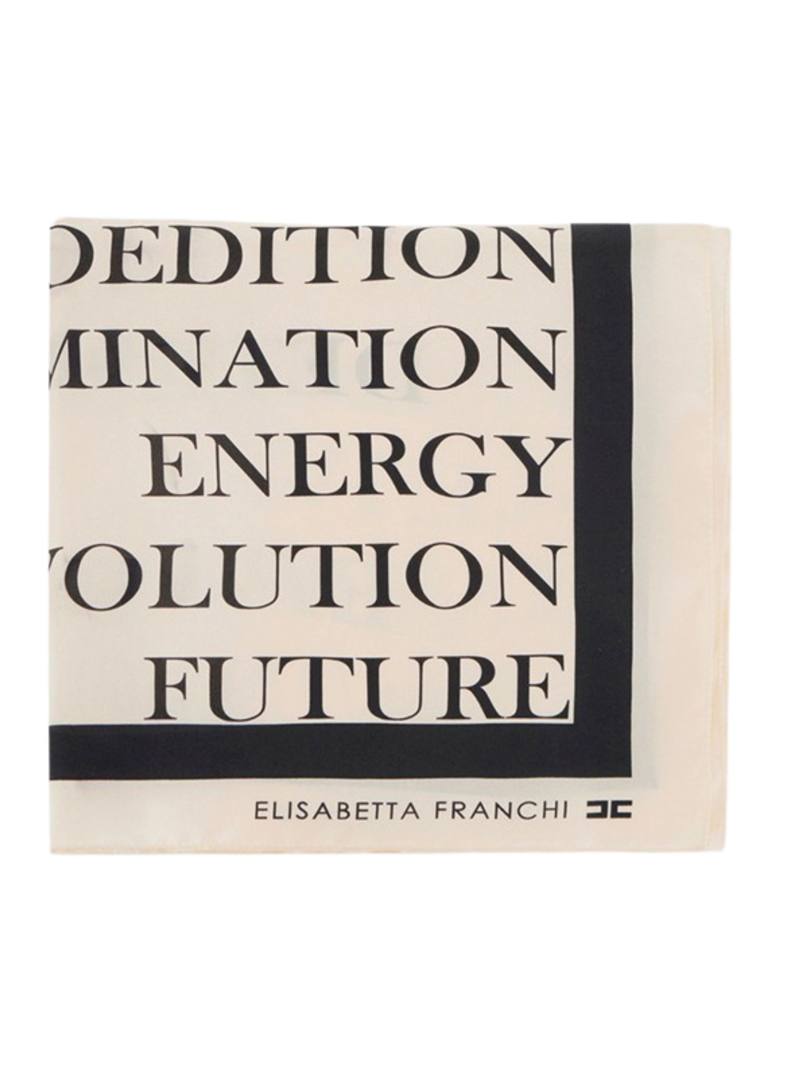 Foulard quadrato in seta con stampa lettering ispirazionale a contrasto. Dimensioni: 50 x 50 cm. Composizione: 100% seta.