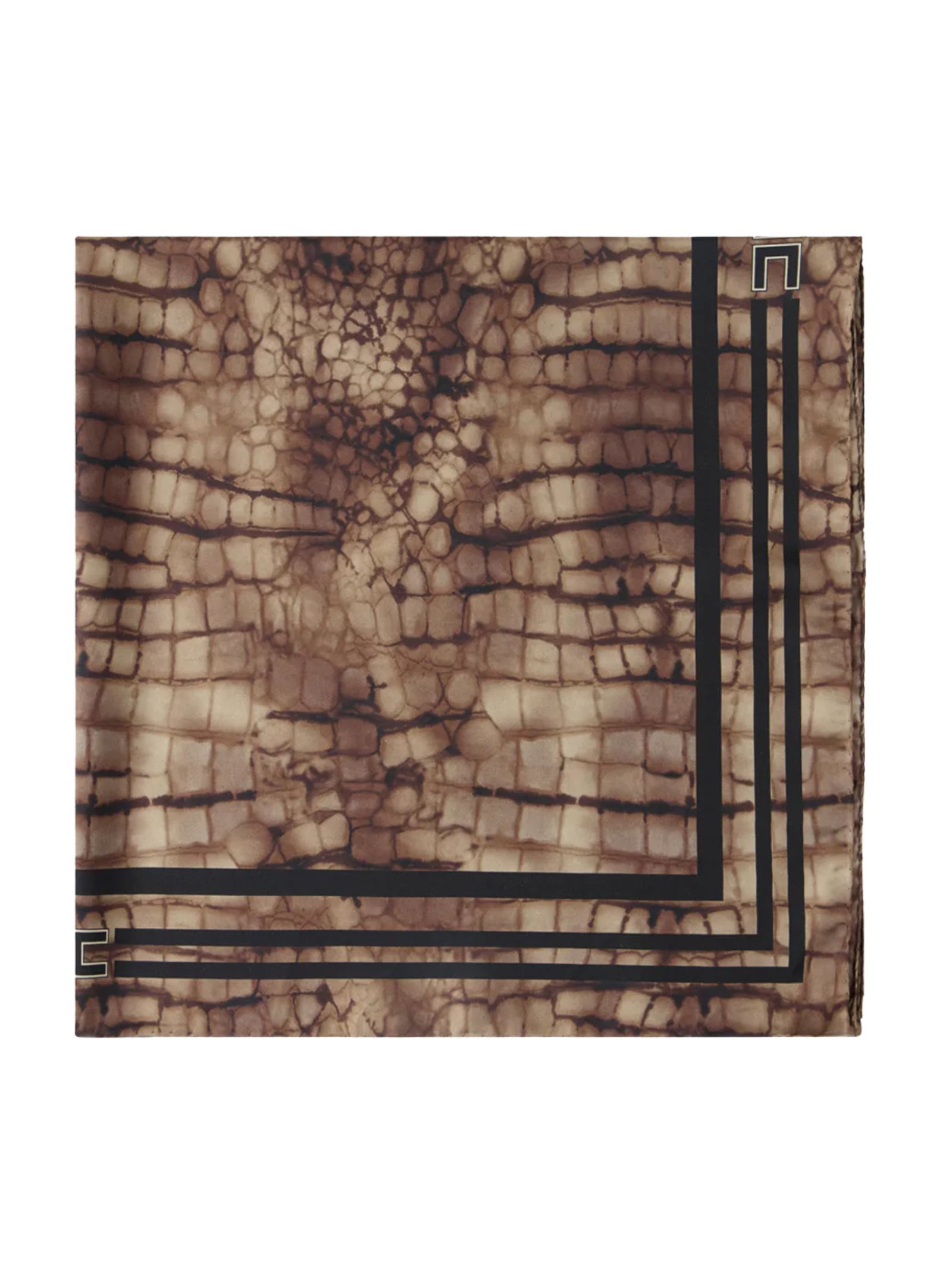Foulard quadrato in twill di seta dalla stampa all-over a tema alligatore; dimensioni 90 x 90 cm.Composizione 100% seta.