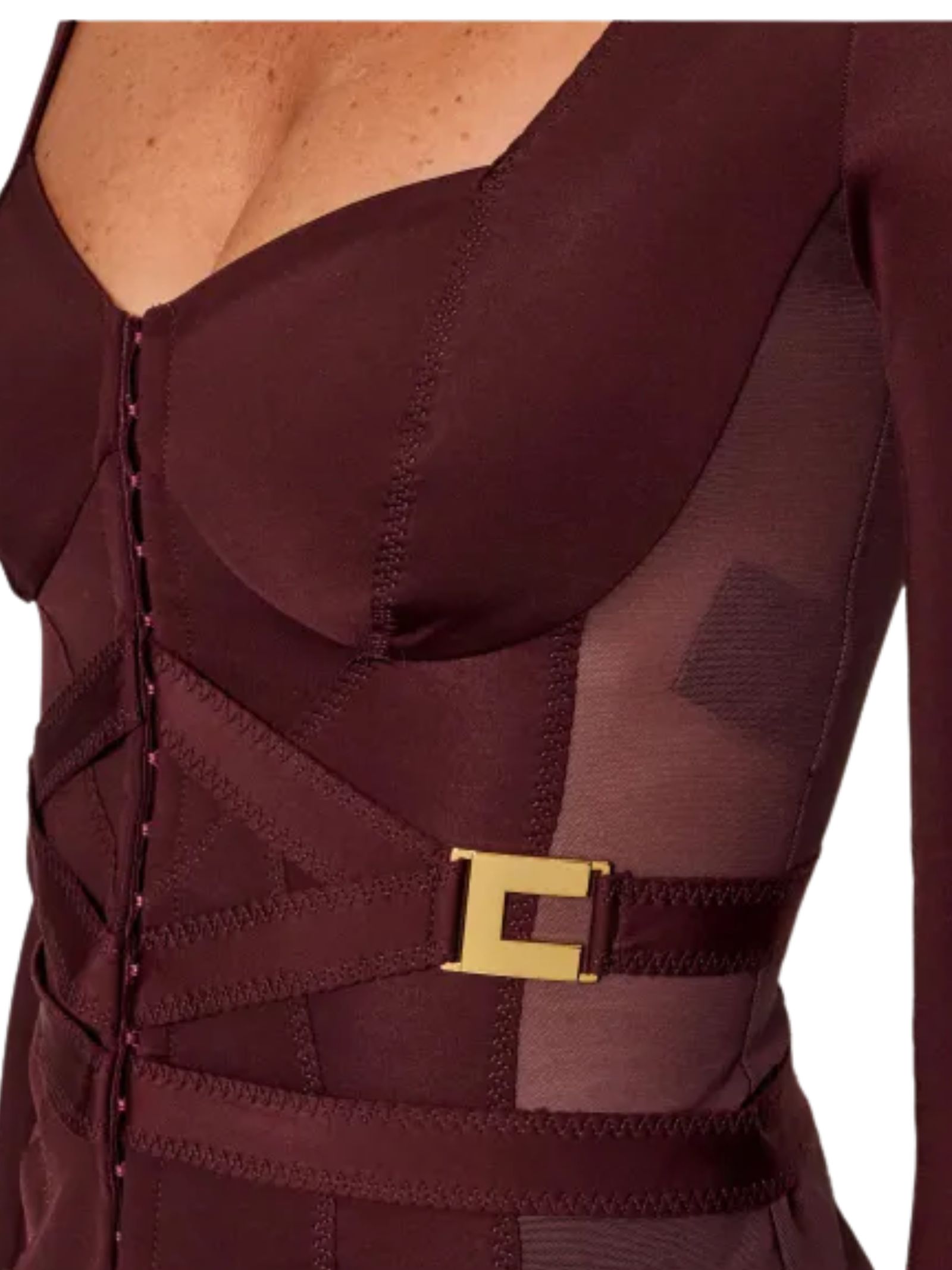 Giacca bustier in tessuto bi-elastic dalla vestibilità slim, definita da impunture a zig-zag e tagli sagomati che valorizzano la silhouette, con inserti in tulle, chiusura con gancetti, logo gioiello in metallo dorato e fodera interna; perfetta per serate eleganti, occasioni glamour o per un look da ufficio ricercato. Composizione: 75% Poliammide, 25% Elastane.