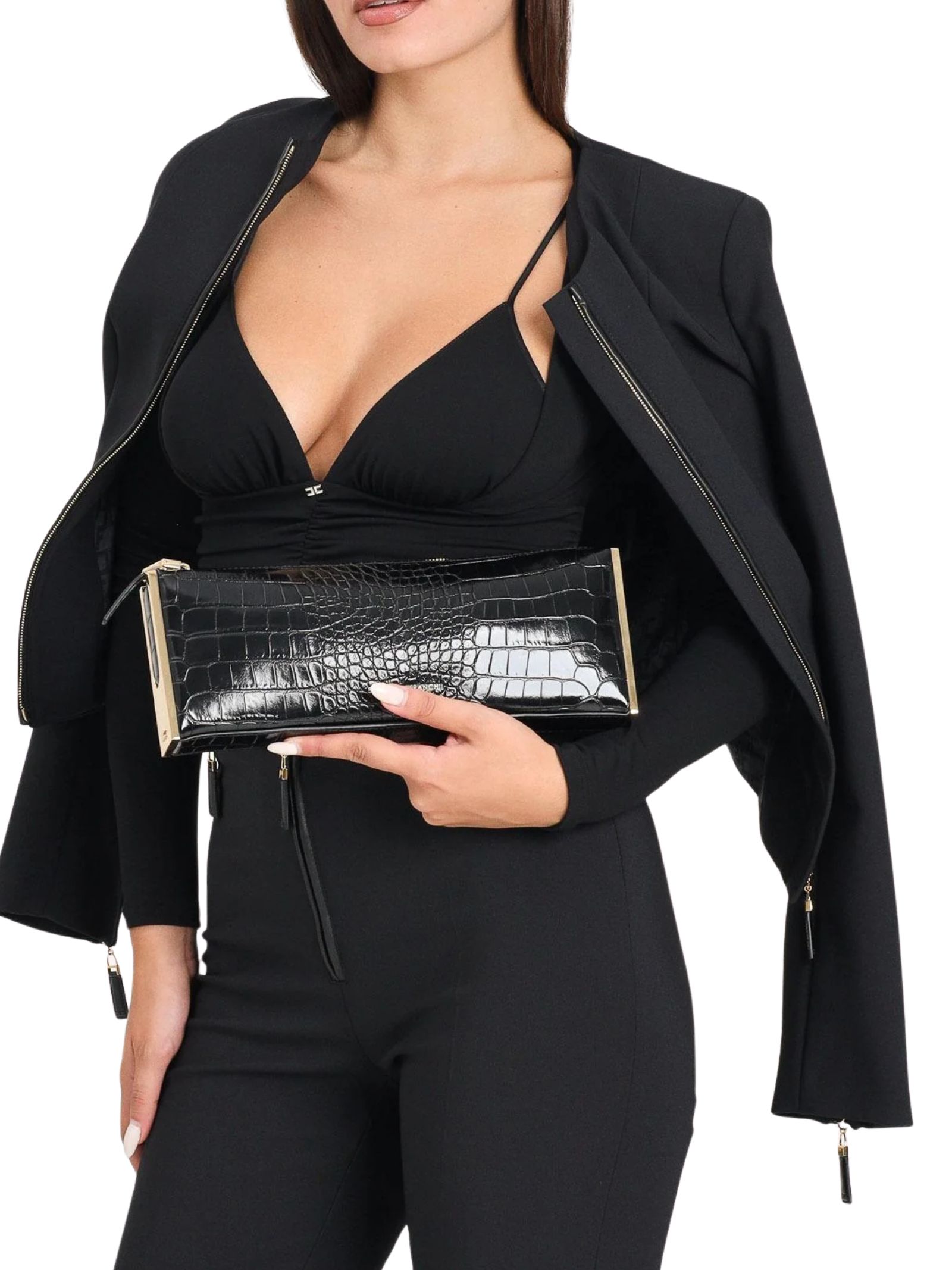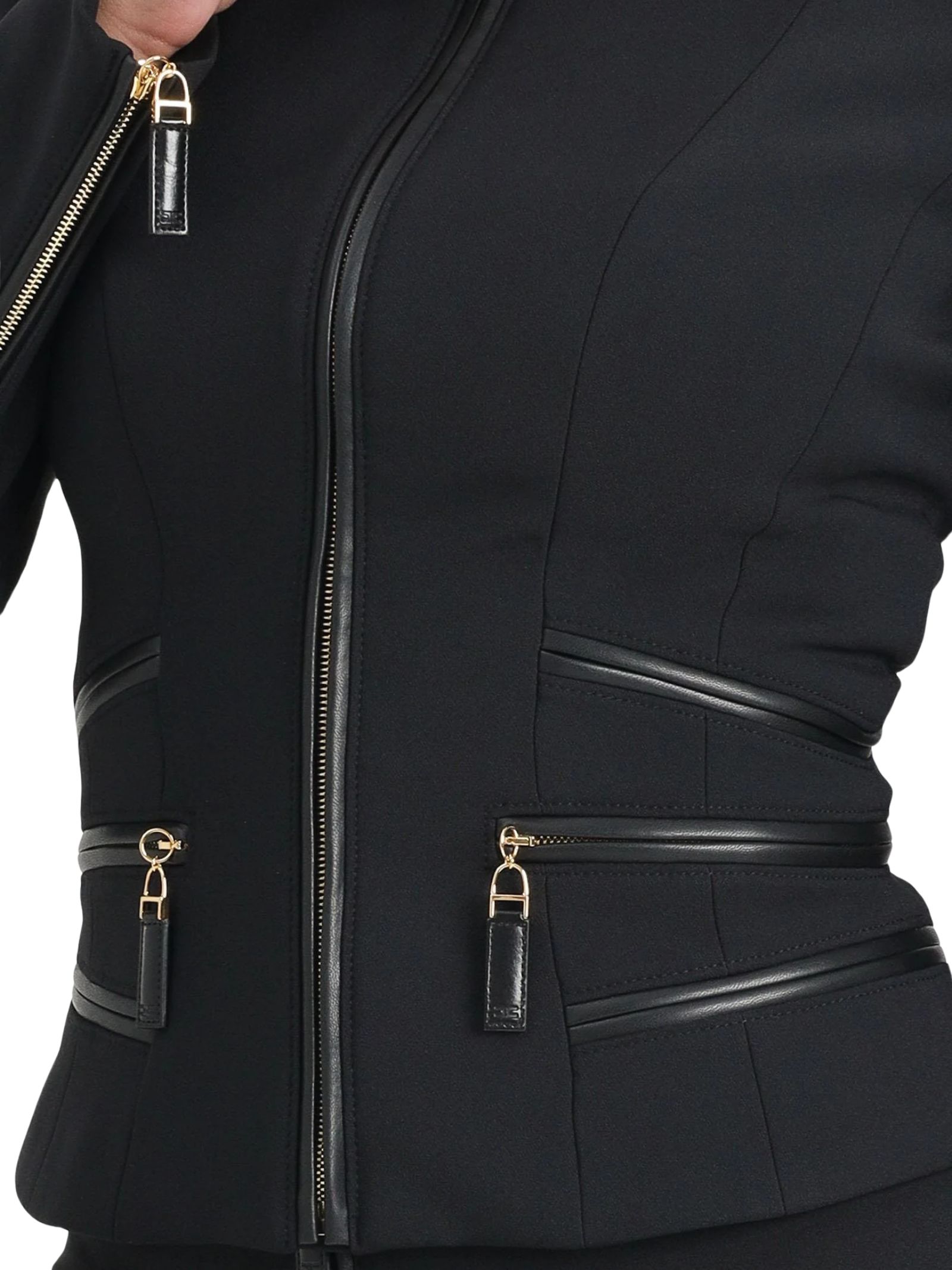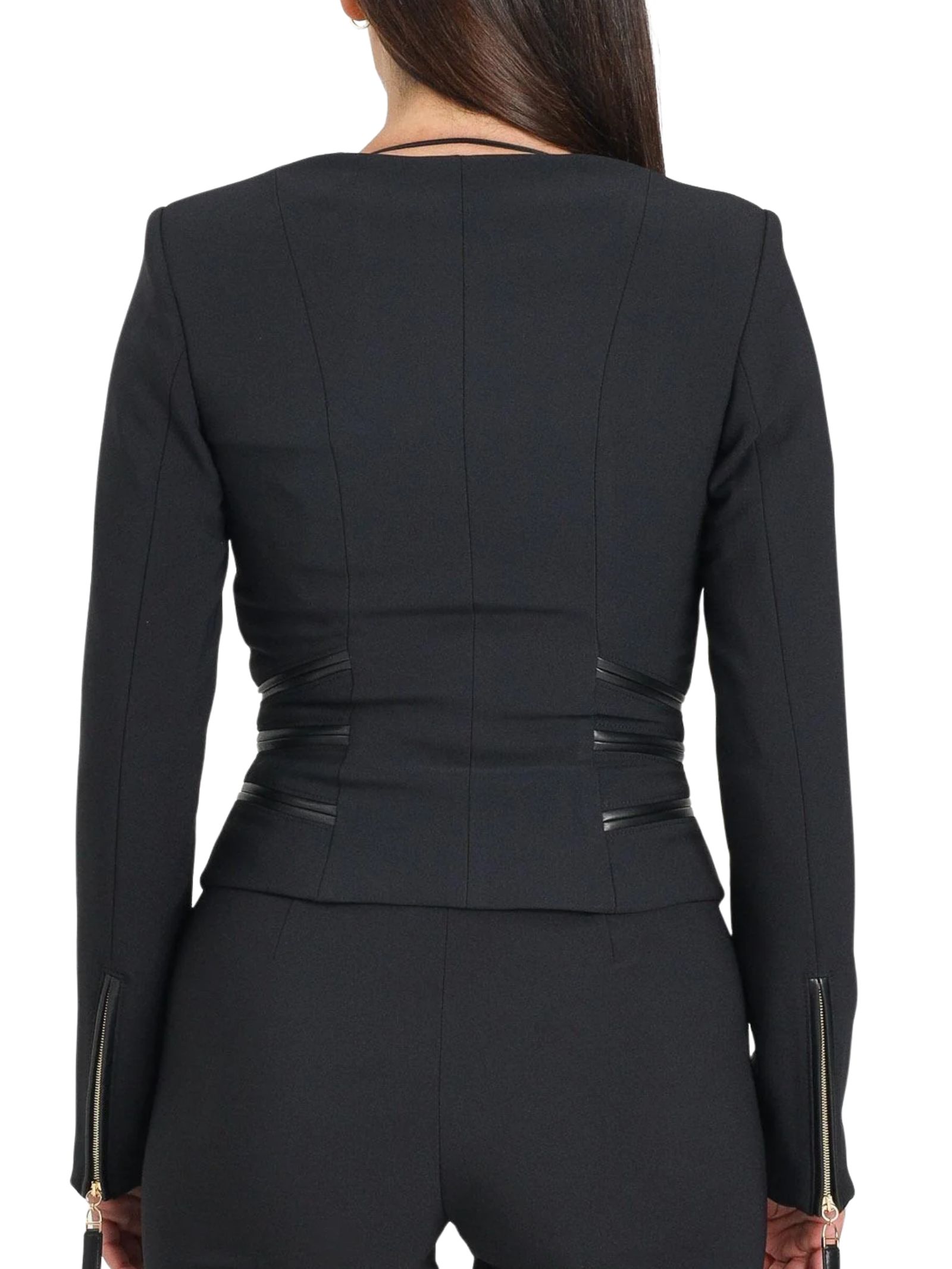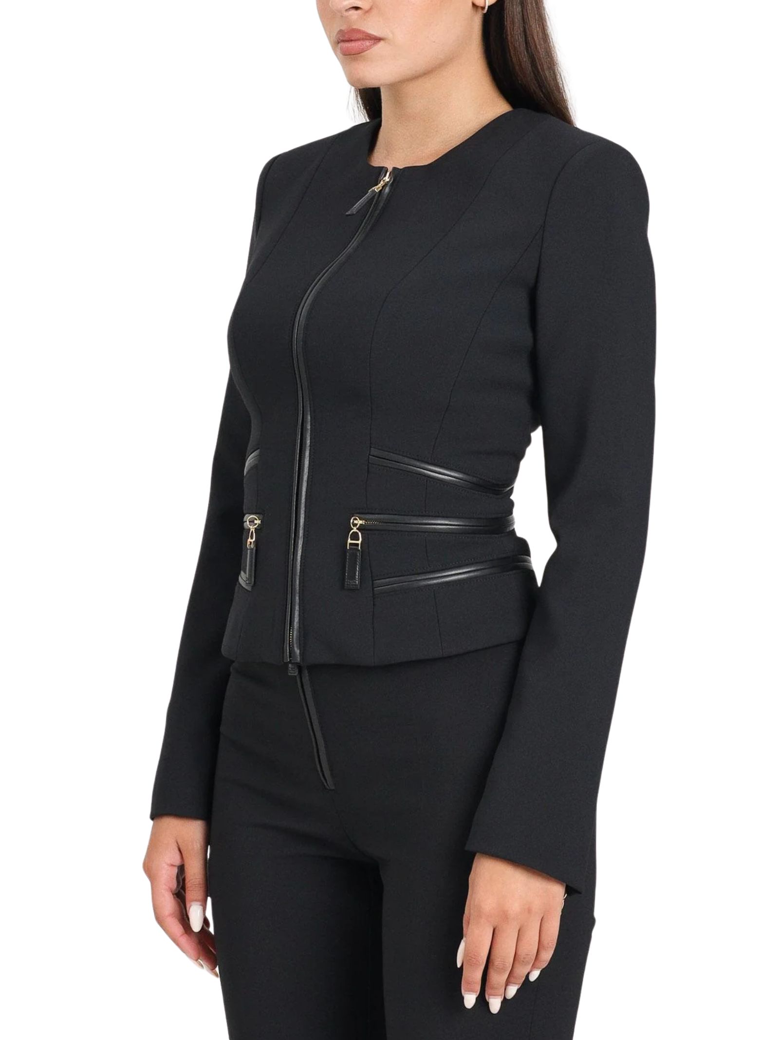Giacca nera Elisabetta Franchi in doppio crêpe, con girocollo e maniche lunghe. Presenta elementi decorativi come le zip e i filetti in tono che accentuano il punto vita. Vestibilità slim. Composizione 96%PL, 4%EA